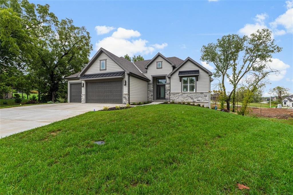 $10,000 PRICE IMPROVEMENT!!!! COMPLETED HOME! New Mark's fantastic Timberland Reverse plan! This one is a showstopper! 4 bedrooms, 3 full baths, 3 car garage FULL of upgrades- Main level features tall ceilings, stunning wall of windows, fireplace, built in cabinetry, wood flooring, oversized quartz kitchen island, breakfast room with vaulted ceiling, upgraded trim throughout! Bright and light!!! Owner's suite will wow you with beautiful spa like bath, laundry off master closet and hallway. 2nd bedroom on main level perfect for home office. Lower level walks out to great backyard with trees! 2 additional bedrooms and oversized rec room with full bar for entertaining. DO not miss this one in the beautiful subdivision of Overland Ridge. Incredible location, close to highway yet tucked away. COMPLETED HOME! Taxes and sq footage estimated and should be verified by Buyer's agent.