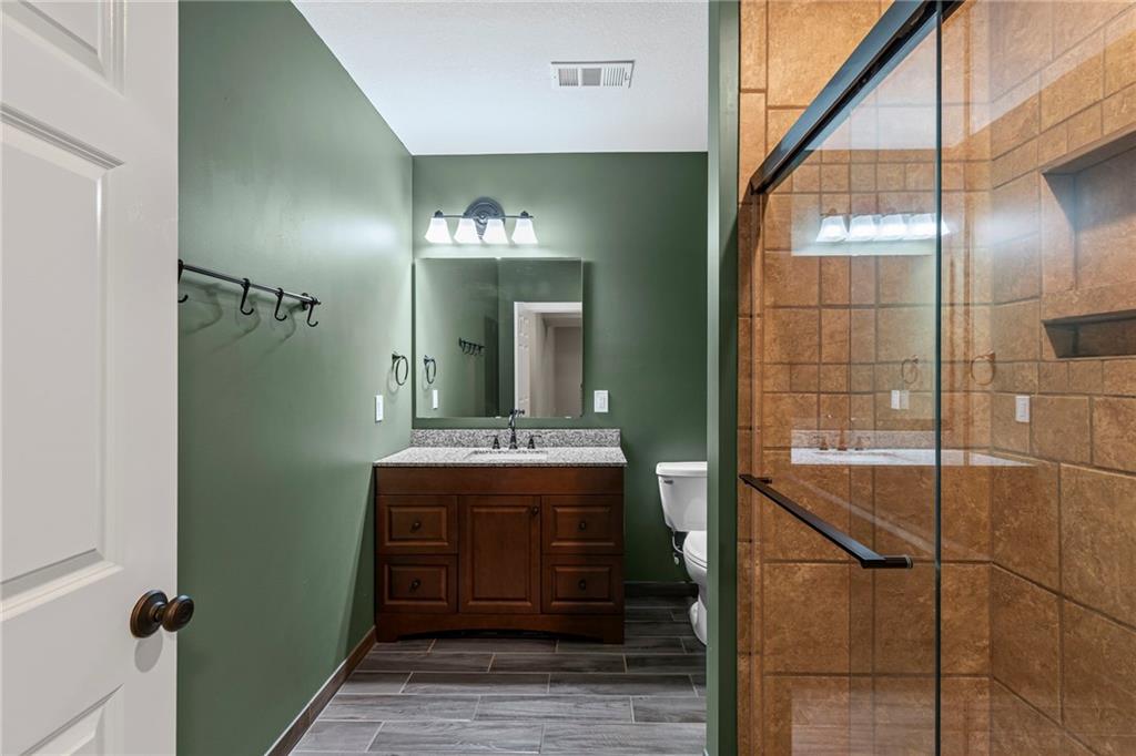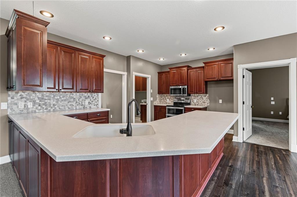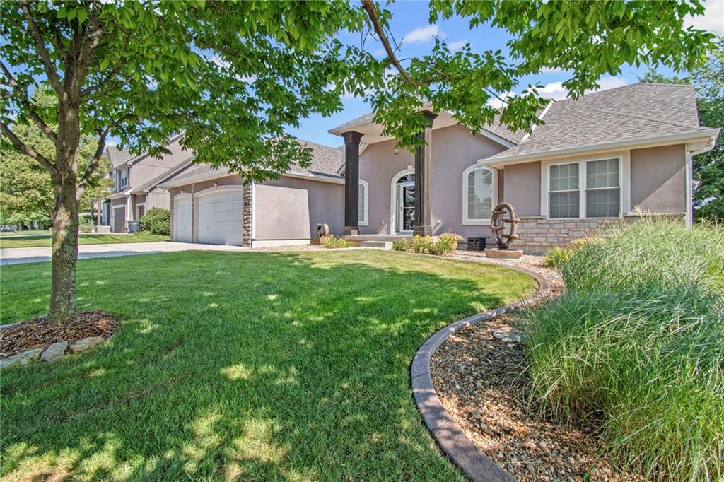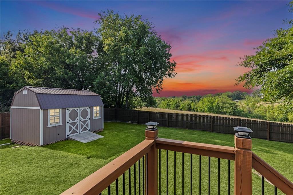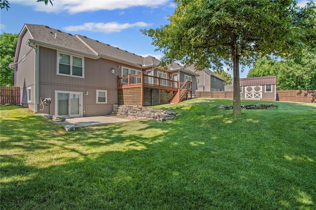 This beautifully maintained 5-bedroom, 3.5-bath home is nestled in the highly sought-after Woodbine neighborhood, within the award-winning Blue Springs School District. Offering a rare blend of privacy and luxury, this property backs to a serene 20-acre lot—giving you peaceful views and room to breathe. Step outside to enjoy the lush, professionally landscaped yard, complete with two tranquil water features, concrete landscape curbing, stone retaining walls, and an in-ground sprinkler system to keep it picture-perfect. Relax or entertain on the composite deck, or tinker in the 10’x16’ lofted shed. The yard is fully enclosed with a privacy fence for peace of mind. Inside, you’ll find elegant plantation shutters, solid wood doors, and custom closets throughout. The spacious primary suite offers private deck access, a vaulted ceiling, a jetted tub, tiled shower, and a custom walk-in closet. Recent upgrades include a new roof and 5” gutters (2024) and a high-efficiency HVAC system (2022). The oversized 3-car garage features a rear pedestrian door, slop sink, gas heater, and a built-in workbench with storage cabinets. The finished walkout basement adds even more living space with an office, two bedrooms, a full bath, a half bath, and ample storage. This home offers the perfect combination of comfort, quality, and location. Don’t miss your chance to make it yours—schedule your private showing today!