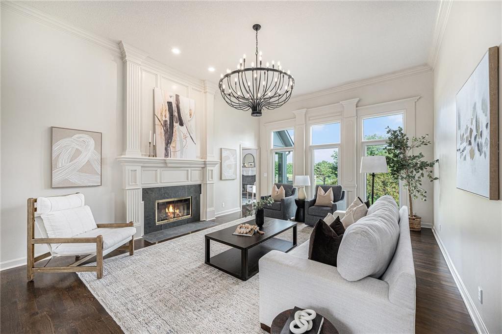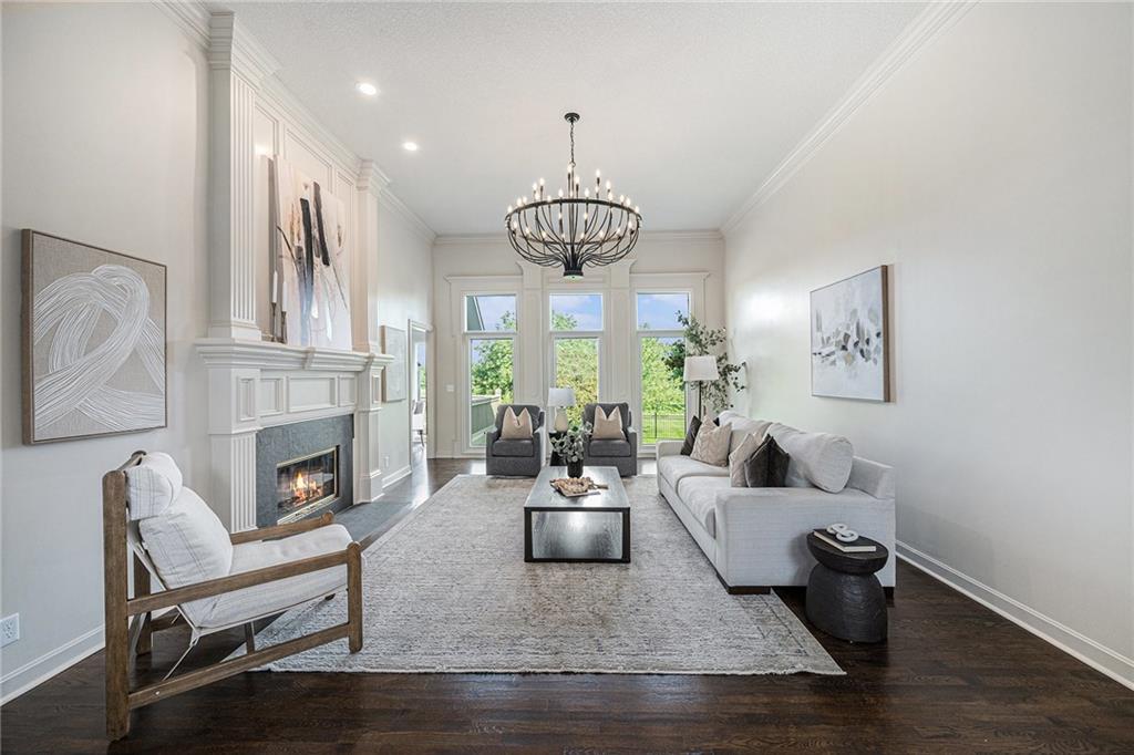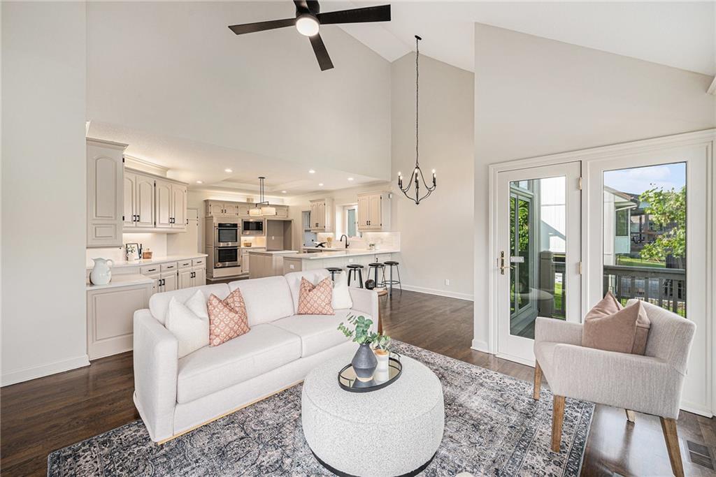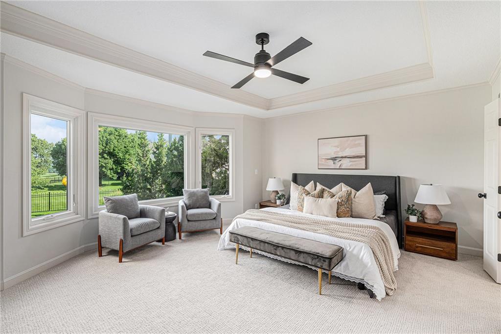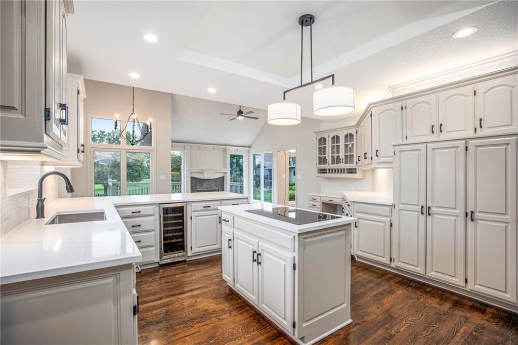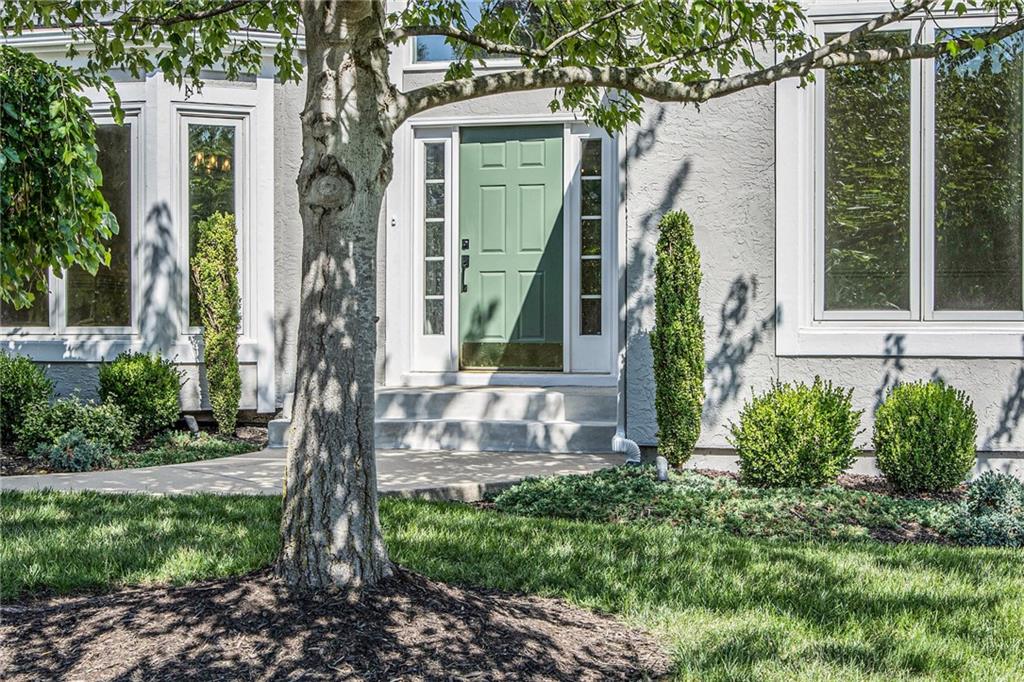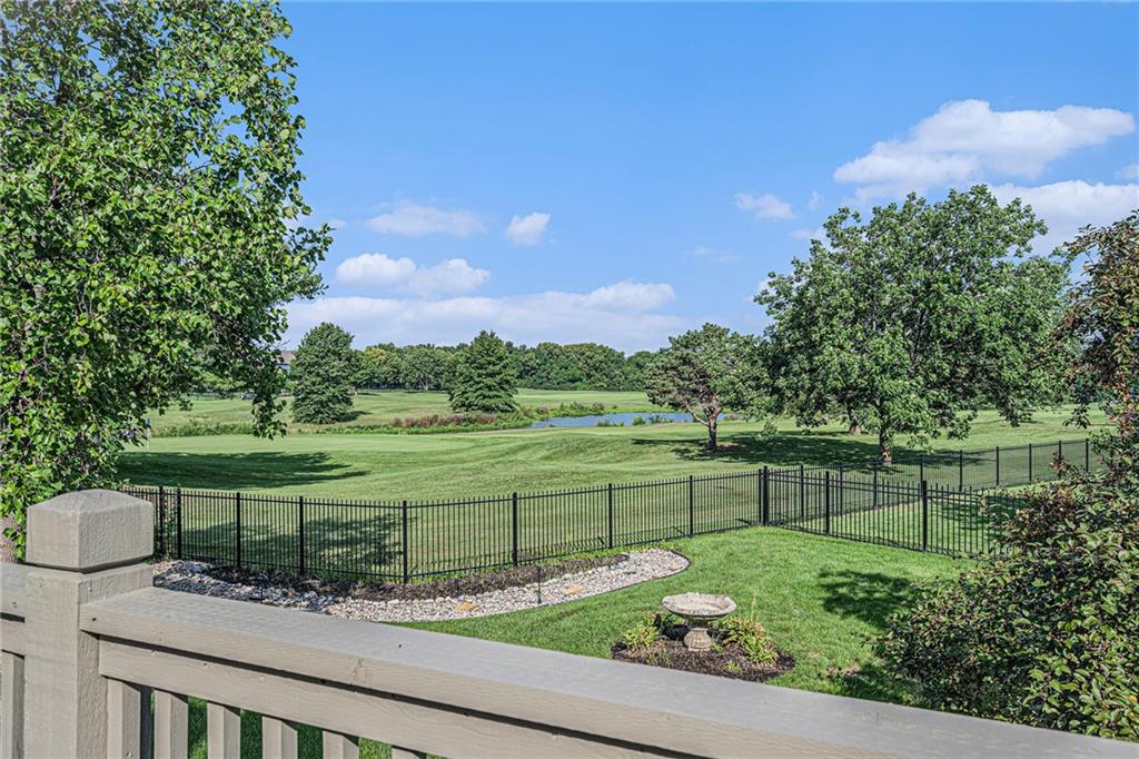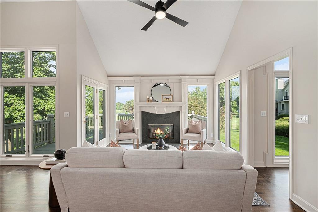 GOLF COURSE living at its finest!! Nestled up to the 8th green of the Sykes/Lady Overland Park Golf Course, this beautifully renovated home offers multiple stunning views, both inside and out, of the golf course and pond. Cozy up in front of the hearth windows or step onto the spacious deck to enjoy the breeze and scenery. Inside, the home is full of natural light from picturesque windows and vaulted ceilings, showcasing multiple living spaces. Nearly every surface of this home has been updated, including all new stainless-steel top-of-the-line appliances, quartz countertops, beautiful white oak hardwood floors, new carpet, all new plumbing and light fixtures, fresh paint inside and out, and a NEW ROOF installed April of this year. The main floor primary bedroom includes a BONUS private laundry area. Three additional bedrooms and 2 full baths are located on the second floor (with its own separate HVAC unit and thermostat!). The lower-level features additional living space with a wet bar and fridge, plus a HUGE possible 5th bedroom/office/workout room, and French doors walking up to the well-manicured yard, maintained by a full front/back sprinkler system. Located in prestigious Nottingham By The Green, this home is pristine and move-in ready!