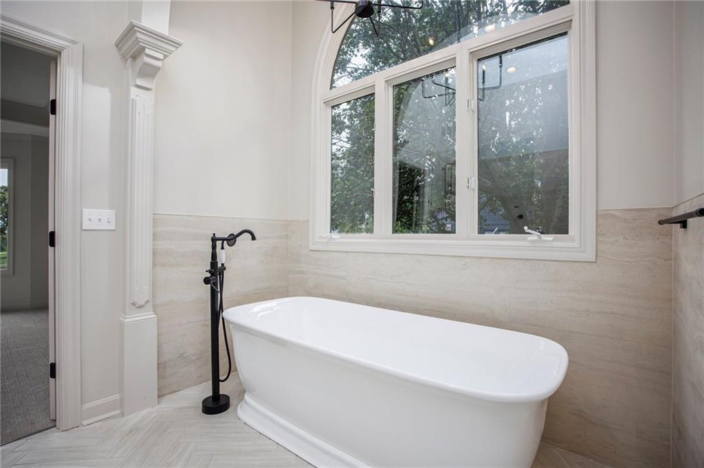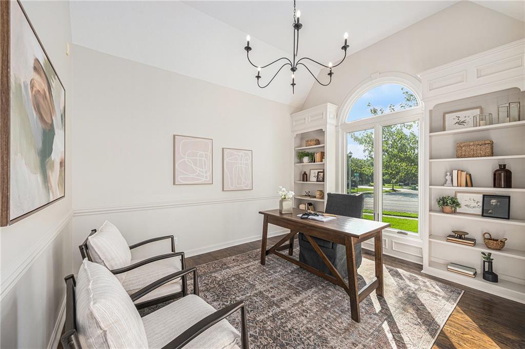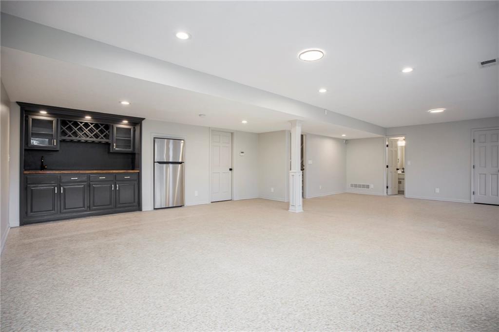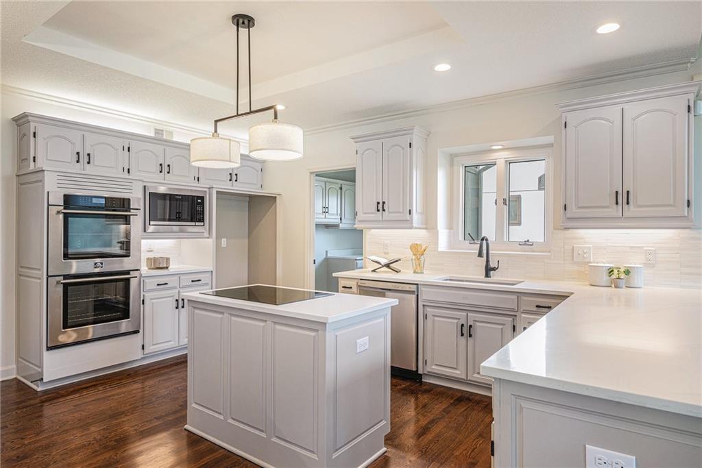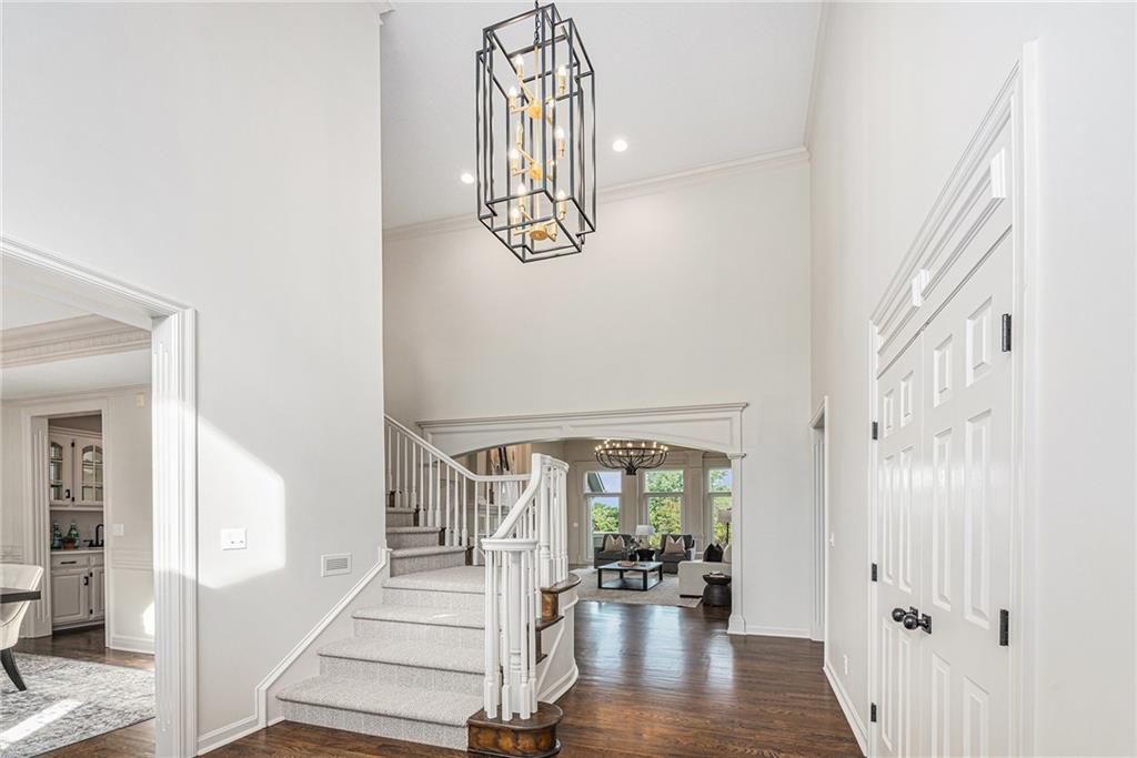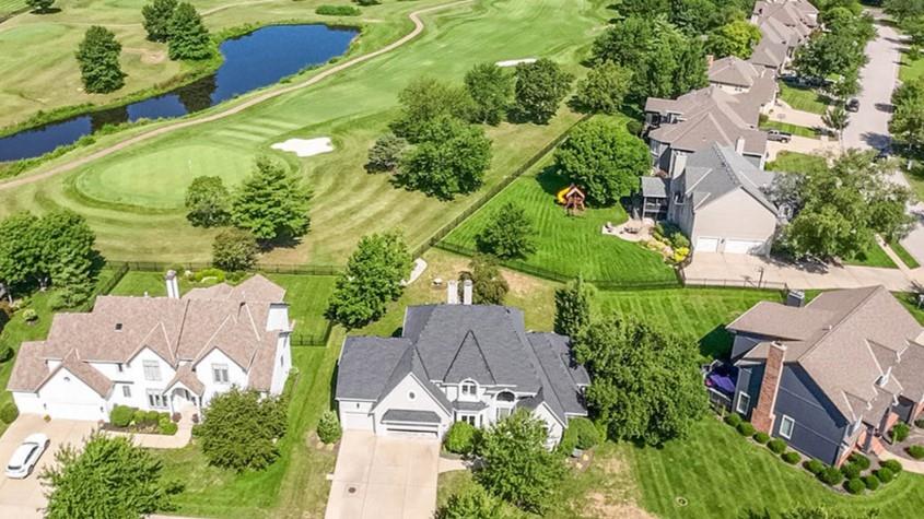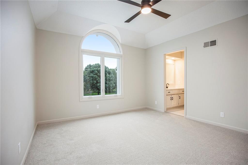 GOLF COURSE living at its finest!! Nestled up to the 8th green of the Sykes/Lady Overland Park Golf Course, this beautifully renovated home offers multiple stunning views, both inside and out, of the golf course and pond. Cozy up in front of the hearth windows or step onto the spacious deck to enjoy the breeze and scenery. Inside, the home is full of natural light from picturesque windows and vaulted ceilings, showcasing multiple living spaces. Nearly every surface of this home has been updated, including all new stainless-steel top-of-the-line appliances, quartz countertops, beautiful white oak hardwood floors, new carpet, all new plumbing and light fixtures, fresh paint inside and out, and a NEW ROOF installed April of this year. The main floor primary bedroom includes a BONUS private laundry area. Three additional bedrooms and 2 full baths are located on the second floor (with its own separate HVAC unit and thermostat!). The lower-level features additional living space with a wet bar and fridge, plus a HUGE possible 5th bedroom/office/workout room, and French doors walking up to the well-manicured yard, maintained by a full front/back sprinkler system. Located in prestigious Nottingham By The Green, this home is pristine and move-in ready!