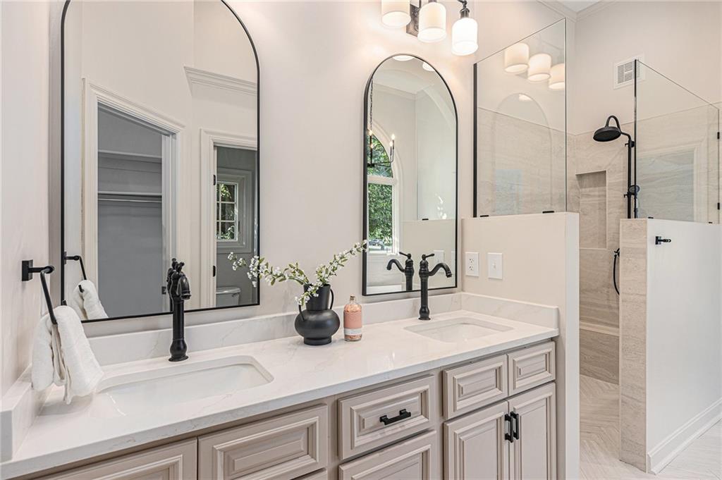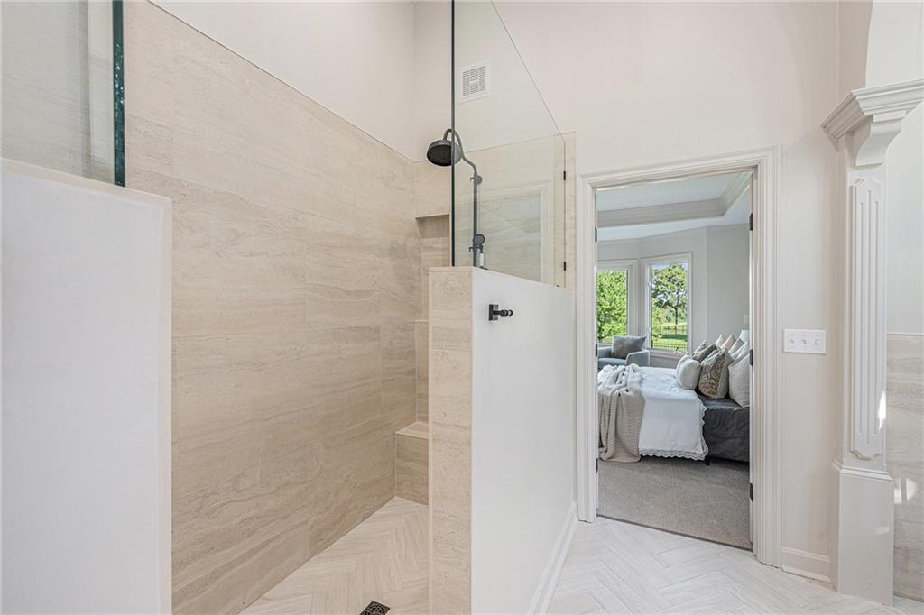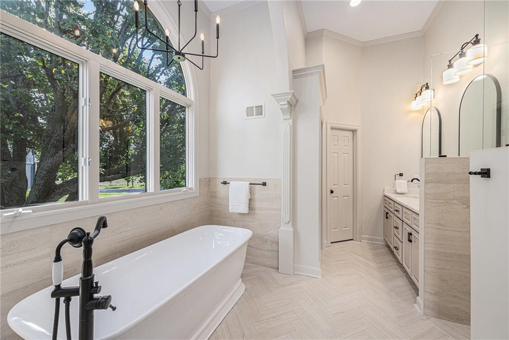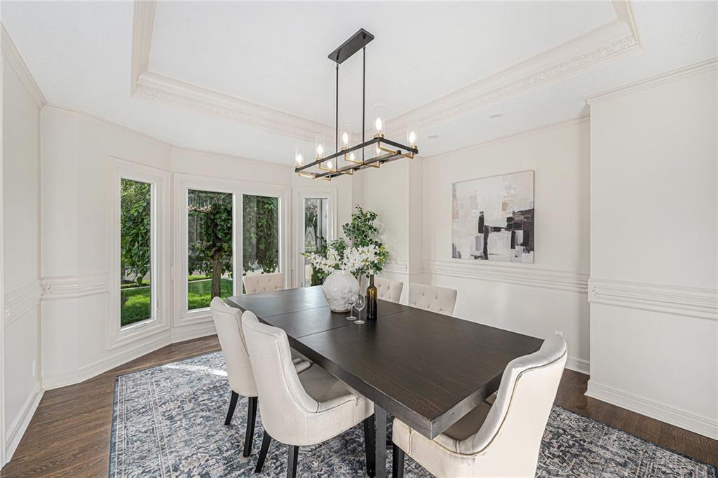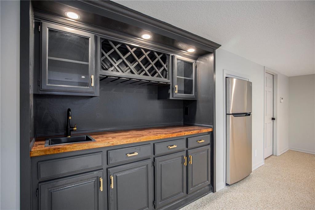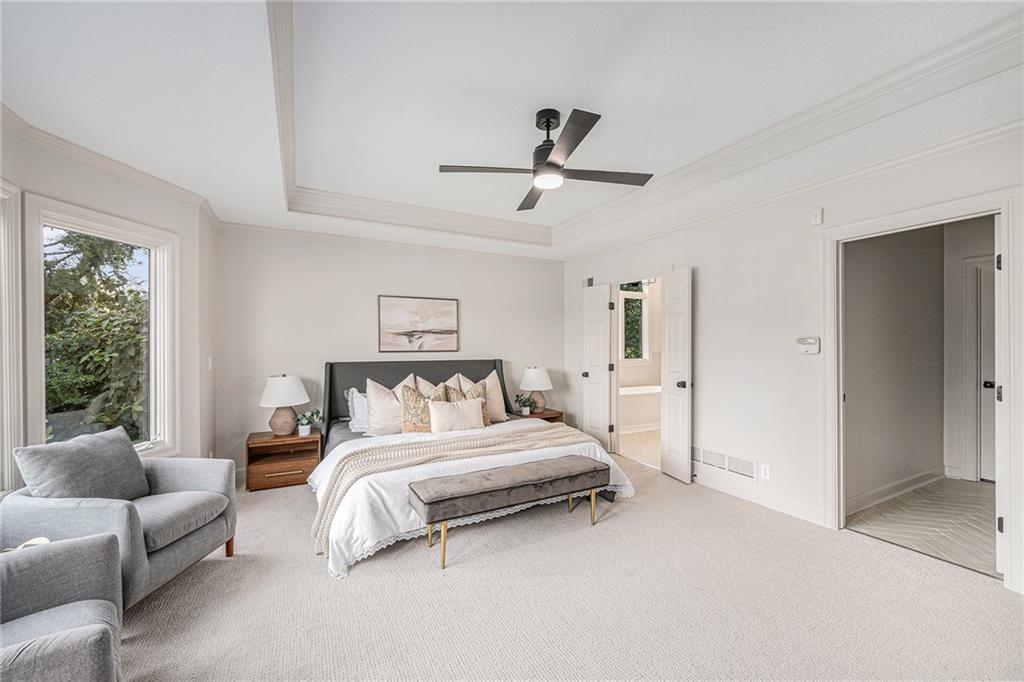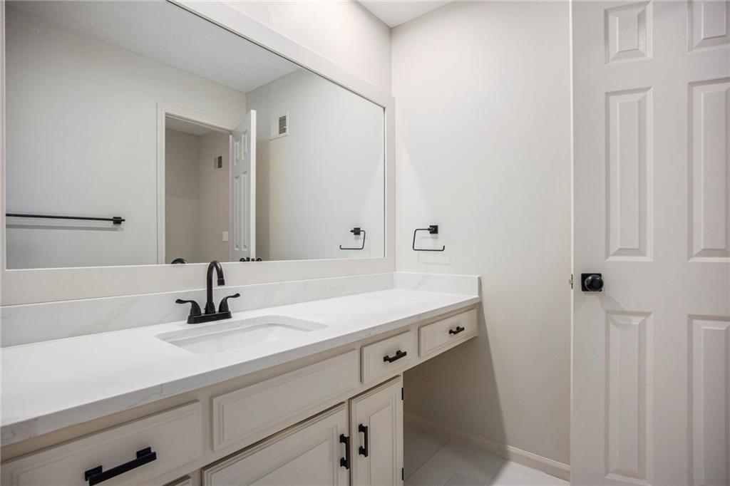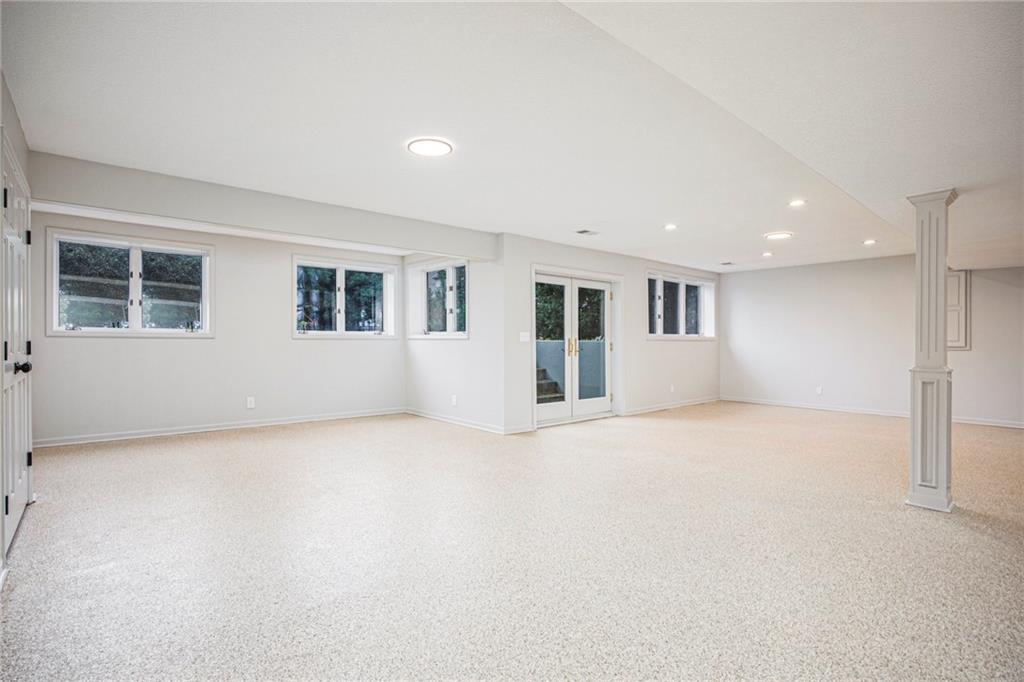 GOLF COURSE living at its finest!! Nestled up to the 8th green of the Sykes/Lady Overland Park Golf Course, this beautifully renovated home offers multiple stunning views, both inside and out, of the golf course and pond. Cozy up in front of the hearth windows or step onto the spacious deck to enjoy the breeze and scenery. Inside, the home is full of natural light from picturesque windows and vaulted ceilings, showcasing multiple living spaces. Nearly every surface of this home has been updated, including all new stainless-steel top-of-the-line appliances, quartz countertops, beautiful white oak hardwood floors, new carpet, all new plumbing and light fixtures, fresh paint inside and out, and a NEW ROOF installed April of this year. The main floor primary bedroom includes a BONUS private laundry area. Three additional bedrooms and 2 full baths are located on the second floor (with its own separate HVAC unit and thermostat!). The lower-level features additional living space with a wet bar and fridge, plus a HUGE possible 5th bedroom/office/workout room, and French doors walking up to the well-manicured yard, maintained by a full front/back sprinkler system. Located in prestigious Nottingham By The Green, this home is pristine and move-in ready!