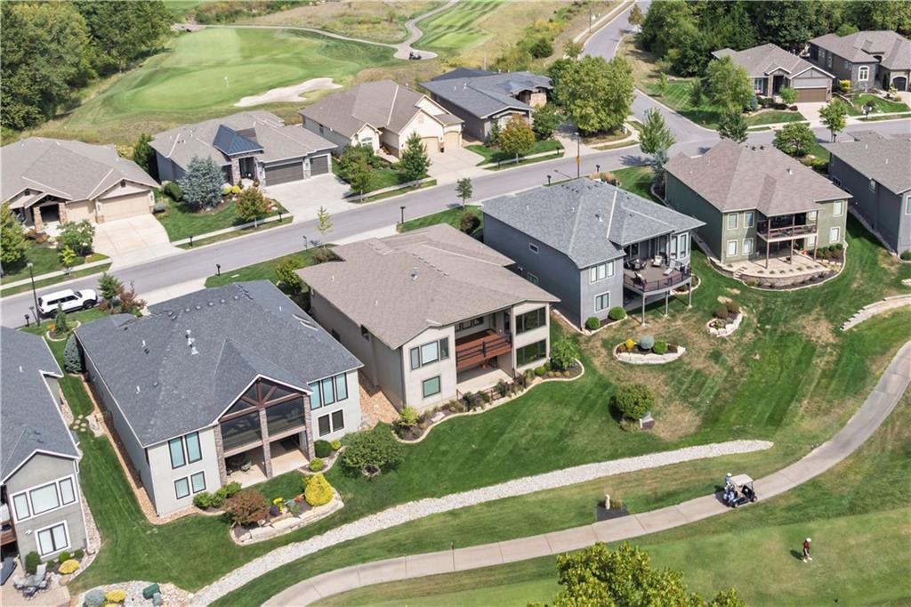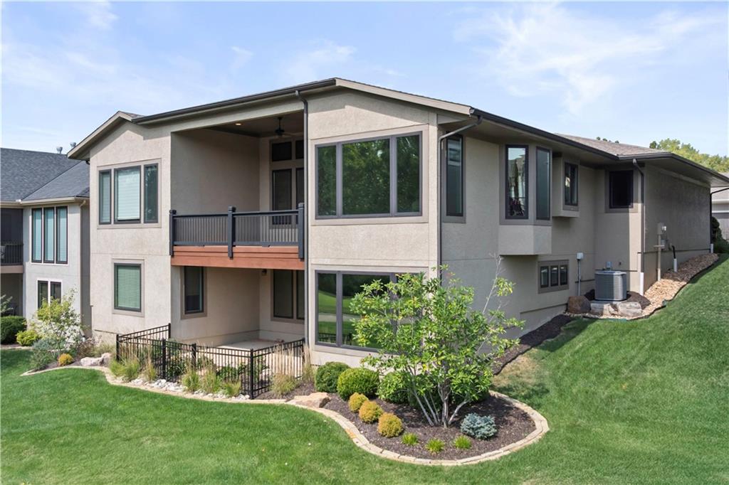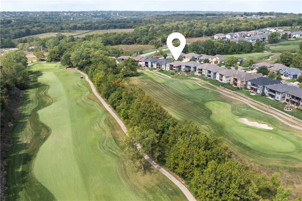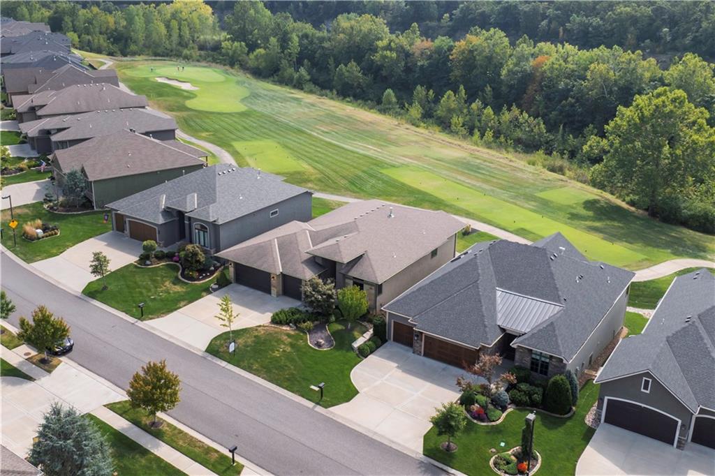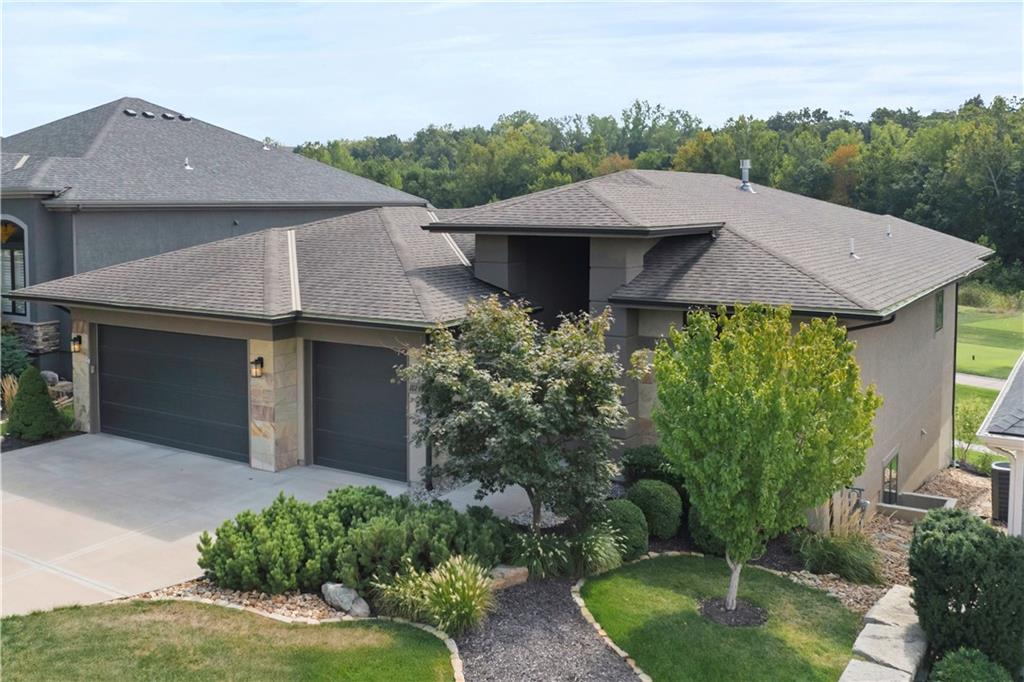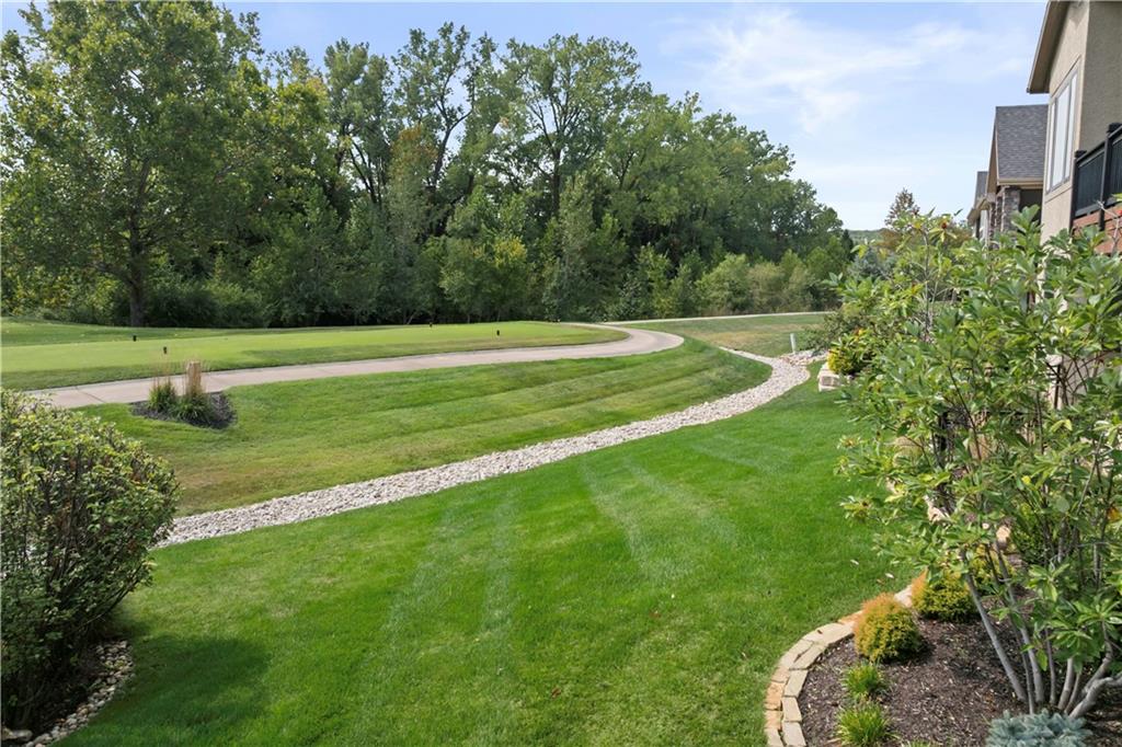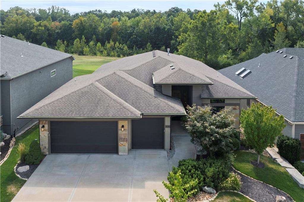 Custom reverse 1.5-story by award-winning builder B.L. Rieke, nestled in the prestigious Canyon Farms Golf Club, offering breathtaking views of rolling hills, and manicured golf greens. From the moment you arrive, the stone-accented exterior and welcoming entry set the tone for what’s inside. The main level features soaring ceilings, walls of windows, and an open floor plan designed for both everyday comfort and easy entertaining. A gourmet kitchen with custom cabinetry, oversized island, granite counters, high-end stainless-steel appliances flows seamlessly into the hearth and great rooms. The spacious primary suite boasts gorgeous golf course views, a spa-like bath and walk-in closet. A second main-floor bedroom doubles perfectly as a guest room or private office. The walkout lower level is designed for gathering or game day watching —complete with a stylish wet bar, large living area, and two additional bedrooms, each with their own full bath and walk-in closet. Hardwood floors, stacked stone accents, and exquisite trim details add warmth and character throughout. Enjoy sunsets from the deck or patio while overlooking the golfers teeing off from the hole 15 of Canyon Farms. Whether entertaining friends or savoring a quiet evening, this home offers the feeling of a Colorado mountain retreat—without ever leaving Kansas. Tons of upgrades including electronic shades, whole house Culligan water purifier and more! Located minutes from Lenexa City Center and major highways, this first-rate golf community offers convenience, luxury, and unbeatable views. Homes in this community do not resell often - don’t miss the chance to make this retreat your home.