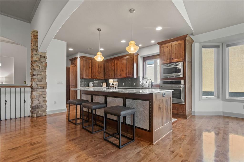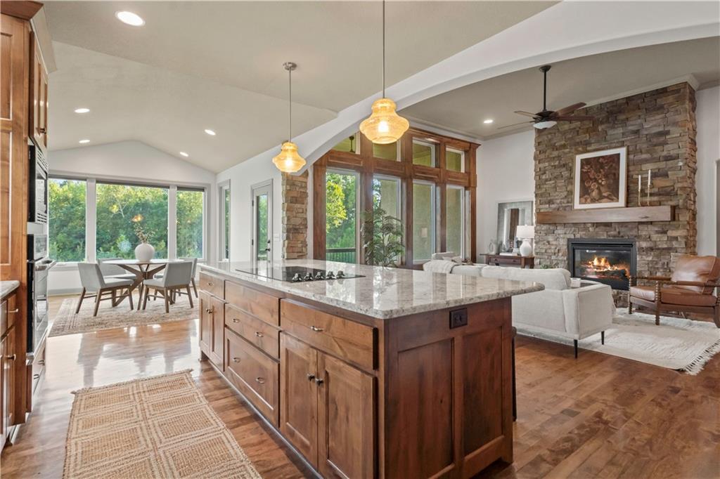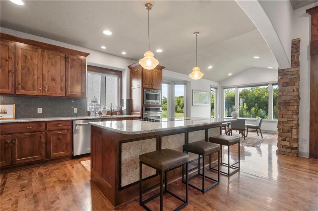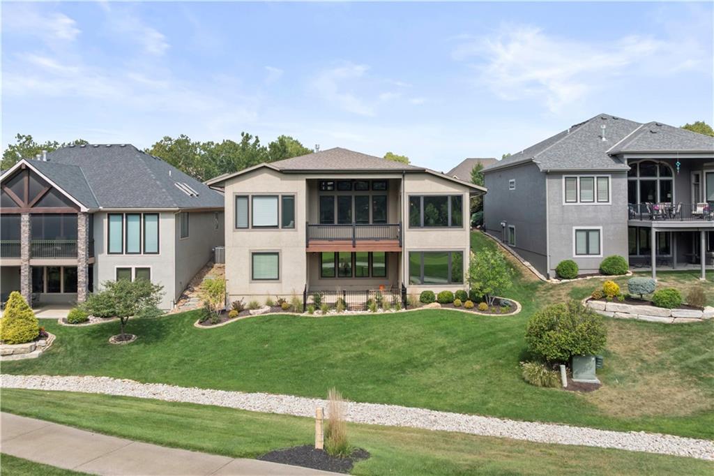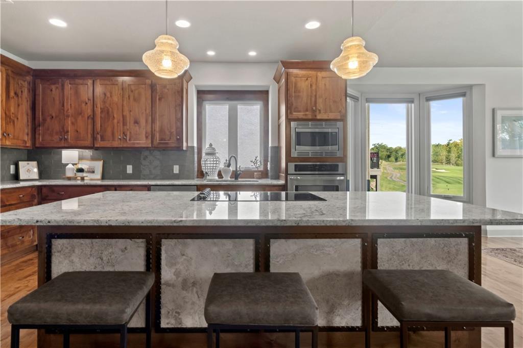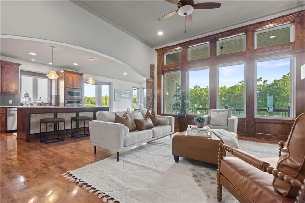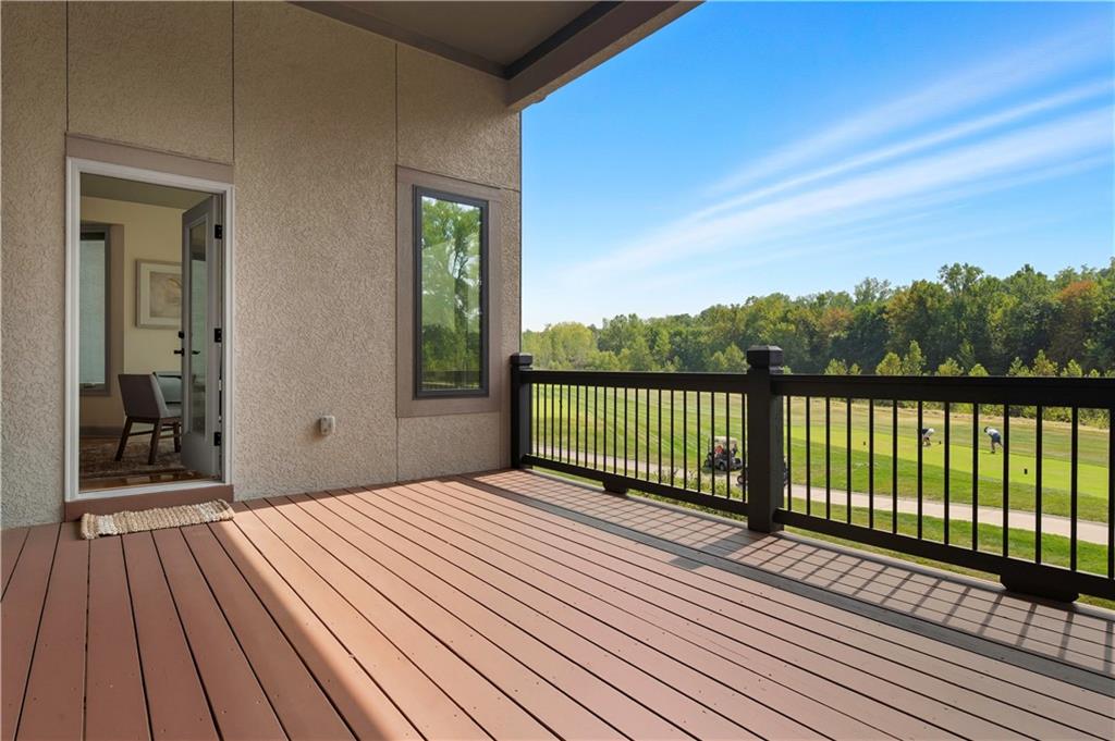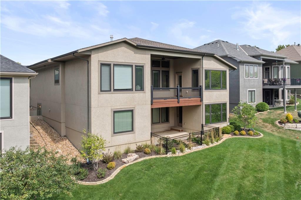 Custom reverse 1.5-story by award-winning builder B.L. Rieke, nestled in the prestigious Canyon Farms Golf Club, offering breathtaking views of rolling hills, and manicured golf greens. From the moment you arrive, the stone-accented exterior and welcoming entry set the tone for what’s inside. The main level features soaring ceilings, walls of windows, and an open floor plan designed for both everyday comfort and easy entertaining. A gourmet kitchen with custom cabinetry, oversized island, granite counters, high-end stainless-steel appliances flows seamlessly into the hearth and great rooms. The spacious primary suite boasts gorgeous golf course views, a spa-like bath and walk-in closet. A second main-floor bedroom doubles perfectly as a guest room or private office. The walkout lower level is designed for gathering or game day watching —complete with a stylish wet bar, large living area, and two additional bedrooms, each with their own full bath and walk-in closet. Hardwood floors, stacked stone accents, and exquisite trim details add warmth and character throughout. Enjoy sunsets from the deck or patio while overlooking the golfers teeing off from the hole 15 of Canyon Farms. Whether entertaining friends or savoring a quiet evening, this home offers the feeling of a Colorado mountain retreat—without ever leaving Kansas. Tons of upgrades including electronic shades, whole house Culligan water purifier and more! Located minutes from Lenexa City Center and major highways, this first-rate golf community offers convenience, luxury, and unbeatable views. Homes in this community do not resell often - don’t miss the chance to make this retreat your home.