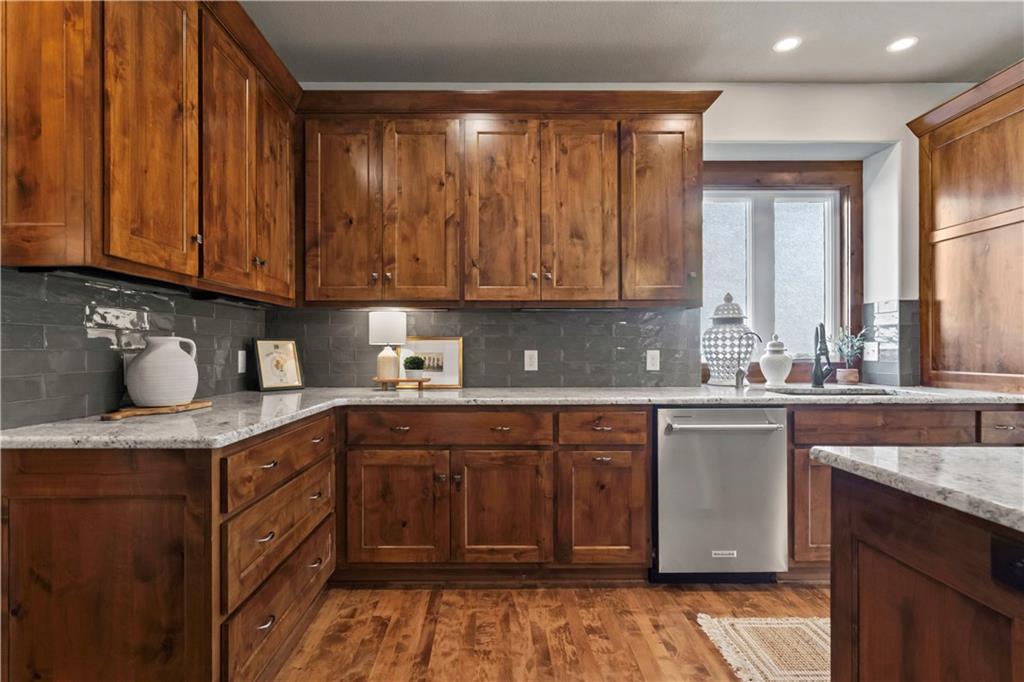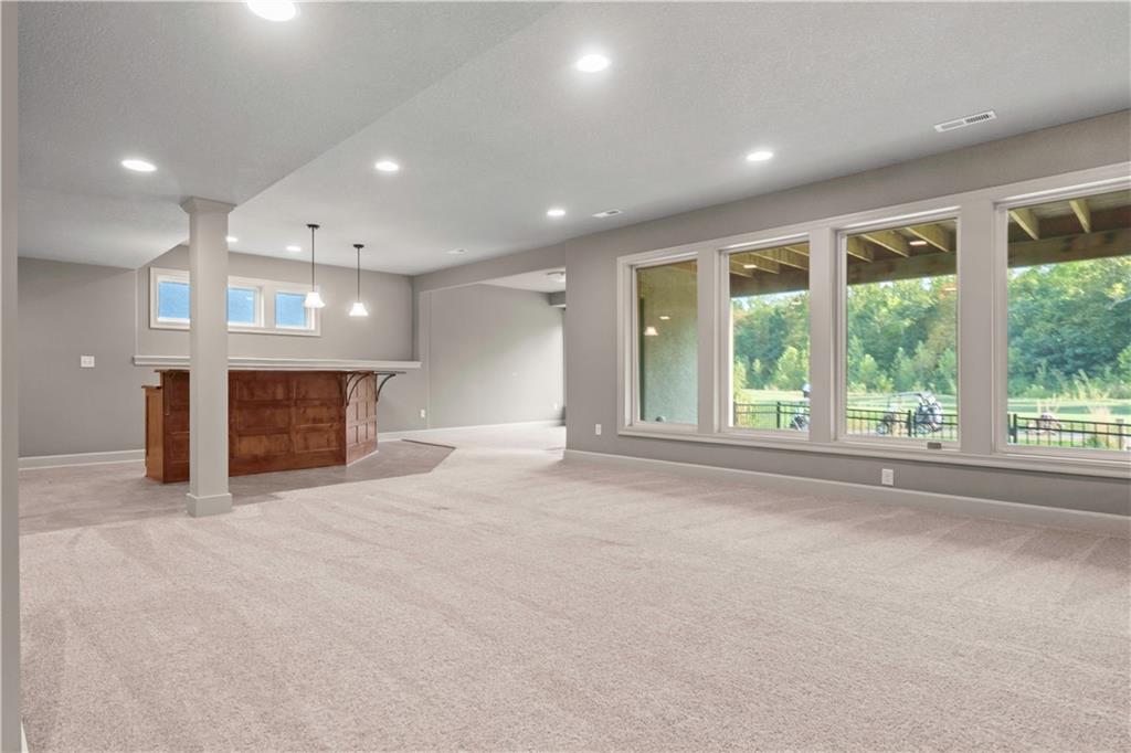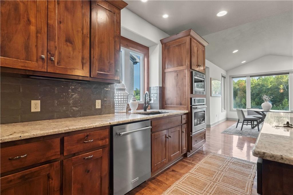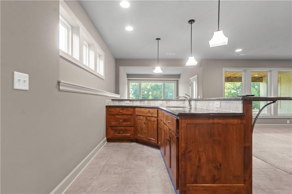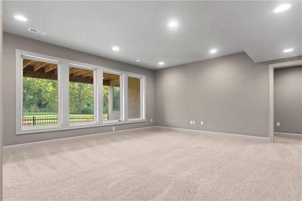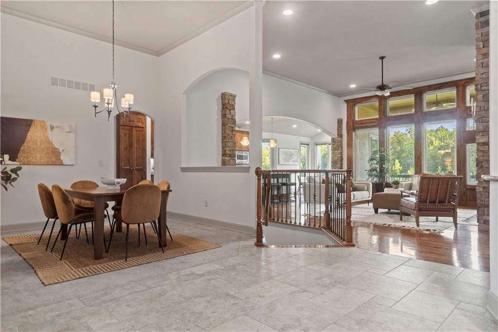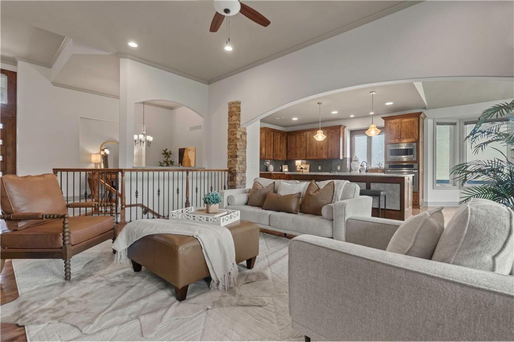 Custom reverse 1.5-story by award-winning builder B.L. Rieke, nestled in the prestigious Canyon Farms Golf Club, offering breathtaking views of rolling hills, and manicured golf greens. From the moment you arrive, the stone-accented exterior and welcoming entry set the tone for what’s inside. The main level features soaring ceilings, walls of windows, and an open floor plan designed for both everyday comfort and easy entertaining. A gourmet kitchen with custom cabinetry, oversized island, granite counters, high-end stainless-steel appliances flows seamlessly into the hearth and great rooms. The spacious primary suite boasts gorgeous golf course views, a spa-like bath and walk-in closet. A second main-floor bedroom doubles perfectly as a guest room or private office. The walkout lower level is designed for gathering or game day watching —complete with a stylish wet bar, large living area, and two additional bedrooms, each with their own full bath and walk-in closet. Hardwood floors, stacked stone accents, and exquisite trim details add warmth and character throughout. Enjoy sunsets from the deck or patio while overlooking the golfers teeing off from the hole 15 of Canyon Farms. Whether entertaining friends or savoring a quiet evening, this home offers the feeling of a Colorado mountain retreat—without ever leaving Kansas. Tons of upgrades including electronic shades, whole house Culligan water purifier and more! Located minutes from Lenexa City Center and major highways, this first-rate golf community offers convenience, luxury, and unbeatable views. Homes in this community do not resell often - don’t miss the chance to make this retreat your home.