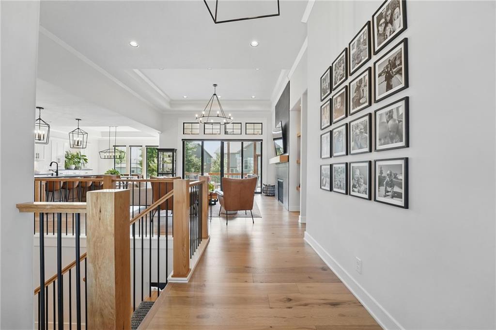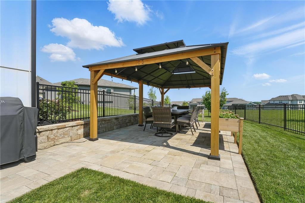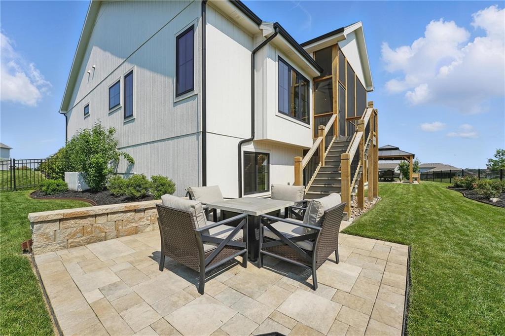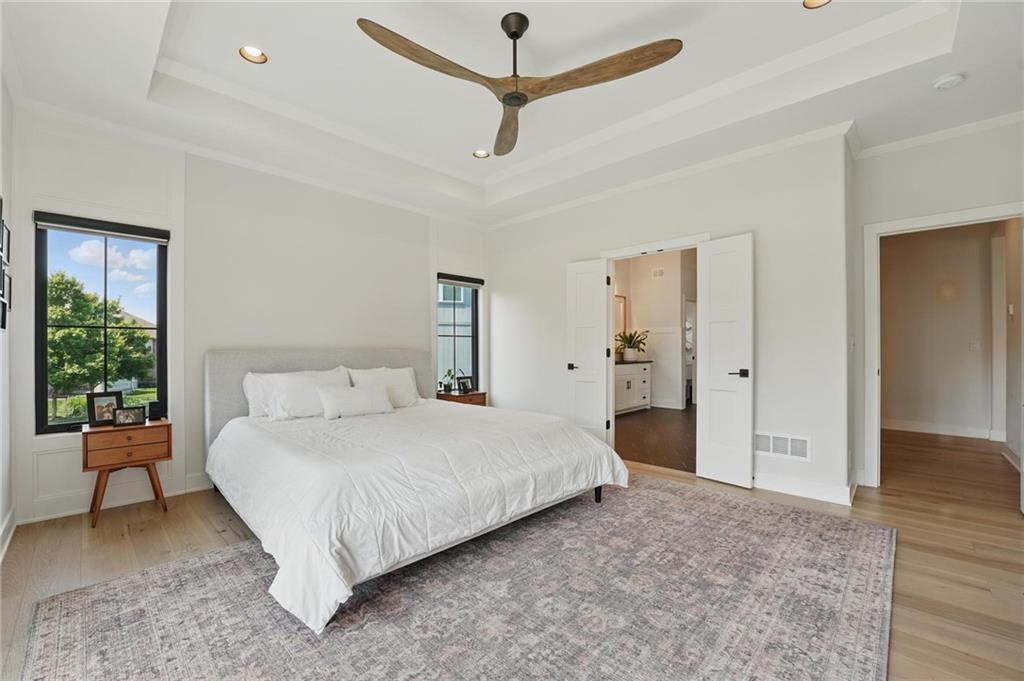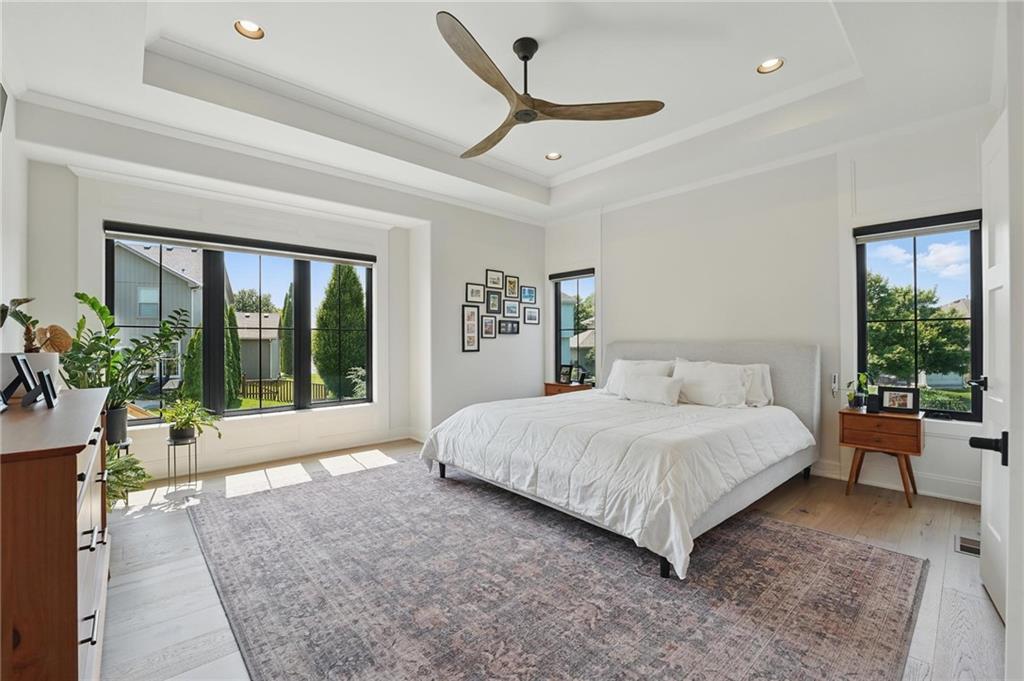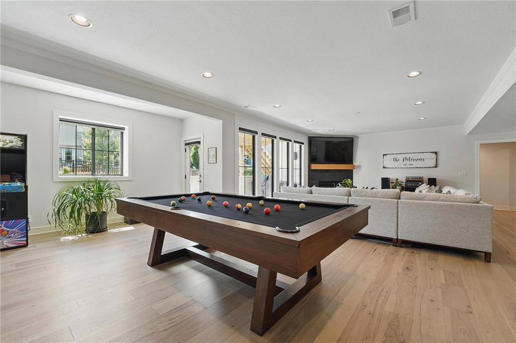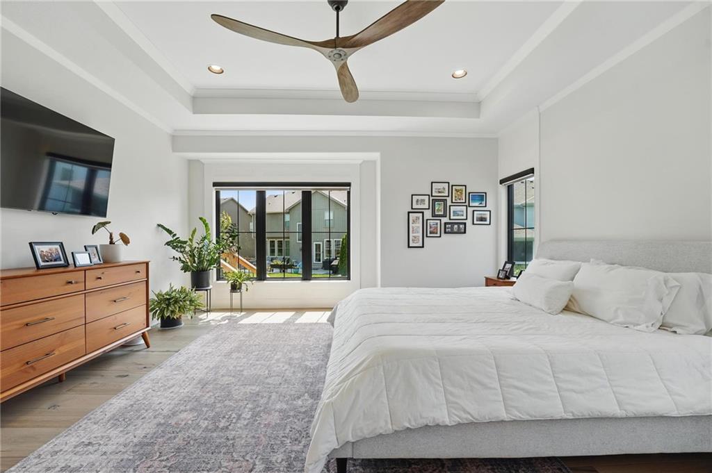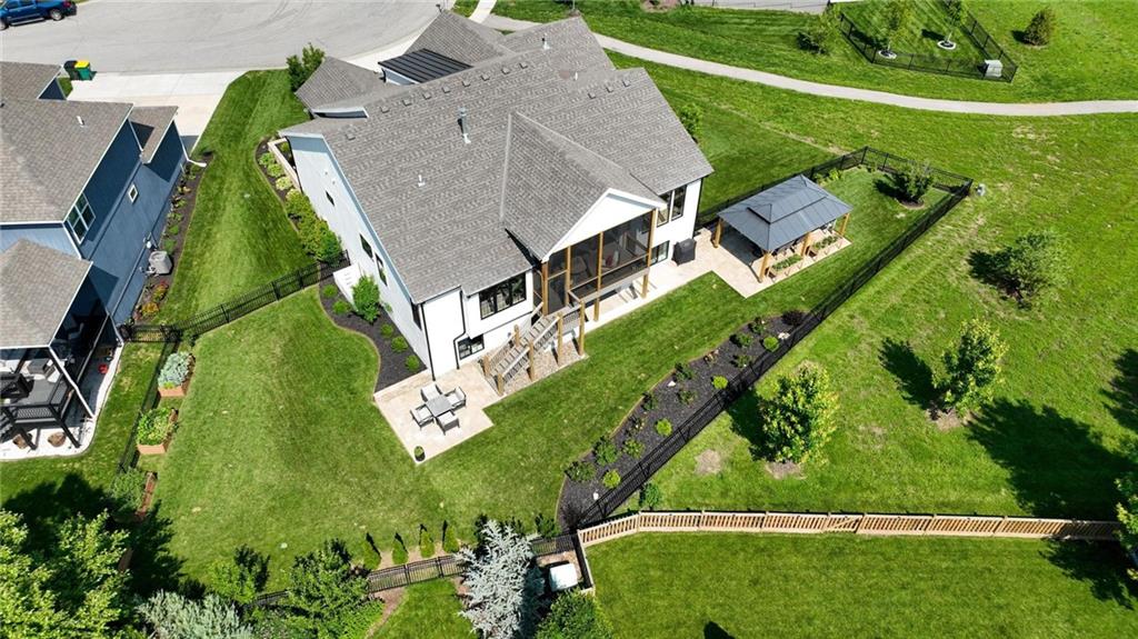 Welcome to this impeccably designed Jefferson EX Reverse 1.5-story home, perfectly situated on a premium cul-de-sac lot With higher end outside light packaging that complements the home. This spectacular home backs to lush green space and walking trail. This showstopper blends luxury and functionality, offering high-end finishes throughout and a setting that feels like a private retreat. Step inside to find 7.5” wide-plank hardwood flooring, custom lighting, and upgraded ceiling fans in every bedroom. The open-concept main level showcases a gourmet kitchen with GE Profile appliances, walk-in custom pantry with built-in baskets, Doubles ovens and a large island perfect for entertaining. Programmable blackout shades throughout the home provide comfort and energy efficiency. The luxurious primary suite features a spa like bath, oversized custom closet with built-in pull-down rods, and direct access to the laundry room for added convenience. Secondary bedrooms are spacious and thoughtfully appointed. Enjoy the outdoors year-round from the screened-in porch and expansive pergola-covered patio. The beautifully landscaped backyard includes drip irrigation, raised planter beds, and a custom dog shower for your furry companions. Additional upgrades include a radon mitigation system, heat circulators, water softener and filtration system, and full-yard automatic sprinkler system. Skip the timelines of building and stress when you can have all the modern features you have been dreaming of with all the upgrades and move-in ready convenince. Neighborhood perks include a community pool, playground, paved walking trails, and quick access to Heritage Park and the Player Golf Course