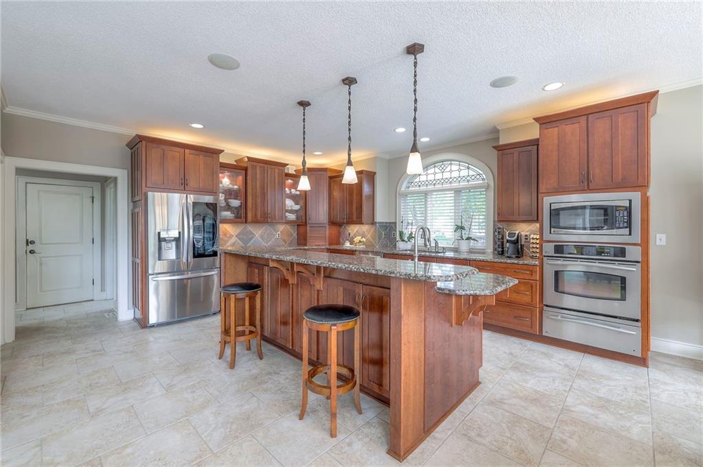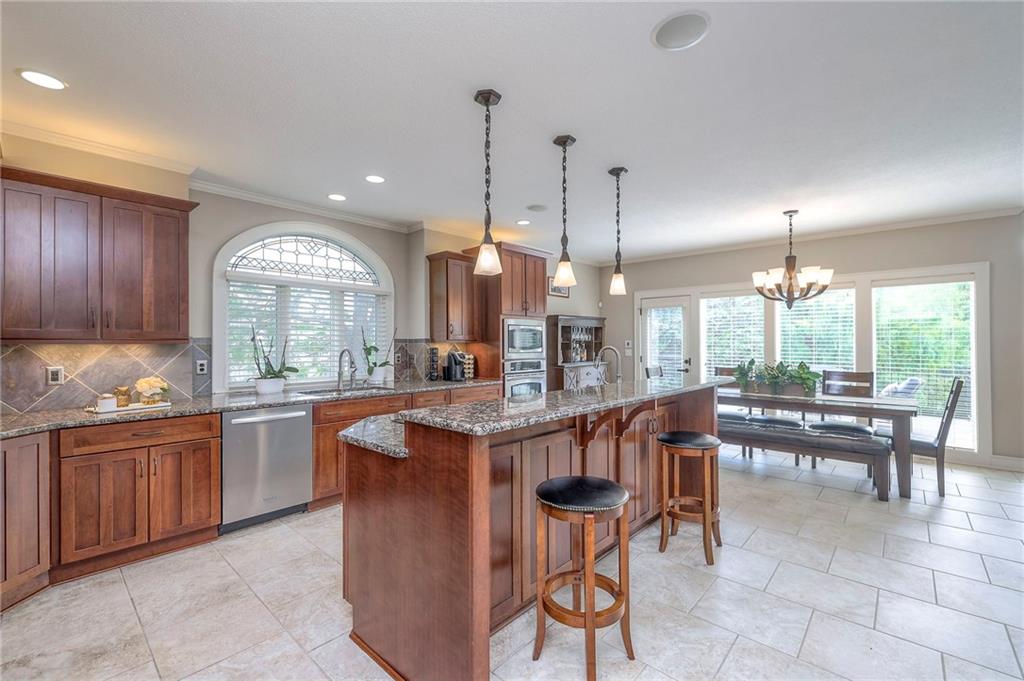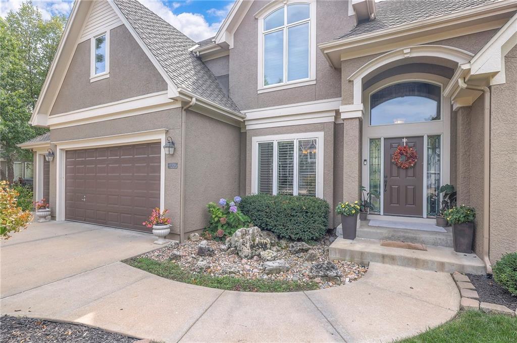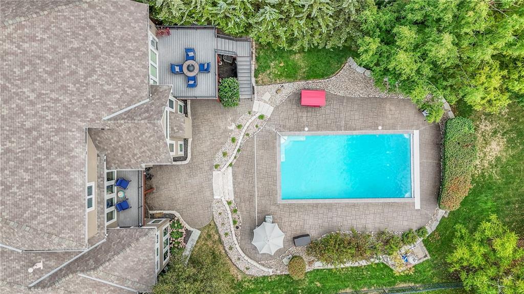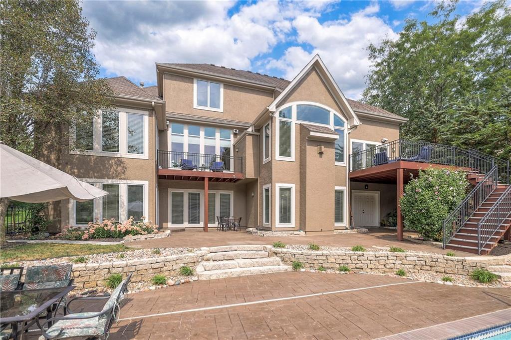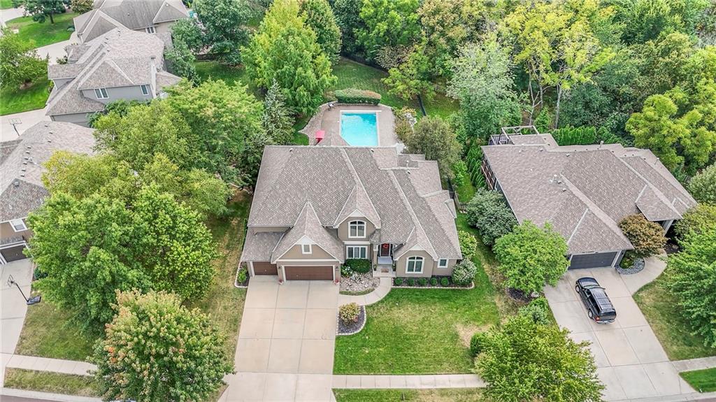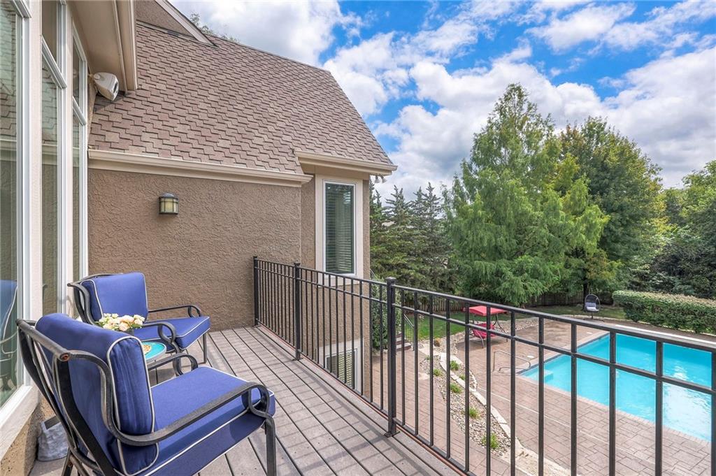 Welcome to this stunning 1.5-story home offering over 5,800 square feet of living space in a fantastic Overland Park location. The inviting entry opens to a formal dining room and home office, setting the tone for the amazing space throughout. The living room is warm and welcoming with vaulted ceilings, a cozy fireplace, and built-ins. The kitchen is truly the heart of the home, featuring an expansive island, double ovens, two sinks, a walk-in pantry, and generous countertop space. Just off the kitchen, a hearth room with its own fireplace and built-ins provides the perfect spot to gather. Step outside to a low-maintenance composite deck overlooking the private, treed backyard. The main-level primary suite is a retreat all its own, with a private balcony, spa-like ensuite bath featuring a walk-in shower and soaking tub, and a huge walk-in closet. A convenient laundry room rounds out the main floor. Upstairs, you’ll find four spacious bedrooms, each with access to bathrooms and large closets. The finished walk-out basement is designed for entertaining, featuring a large rec room, a wet bar, and a separate space perfect for a pool table. A non-conforming sixth bedroom and abundant storage provide additional flexibility. Step outside to the backyard oasis, complete with a beautiful swimming pool, expansive patio, green space, and mature trees for privacy. This home is the complete package, spacious, functional, and perfect for both everyday living and entertaining.