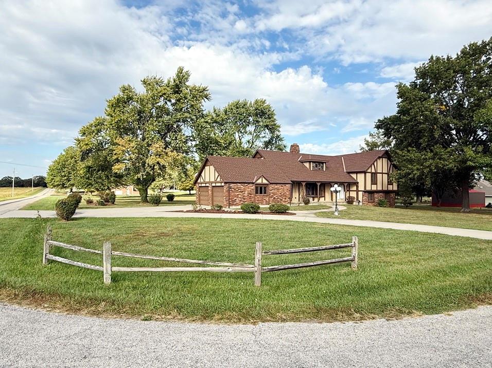 Spacious Tudor-Style Home on 1.6 Acres – Just Outside of Town Need Space---Look no further!!! This 6-bedroom, 3.5-bath Tudor home offers nearly 4,000 sq. ft. of finished living space plus 1,160 sq ft of unfinished basement. The separation of floors provides bigger rooms and better privacy for occupants. The home offers, not 1, not 2, not 3, but FOUR separate living rooms including the large rec room with small kitchenette on the lower level. The kitchen, with appliances included, features an eat-in breakfast space in addition to the formal dining area. These rooms provide the opportunity to spread out and host large gatherings of family or friends. The master suite showcases a high, cathedral ceiling with beams, 2 closets (one walk-in), a private balcony, and ensuite bath. Additional bedrooms are all generously sized, offering comfort and flexibility for guests, hobbies, or work-from-home office space. The full, unfinished, walk-out basement provides great storage & shelter. A 2-car attached garage & paved circle drive make egress and ingress easy and convenient. Set on 1.6 acres along a paved road, the property has a large yard with mature landscaping. It is located just outside of the city limits, allowing the homeowner to enjoy the peace of country-style living while being just minutes from the conveniences of town. While the home is move-in ready, it also offers an opportunity for updates to make it your own. With its size, layout, and location just outside of town, this 1-owner home is full of potential and ready for its next chapter. Call soon to schedule a showing on this unique property.