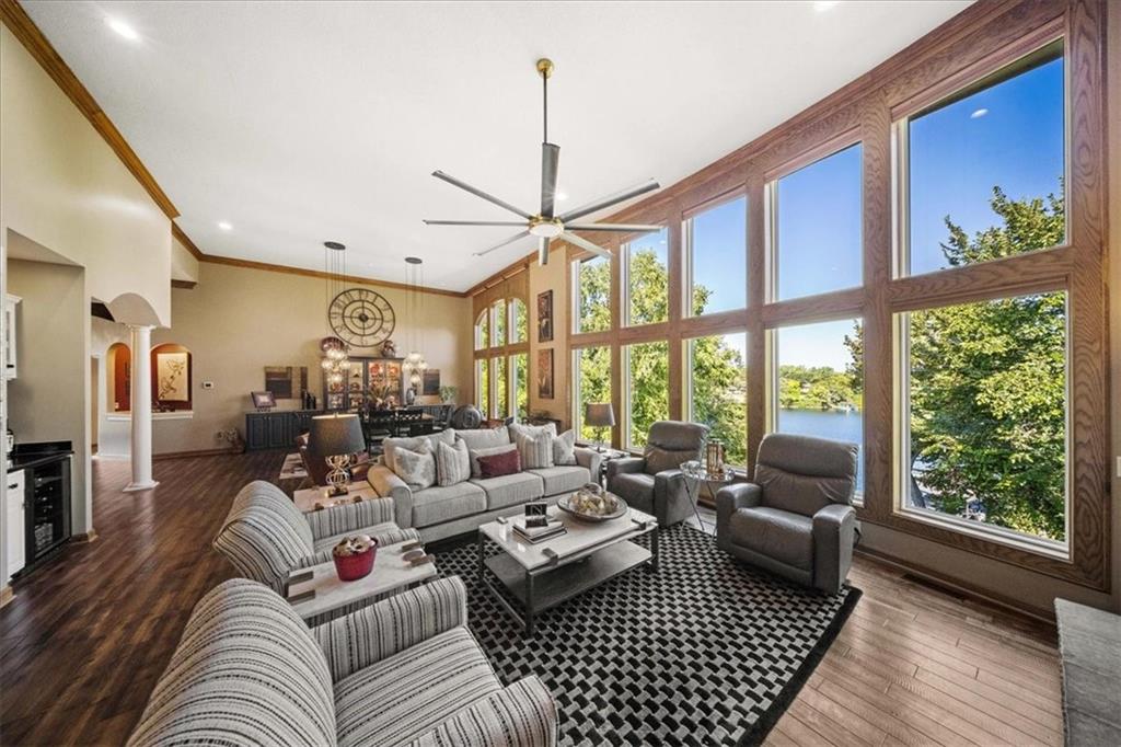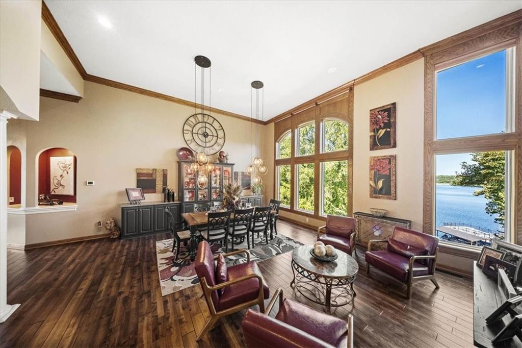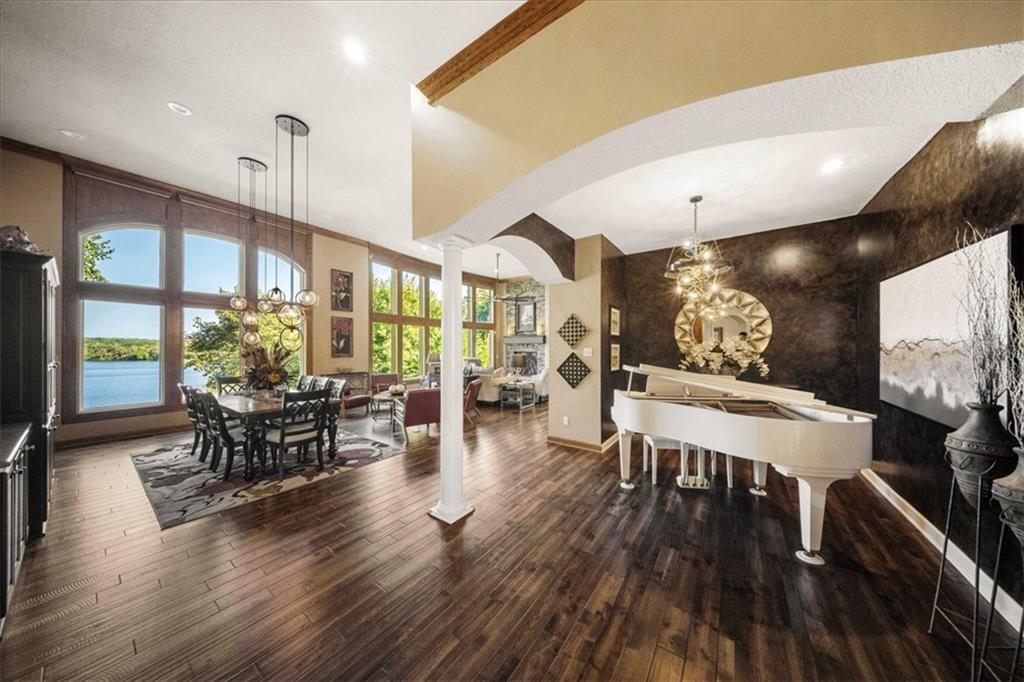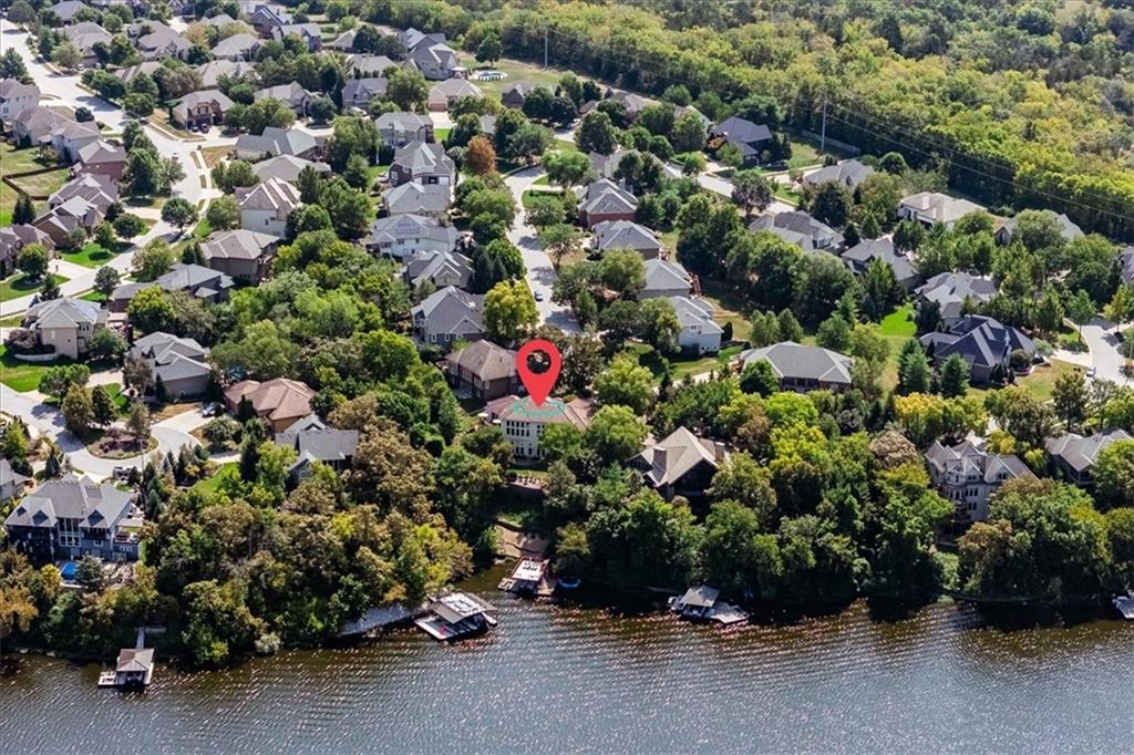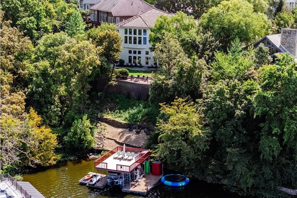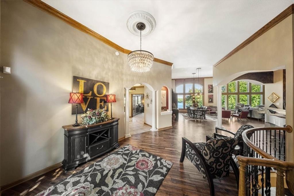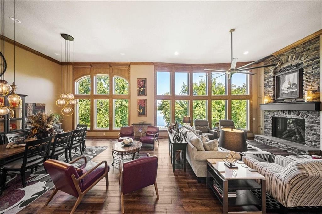 Just one word...STUNNING!! Enter into this magnificent lakefront reverse and be welcomed to breathtaking lake views from a two-story wall of glass across the entire living/dining area. This home blends elegance and comfort seamlessly. The great room boasts soaring vaulted ceilings highlighted by the floor-to-ceiling stone fireplace with unique gas logs and hickory hardwood flooring. Enjoy panoramic lake views from the oversize dining area, which includes a dry bar and beverage cooler, perfect for entertaining. Included in the open entertaining space is room for a baby grand! The spacious chef's kitchen features custom Brazilian granite top island, professional Wolf gas range, 3 electric ovens, a 4-foot wide refrigerator, and a full-size ice machine, plus a walk-in pantry. A private deck off the kitchen offers a quiet space for morning coffee. The main floor primary suite is a romantic getaway with a fireplace and cocktail deck. Generous size spa bath features a whirlpool tub, custom walk-in tiled tub shower, heated tile floors, plus a large walk-in closet completes the suite. Also included on the first floor is an office with a wall of bookcases and sweeping lake views with an abundance of natural light. The dramatic curved staircase to the tier's lower level invites you to a fabulous pool table/game room with a "tavern" bar area. Three more bedrooms, all with walk-in closets and access to private baths. BUT DON'T MISS THE MEDIA ROOM! Three-tiered seating makes movie night or game day special! Gorgeous outdoor living spaces professionally landscaped with two fire pit areas and two waterfalls. Private double-deck dock w/lake stairs, new boat lift, and 2 PWC lifts. Oversized 3-car garage plus 4th bonus area in the lower level, perfect for lake storage or exercise room. Too many upgrades to list... All this on a half-acre premium lake front lot! This is more than a home... It's a lifestyle designed for relaxation, recreation and lakefront living!