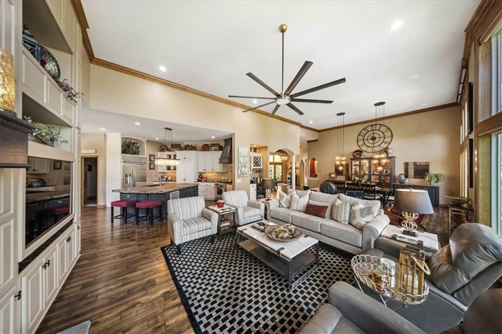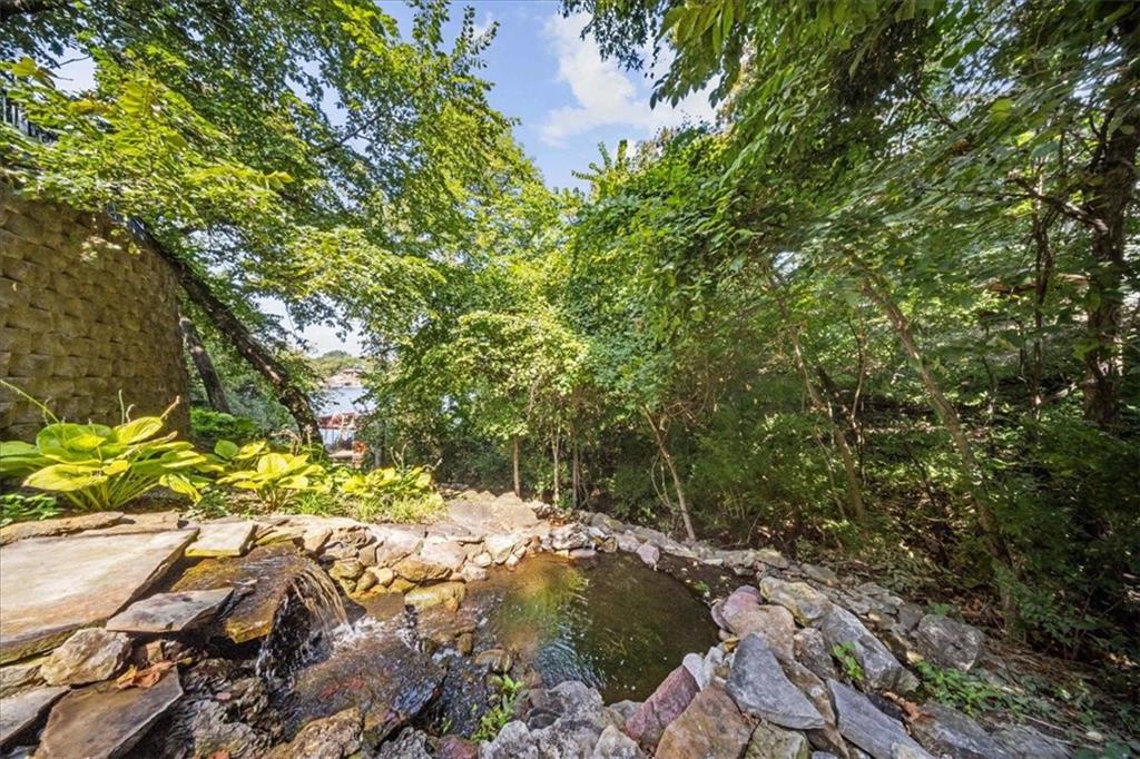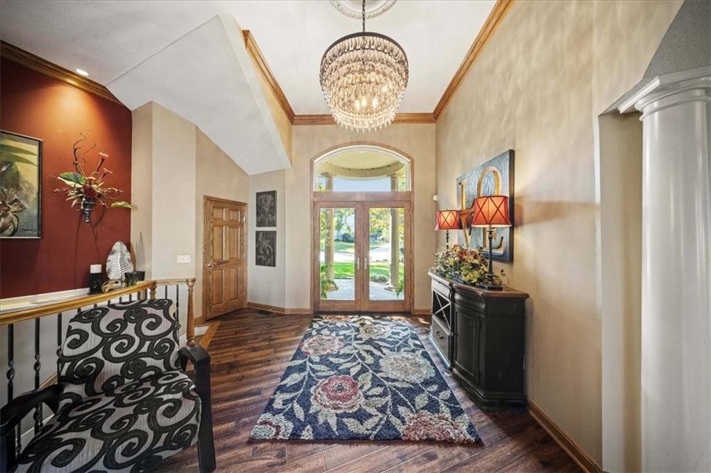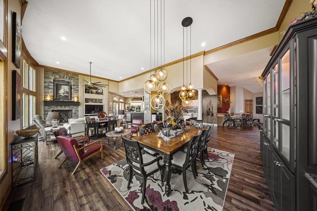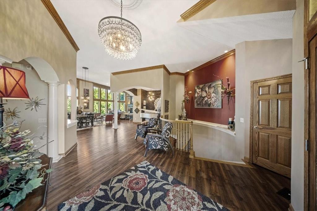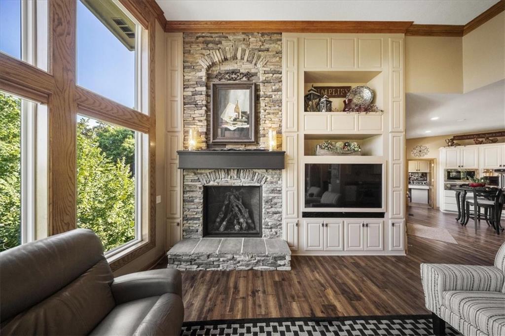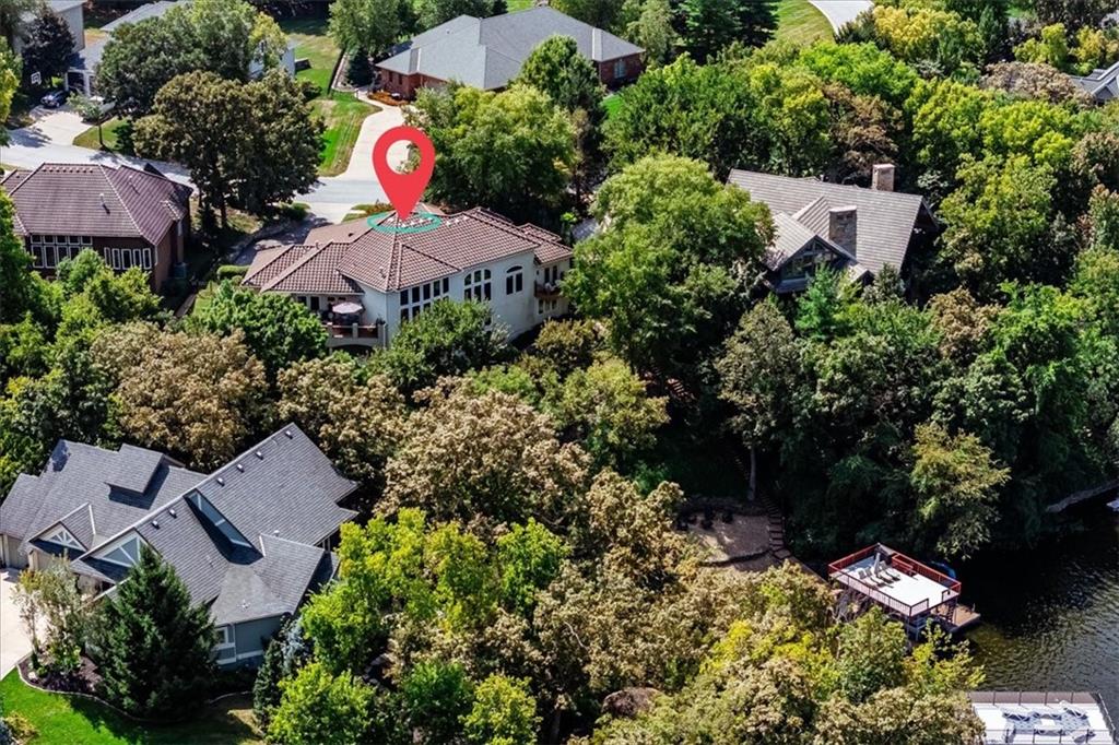 Just one word...STUNNING!! Enter into this magnificent lakefront reverse and be welcomed to breathtaking lake views from a two-story wall of glass across the entire living/dining area. This home blends elegance and comfort seamlessly. The great room boasts soaring vaulted ceilings highlighted by the floor-to-ceiling stone fireplace with unique gas logs and hickory hardwood flooring. Enjoy panoramic lake views from the oversize dining area, which includes a dry bar and beverage cooler, perfect for entertaining. Included in the open entertaining space is room for a baby grand! The spacious chef's kitchen features custom Brazilian granite top island, professional Wolf gas range, 3 electric ovens, a 4-foot wide refrigerator, and a full-size ice machine, plus a walk-in pantry. A private deck off the kitchen offers a quiet space for morning coffee. The main floor primary suite is a romantic getaway with a fireplace and cocktail deck. Generous size spa bath features a whirlpool tub, custom walk-in tiled tub shower, heated tile floors, plus a large walk-in closet completes the suite. Also included on the first floor is an office with a wall of bookcases and sweeping lake views with an abundance of natural light. The dramatic curved staircase to the tier's lower level invites you to a fabulous pool table/game room with a "tavern" bar area. Three more bedrooms, all with walk-in closets and access to private baths. BUT DON'T MISS THE MEDIA ROOM! Three-tiered seating makes movie night or game day special! Gorgeous outdoor living spaces professionally landscaped with two fire pit areas and two waterfalls. Private double-deck dock w/lake stairs, new boat lift, and 2 PWC lifts. Oversized 3-car garage plus 4th bonus area in the lower level, perfect for lake storage or exercise room. Too many upgrades to list... All this on a half-acre premium lake front lot! This is more than a home... It's a lifestyle designed for relaxation, recreation and lakefront living!