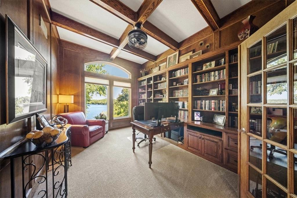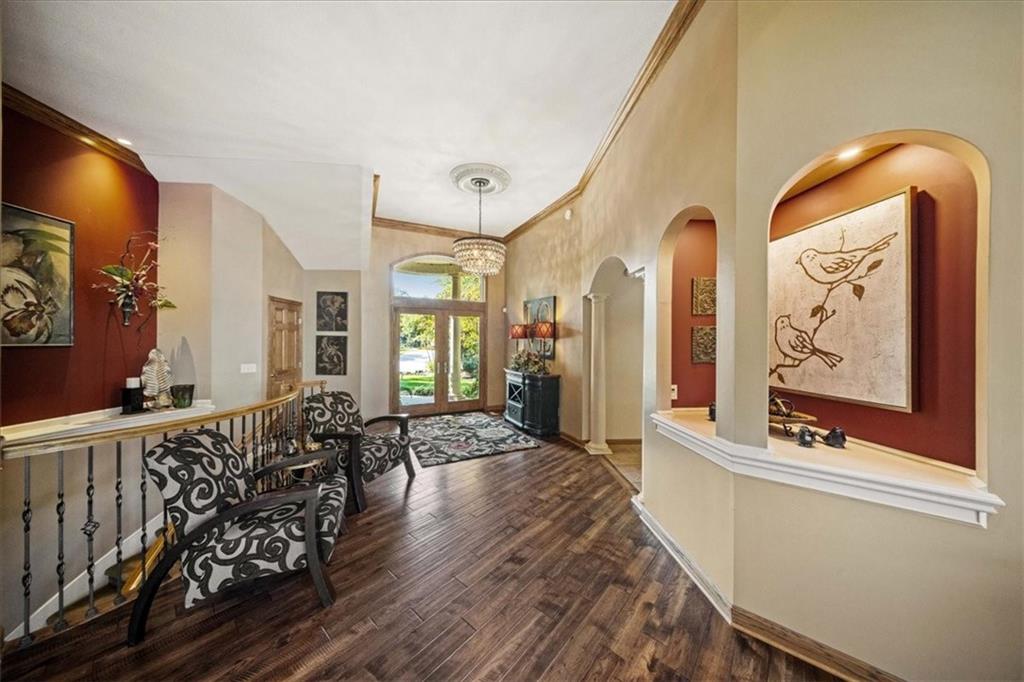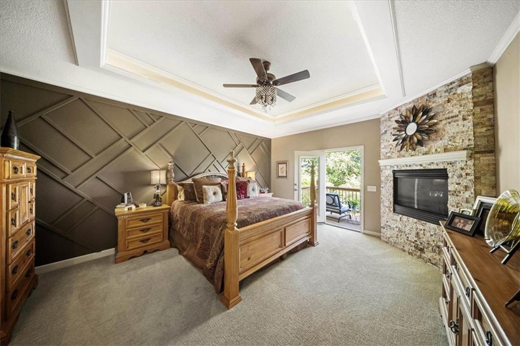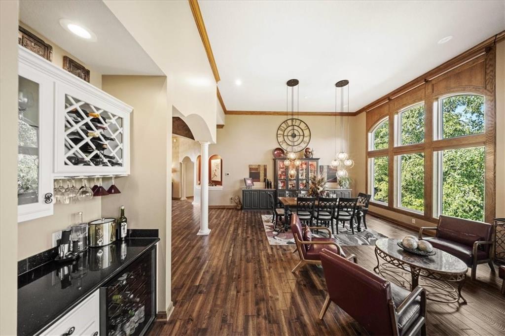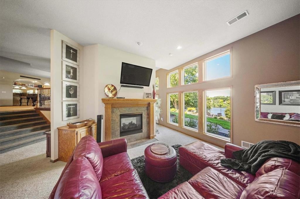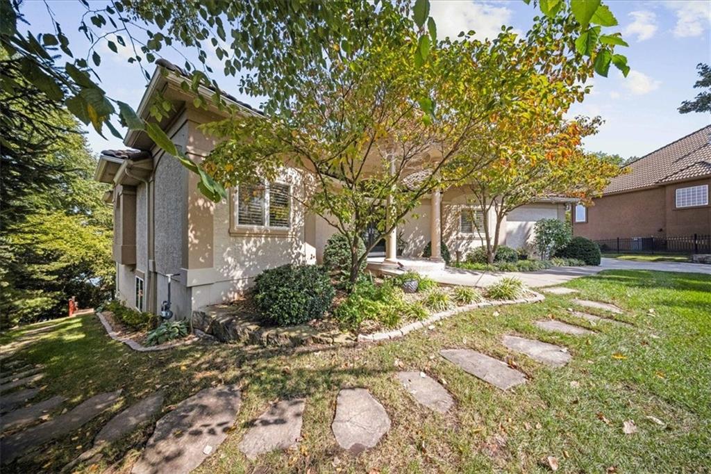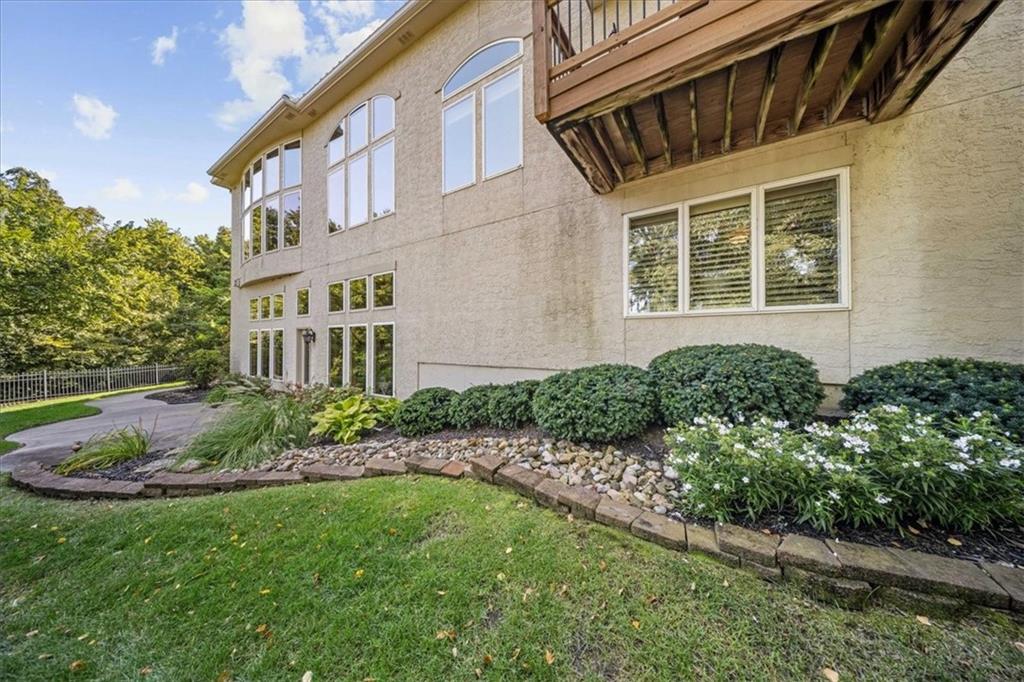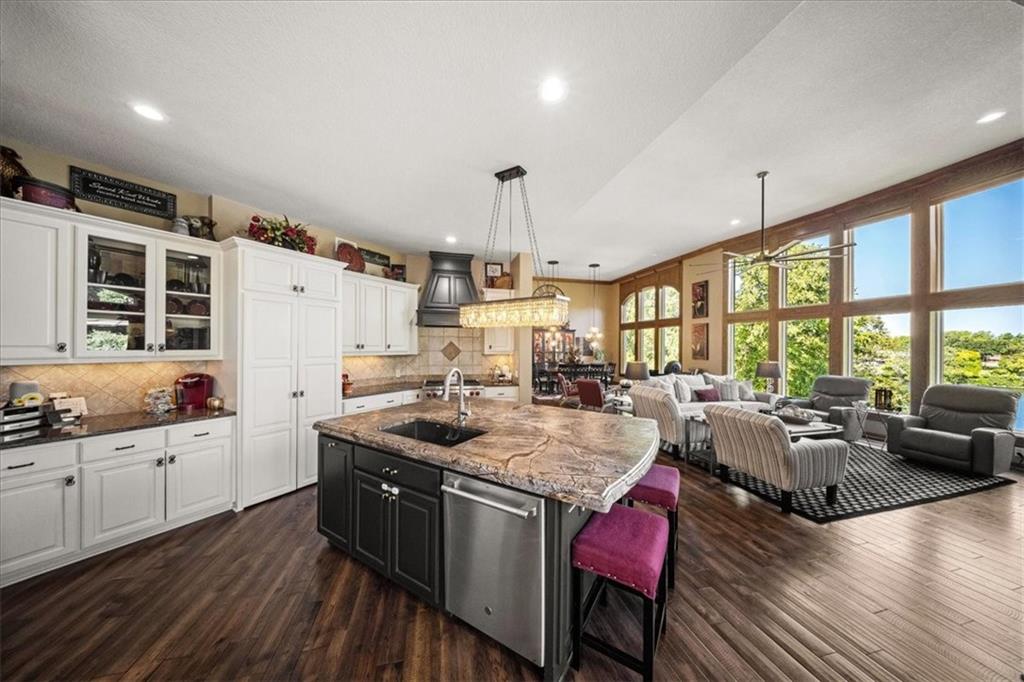 Just one word...STUNNING!! Enter into this magnificent lakefront reverse and be welcomed to breathtaking lake views from a two-story wall of glass across the entire living/dining area. This home blends elegance and comfort seamlessly. The great room boasts soaring vaulted ceilings highlighted by the floor-to-ceiling stone fireplace with unique gas logs and hickory hardwood flooring. Enjoy panoramic lake views from the oversize dining area, which includes a dry bar and beverage cooler, perfect for entertaining. Included in the open entertaining space is room for a baby grand! The spacious chef's kitchen features custom Brazilian granite top island, professional Wolf gas range, 3 electric ovens, a 4-foot wide refrigerator, and a full-size ice machine, plus a walk-in pantry. A private deck off the kitchen offers a quiet space for morning coffee. The main floor primary suite is a romantic getaway with a fireplace and cocktail deck. Generous size spa bath features a whirlpool tub, custom walk-in tiled tub shower, heated tile floors, plus a large walk-in closet completes the suite. Also included on the first floor is an office with a wall of bookcases and sweeping lake views with an abundance of natural light. The dramatic curved staircase to the tier's lower level invites you to a fabulous pool table/game room with a "tavern" bar area. Three more bedrooms, all with walk-in closets and access to private baths. BUT DON'T MISS THE MEDIA ROOM! Three-tiered seating makes movie night or game day special! Gorgeous outdoor living spaces professionally landscaped with two fire pit areas and two waterfalls. Private double-deck dock w/lake stairs, new boat lift, and 2 PWC lifts. Oversized 3-car garage plus 4th bonus area in the lower level, perfect for lake storage or exercise room. Too many upgrades to list... All this on a half-acre premium lake front lot! This is more than a home... It's a lifestyle designed for relaxation, recreation and lakefront living!