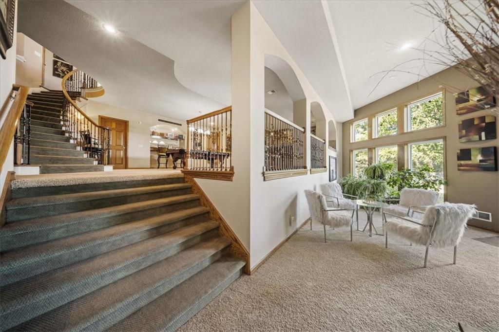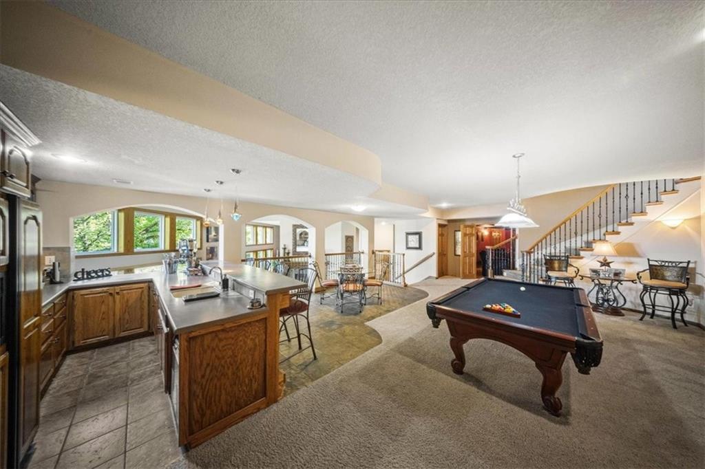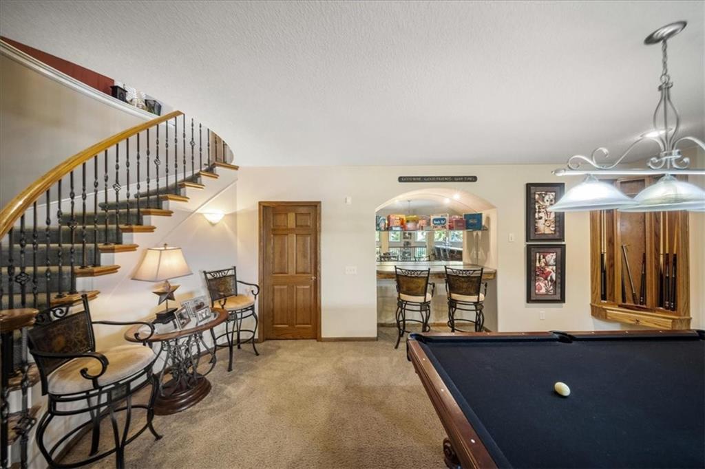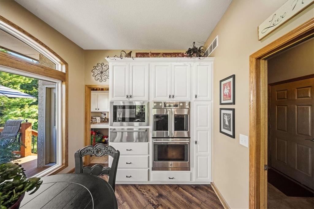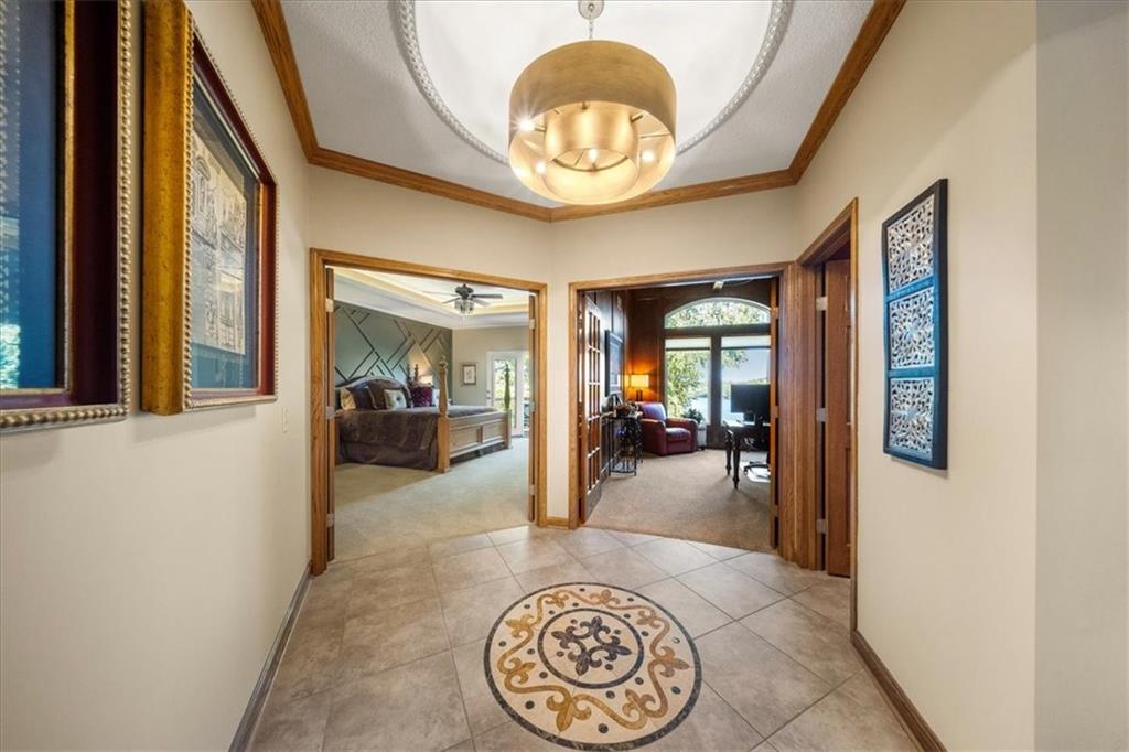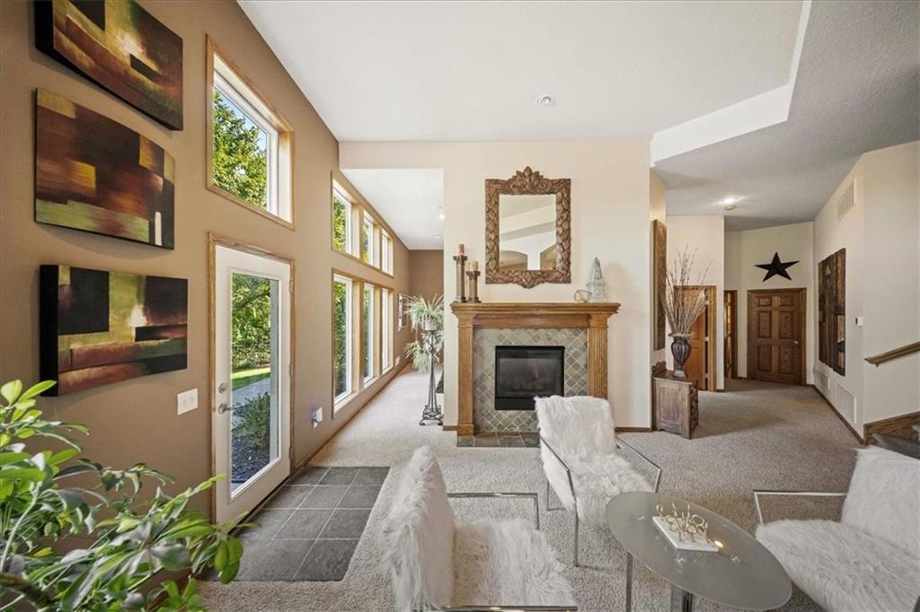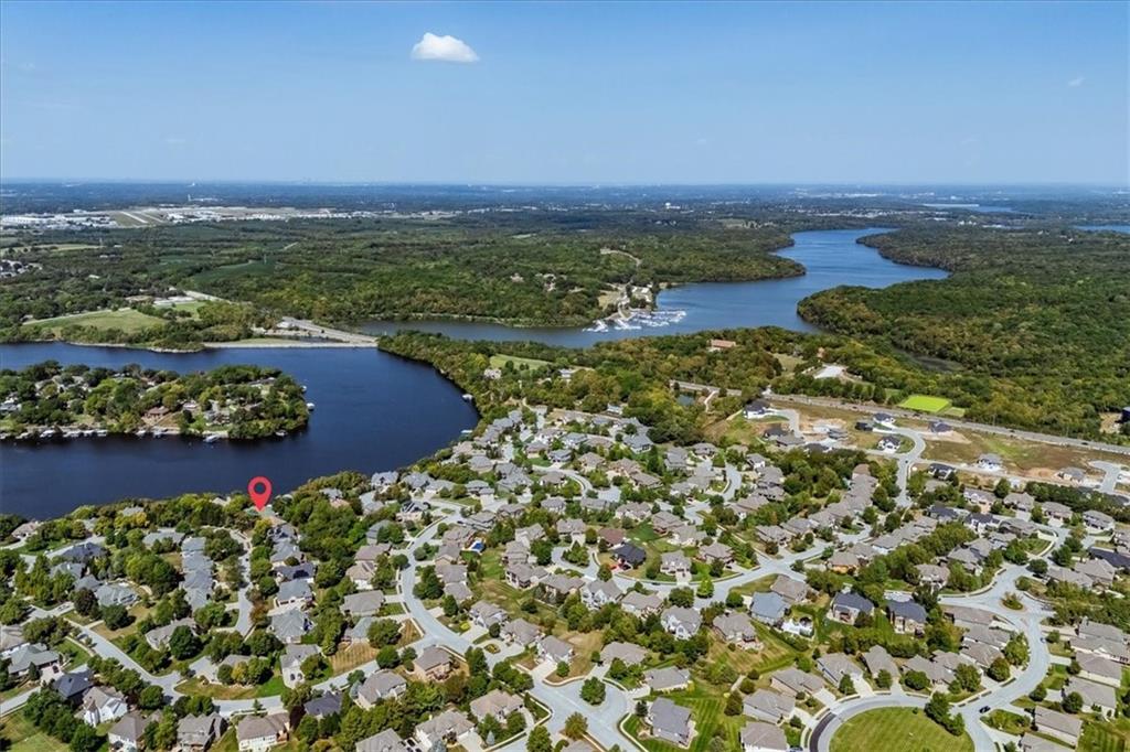 Just one word...STUNNING!! Enter into this magnificent lakefront reverse and be welcomed to breathtaking lake views from a two-story wall of glass across the entire living/dining area. This home blends elegance and comfort seamlessly. The great room boasts soaring vaulted ceilings highlighted by the floor-to-ceiling stone fireplace with unique gas logs and hickory hardwood flooring. Enjoy panoramic lake views from the oversize dining area, which includes a dry bar and beverage cooler, perfect for entertaining. Included in the open entertaining space is room for a baby grand! The spacious chef's kitchen features custom Brazilian granite top island, professional Wolf gas range, 3 electric ovens, a 4-foot wide refrigerator, and a full-size ice machine, plus a walk-in pantry. A private deck off the kitchen offers a quiet space for morning coffee. The main floor primary suite is a romantic getaway with a fireplace and cocktail deck. Generous size spa bath features a whirlpool tub, custom walk-in tiled tub shower, heated tile floors, plus a large walk-in closet completes the suite. Also included on the first floor is an office with a wall of bookcases and sweeping lake views with an abundance of natural light. The dramatic curved staircase to the tier's lower level invites you to a fabulous pool table/game room with a "tavern" bar area. Three more bedrooms, all with walk-in closets and access to private baths. BUT DON'T MISS THE MEDIA ROOM! Three-tiered seating makes movie night or game day special! Gorgeous outdoor living spaces professionally landscaped with two fire pit areas and two waterfalls. Private double-deck dock w/lake stairs, new boat lift, and 2 PWC lifts. Oversized 3-car garage plus 4th bonus area in the lower level, perfect for lake storage or exercise room. Too many upgrades to list... All this on a half-acre premium lake front lot! This is more than a home... It's a lifestyle designed for relaxation, recreation and lakefront living!