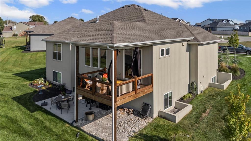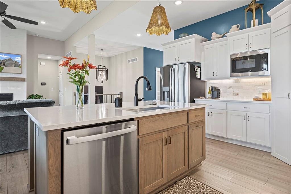 Better than new! Lovely four-bedroom reverse one and a half story by Pfannes Homes with tons of upgrades on a quiet cul-de-sac. Quartz counters, stainless steel appliances, upgraded lighting and hardware throughout, wood floors on main level. Large rec room area on the daylight lower level +2 bedrooms and a third-full bathroom and loads of storage space! Award-winning Basehor-Linwood school district!