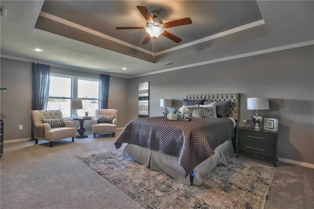 The popular Levi II by Prieb Homes is now available on a beautiful flat lot, with a tentative completion date of March 2026. This updated version of the beloved original Levi plan offers expanded square footage and premium upgrades throughout. The open-concept main floor features a spacious kitchen and breakfast area, a larger granite center island with ample seating, and upgraded granite countertops in the kitchen. Kitchen offers soft closet doors and drawers. Enjoy versatile living with a main floor flex room—perfect for a home office or 5th bedroom—plus a mud room with boot bench and entry closet. Upstairs, the expanded master suite boasts a separate sitting area, larger walk-in closet for 2 different sections, and an upgraded primary bath with a freestanding tub. The laundry room has been enhanced with additional workspace, and the open loft with window provides extra living space. Located within walking distance to Lake Olathe, this home also offers access to neighborhood amenities including trails, a pool, and playground. Don’t miss your chance to own this upgraded and spacious home in a prime location!