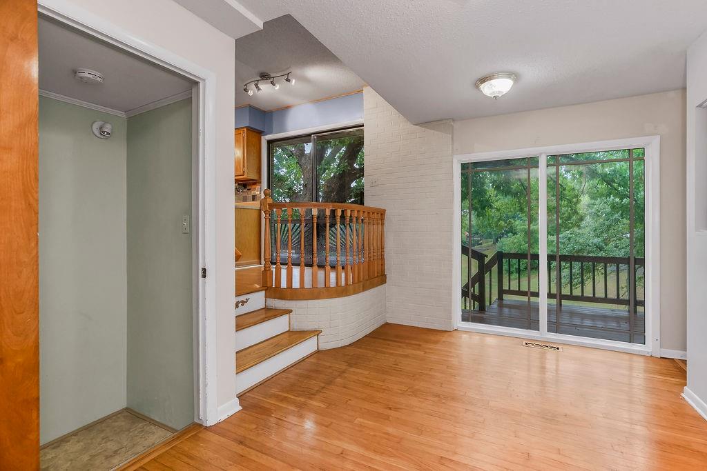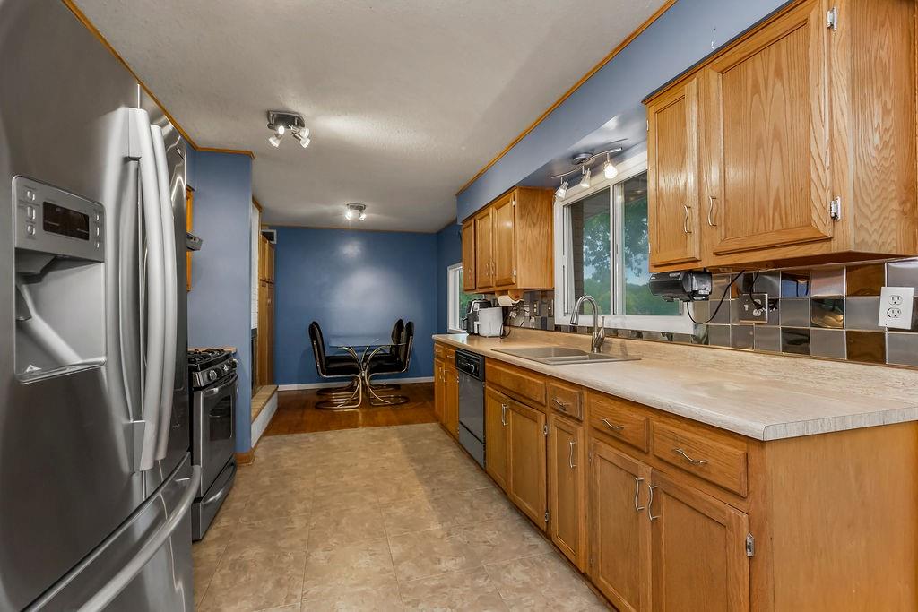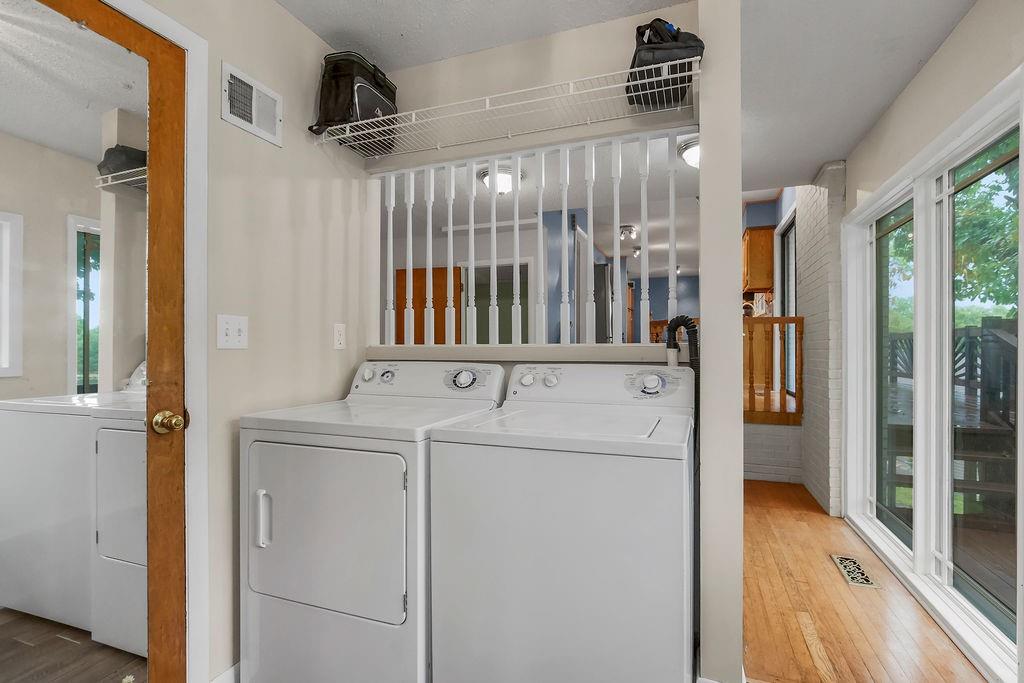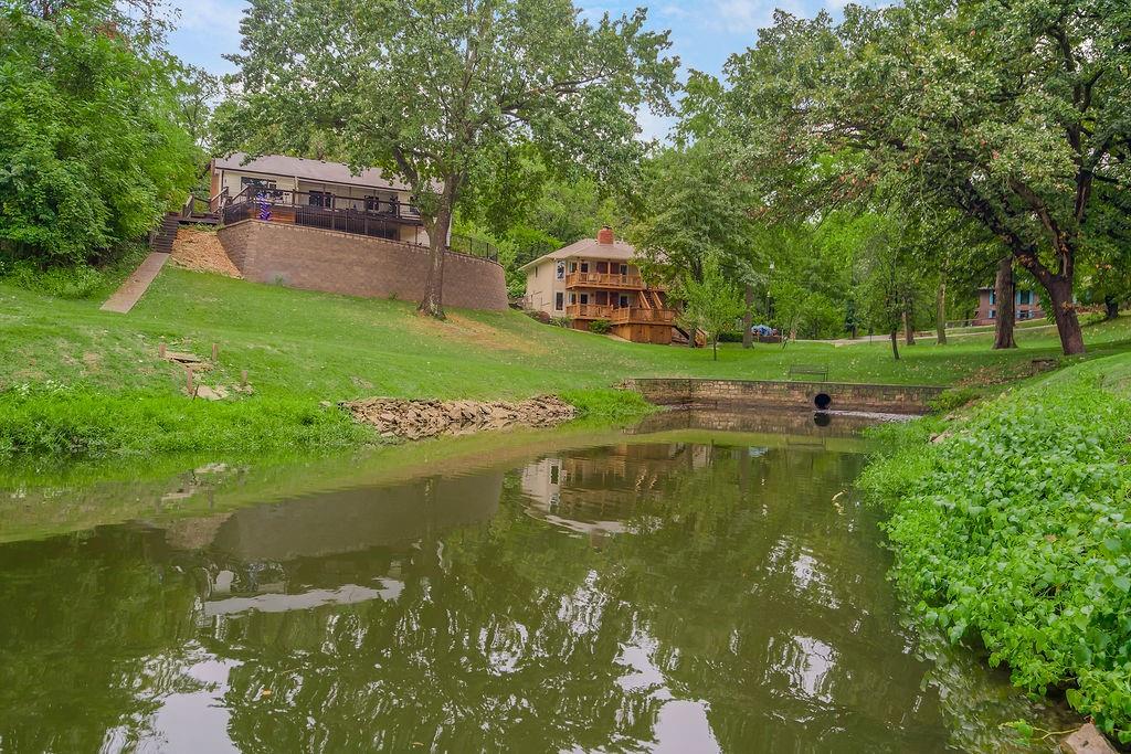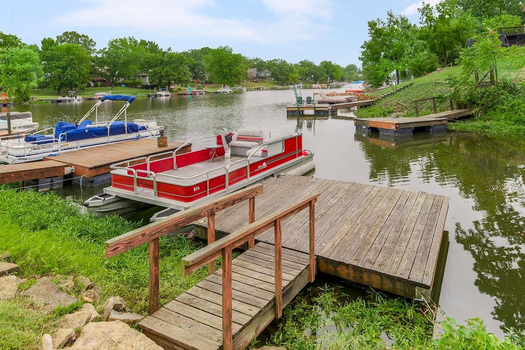 Welcome to your first Lake Waukomis home—where lake living and everyday comfort meet! This 3-bedroom, 2-bathroom home is filled with character and lake views. The double-door entry leads into a spacious living room featuring wood floors, vaulted ceilings with wood beams, a bay window, and a see-through fireplace connecting to the kitchen. The kitchen is equipped with stainless steel appliances, a pantry, and a lake view from the sink, plus walkout access to a double deck that spans the length of the home—perfect for entertaining or simply enjoying the peaceful water. A main-floor laundry room, full bath, and office area add convenience and flexibility. Upstairs, you’ll find three bedrooms with wood floors and a full bath with double vanity. The finished walk-out basement offers a cozy fireplace, a huge workshop, and direct access to a covered patio. From here, steps lead down through a shady backyard to your private dock. Experience the charm of Lake Waukomis living with fishing, boating, and community events right at your doorstep!