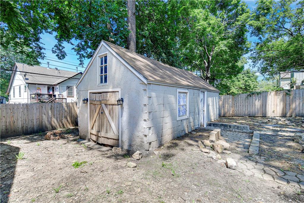 This inviting home features a classic layout with recently updated hardwood and tile floors on the main level. The remodeled eat-in kitchen offers granite countertops, ample cabinet space + pantry storage. A versatile side room can serve as a mudroom with walk-in pantry, a home office or a spacious dining area. Finished walkout lower level includes a recreation room, laundry, storage and possible third bedroom with full bath. A massive detached two-car garage provides exceptional storage, while the additional powered outbuilding is perfect for a potting shed, workshop, or even a fun backyard Tiki bar. Relax or entertain on the spacious two-level deck, ideal for BBQs and gatherings. Enjoy the walkable location near restaurants and shops, with quick highway access and the sought-after Shawnee Mission School District. Situated in friendly Downtown Overland Park, you'll have easy access to a vibrant array of local restaurants, shops and parks. Explore the OP farmer's market, stroll quaint Downtown shops, visit area historical attractions + museums. Boutique shop, or dine at one of the many nearby eateries – the possibilities are endless.