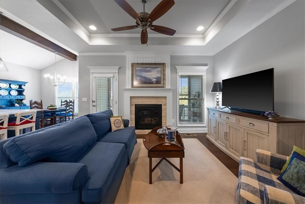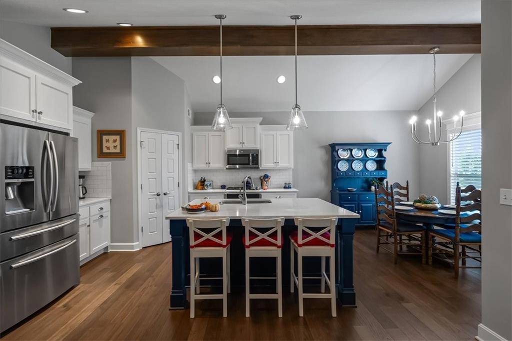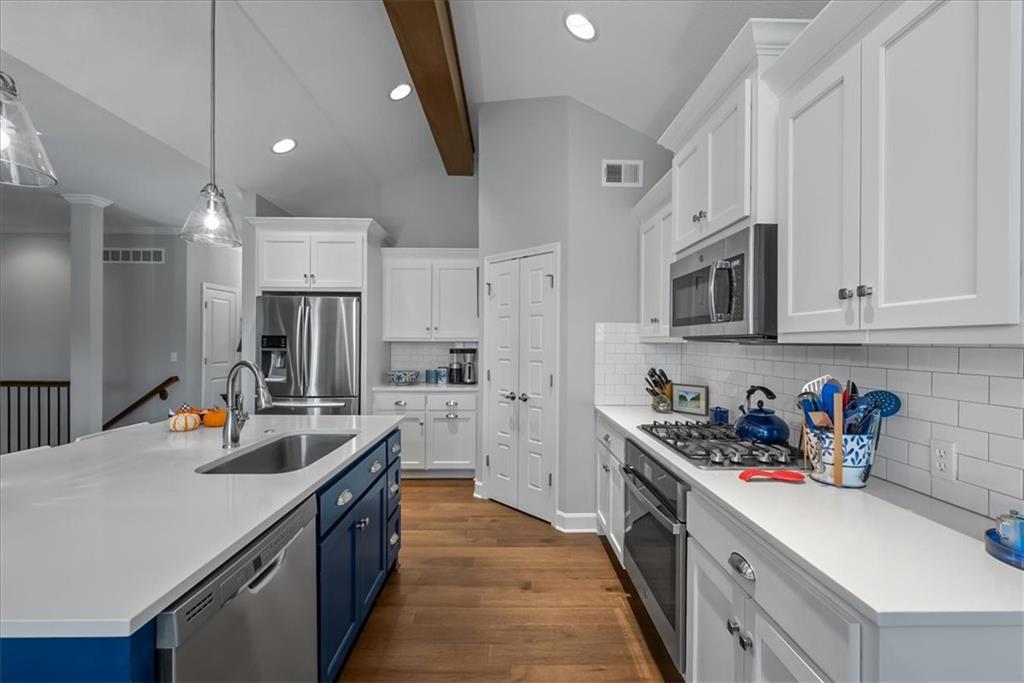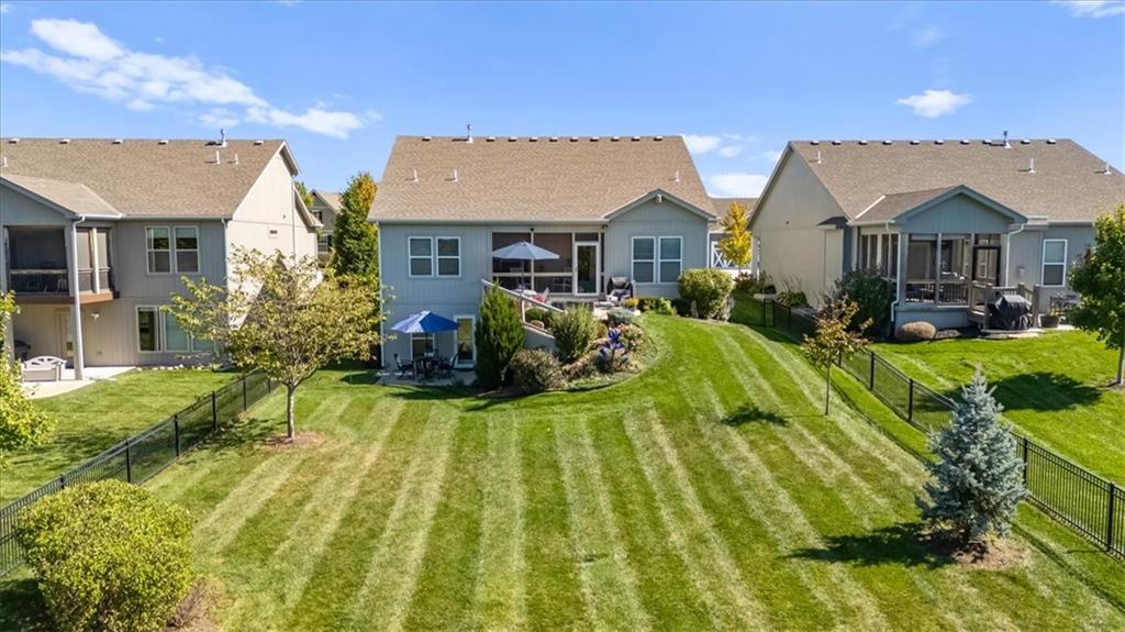 Welcome to this beautiful reverse 1.5-story villa in the Enclave at Prairie Star. This light maintenance-provided home offers 4 bedrooms, 3 full baths, and a bright open layout. The main level boasts a spacious great room with gas fireplace, a chef’s kitchen with large island, custom cabinets, granite counters, and walk-in pantry, plus the convenience of laundry and two bedrooms including the primary suite. Step outside to the screened-in patio overlooking the backyard—perfect for relaxing or entertaining. The finished lower level adds a large recreation room, two bedrooms with walk-in closets, a full bath, and plenty of storage. Move-in ready and thoughtfully designed, this home combines comfort, style, and low-maintenance living. These don't become available often. The most recent MLS sale in the subdivision was over 2 years ago so get your showing scheduled!
