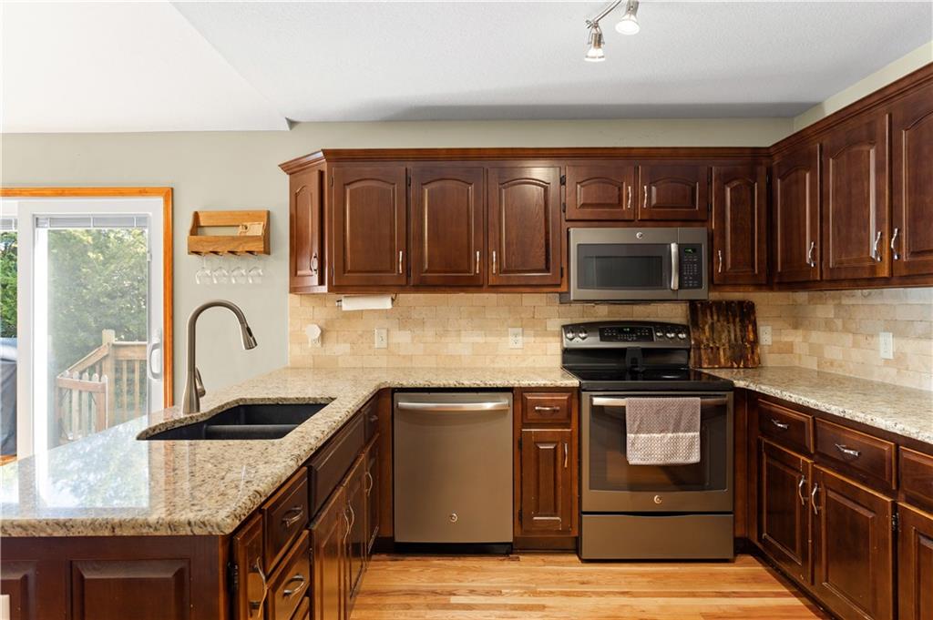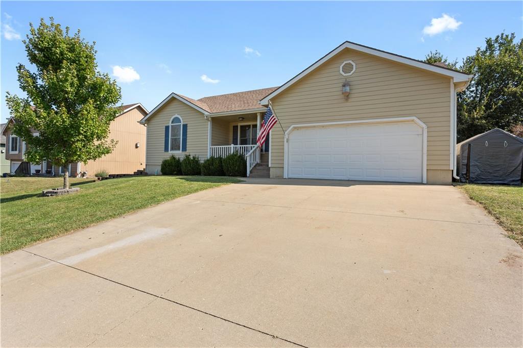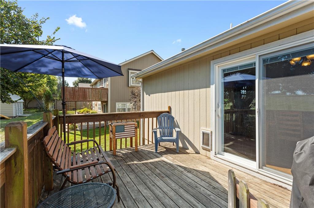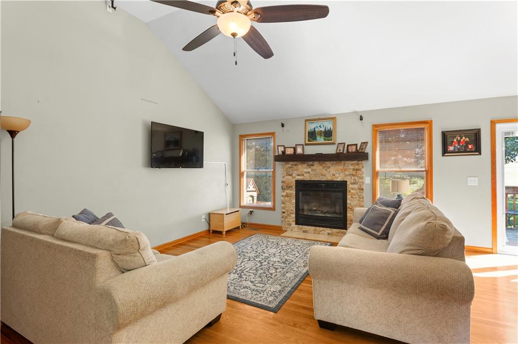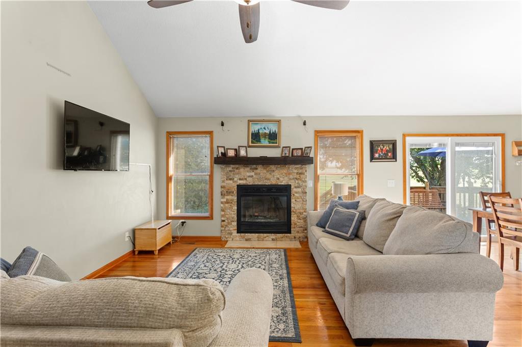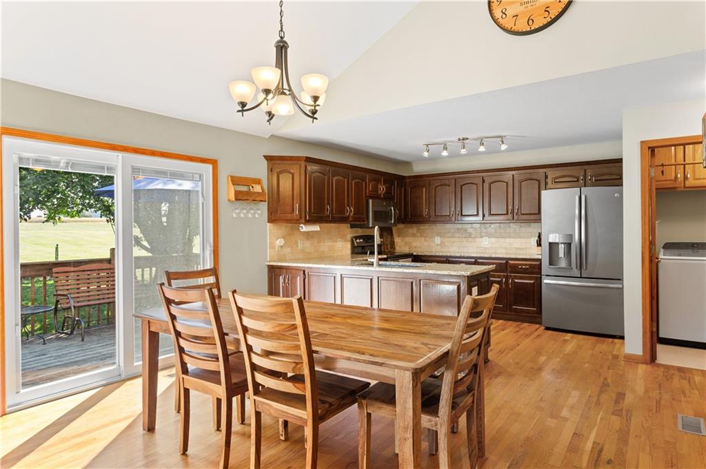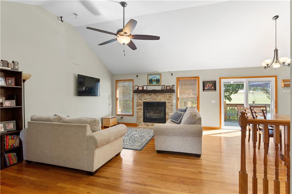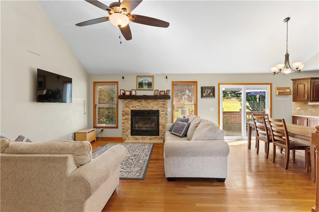 This beautifully maintained true ranch home features a spacious open floor plan and a host of modern upgrades. The updated kitchen boasts custom cabinetry, granite countertops, stylish fixtures, and designer lighting—perfect for both cooking and entertaining. The inviting living room showcases soaring vaulted ceilings, a striking stone fireplace, and gleaming hardwood floors, creating a warm and elegant atmosphere. Enjoy peaceful summer evenings on the serene back deck or unwind on the large front porch. The primary suite includes an updated bathroom with tiled floors and a luxurious walk-in shower. Located in the quiet and desirable Prairie Estates neighborhood, this home offers unbeatable highway access and is just steps from the elementary school—making it ideal for families and commuters alike!