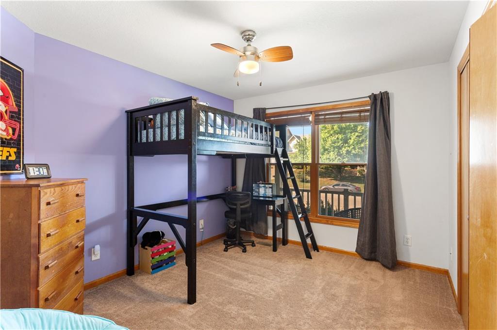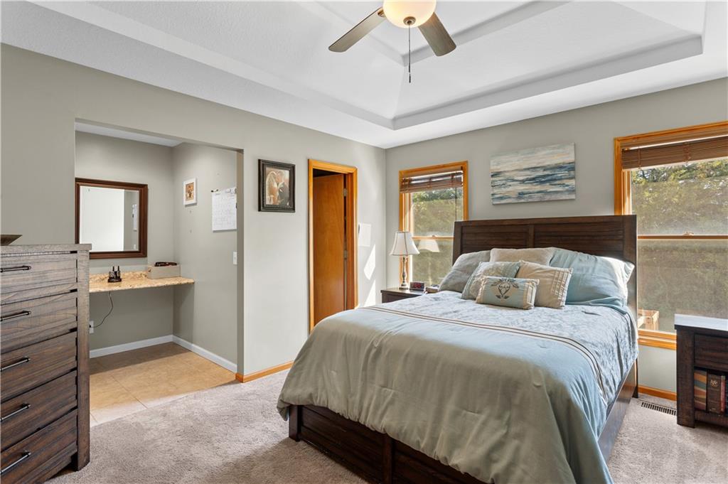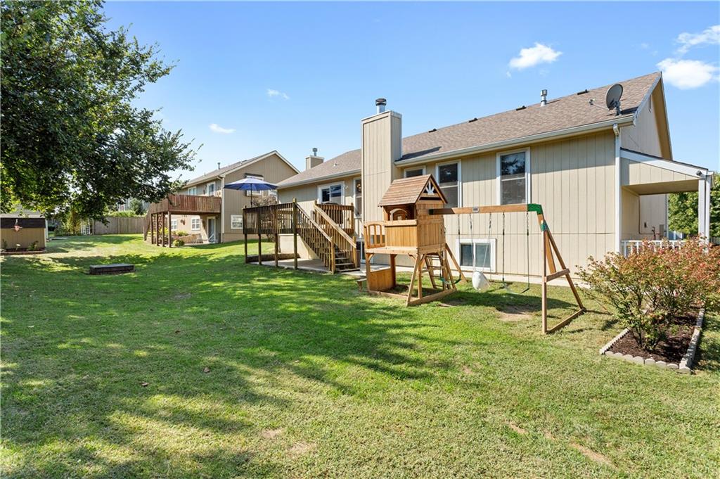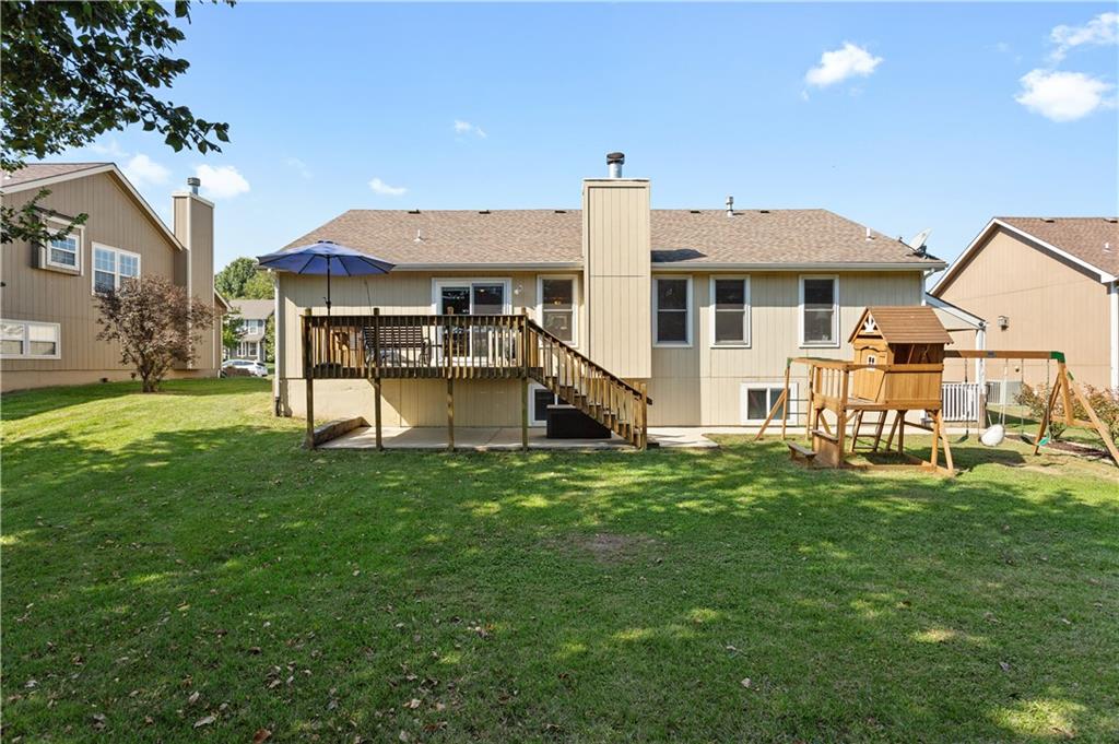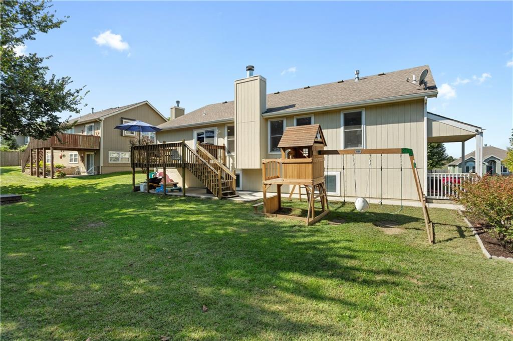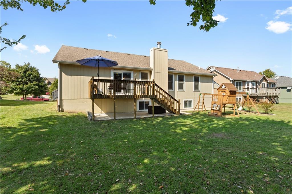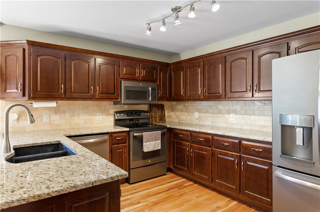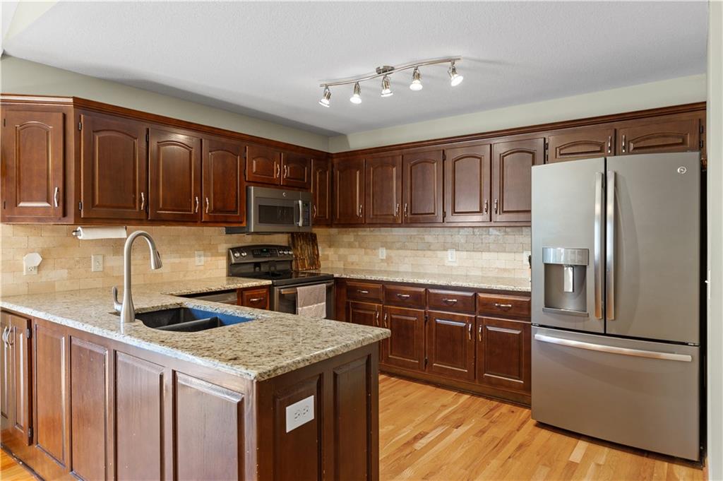This beautifully maintained true ranch home features a spacious open floor plan and a host of modern upgrades. The updated kitchen boasts custom cabinetry, granite countertops, stylish fixtures, and designer lighting—perfect for both cooking and entertaining. The inviting living room showcases soaring vaulted ceilings, a striking stone fireplace, and gleaming hardwood floors, creating a warm and elegant atmosphere. Enjoy peaceful summer evenings on the serene back deck or unwind on the large front porch. The primary suite includes an updated bathroom with tiled floors and a luxurious walk-in shower. Located in the quiet and desirable Prairie Estates neighborhood, this home offers unbeatable highway access and is just steps from the elementary school—making it ideal for families and commuters alike!
