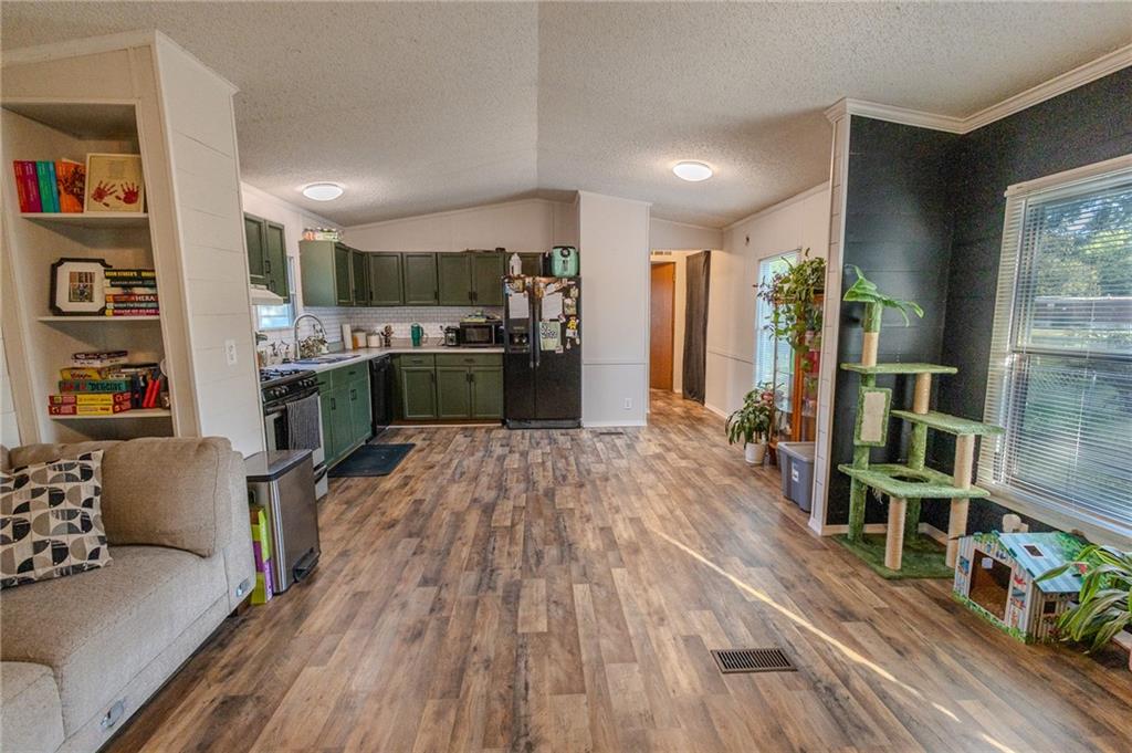 Check out this charming 3Br 2Ba spacious open concept single-wide mobile home. It offers cathedral ceilings making the home feel even more spacious. This home offers new flooring in the living/kitchen area as well as down the hallways. One bathroom has been completely renovated. It has new shiplap, some fresh paint and recently painted kitchen cabinets. All bedrooms offer decently sized closets. It has a large primary bedroom with a large primary bathroom. It offers a family/pet friendly covered front deck/porch and a partially fenced in yard. It has a large two car detached garage with a work area. This property is being sold "As Is." (Agents please note the agent remarks.)