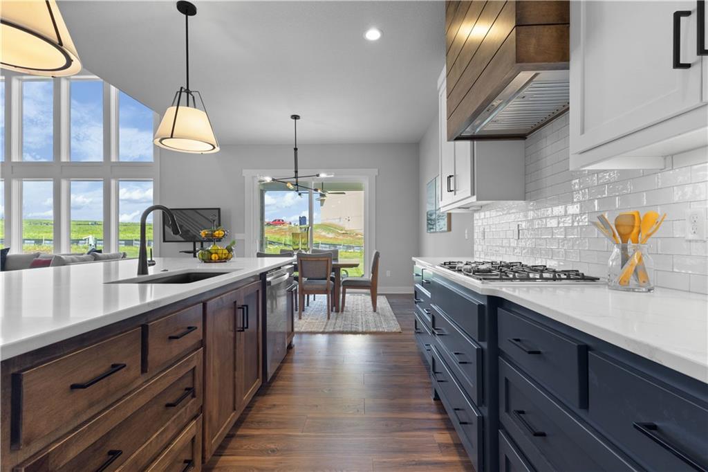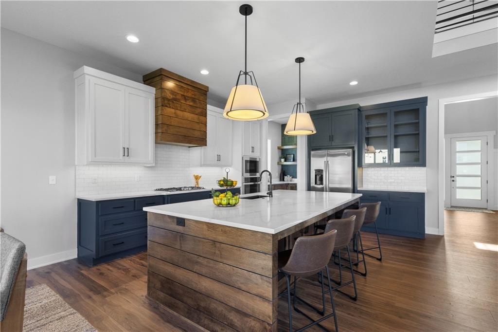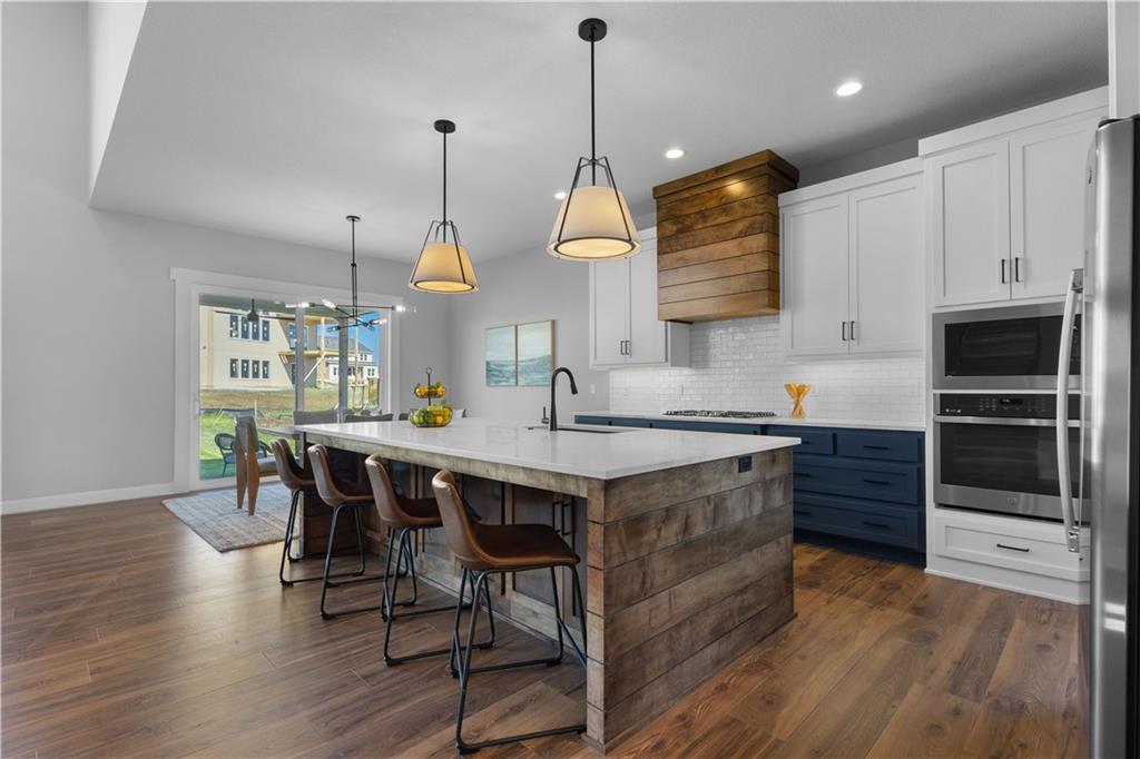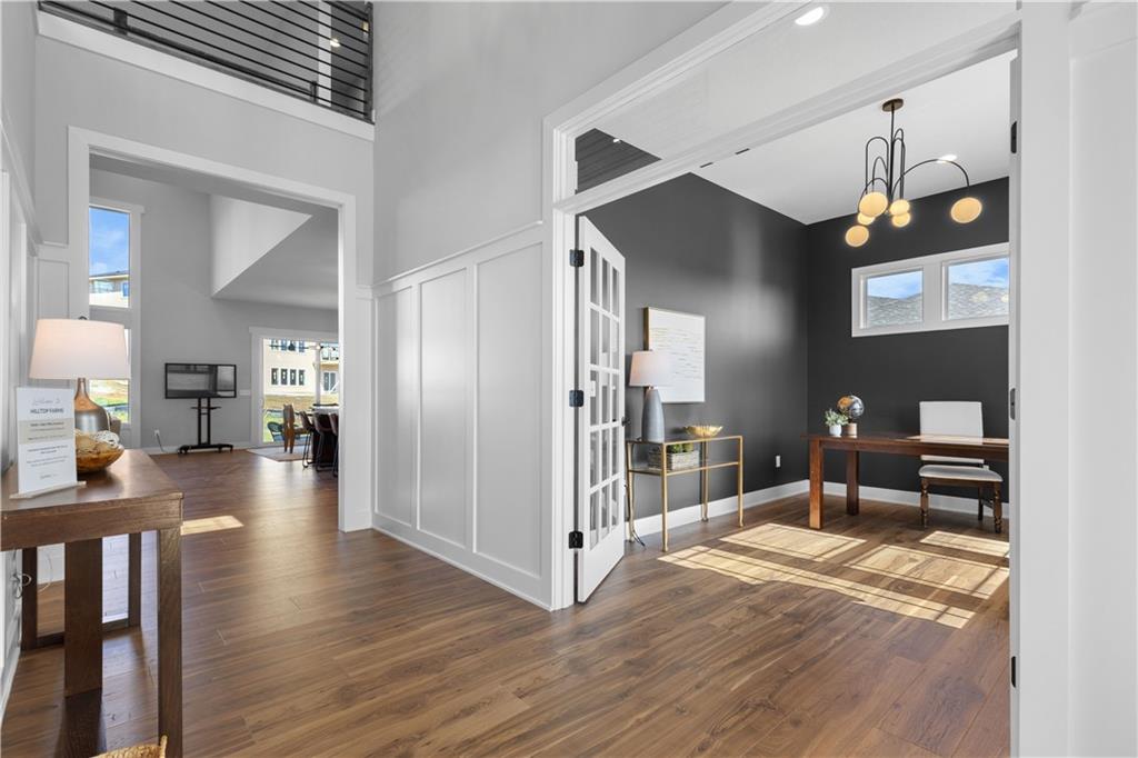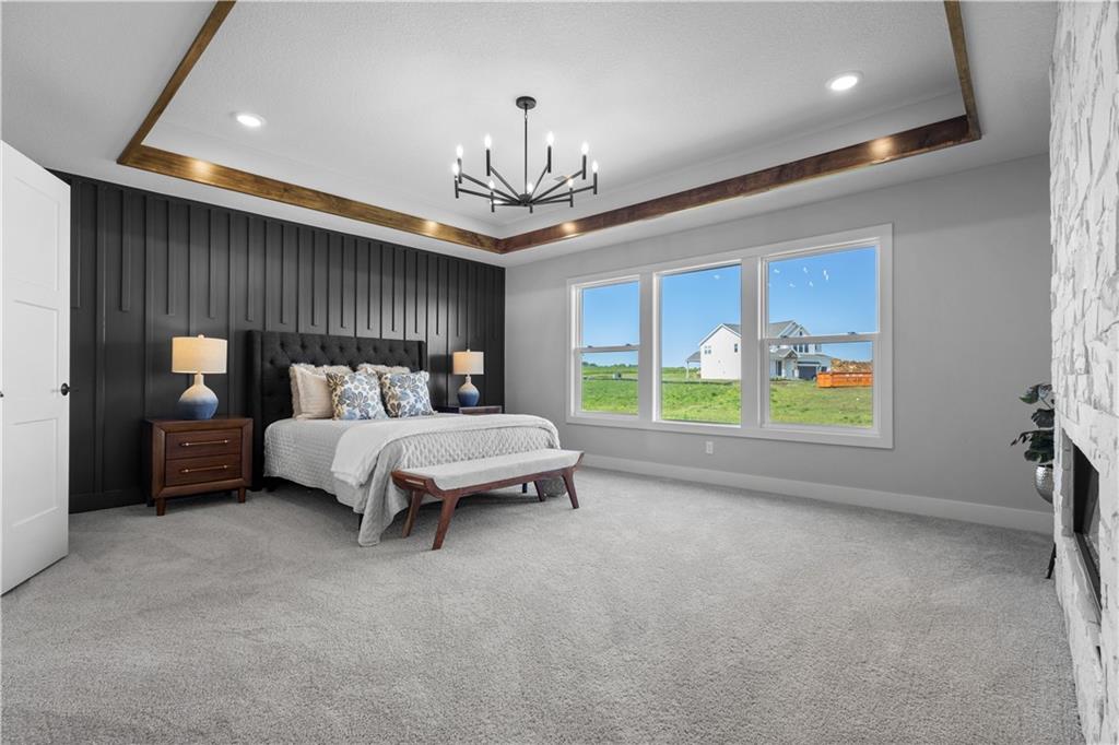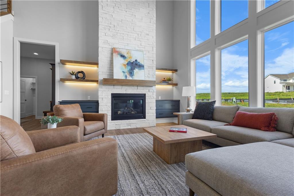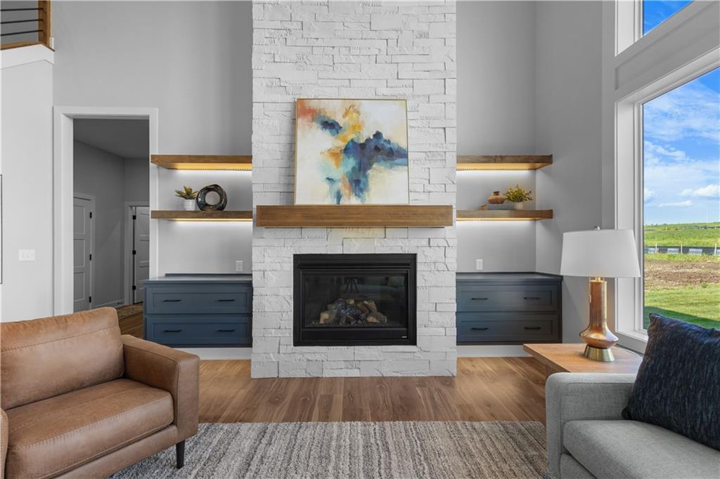 Welcome to The Opus II — a modern farmhouse masterpiece blending timeless charm with sophisticated design. This stunning home features six spacious bedrooms, five full baths, and a dedicated main-floor office, offering the perfect balance of comfort and versatility. The chef-inspired kitchen is the heart of the home, showcasing stunning quartz countertops, an L-shaped prep kitchen, and rose gold cabinet hardware that adds a touch of modern glamour. A convenient boot bench with drop zone keeps daily life organized, while the extended three-car driveway provides both practicality and curb appeal. The great room impresses with a floor-to-ceiling stone fireplace and elegant built-in cabinetry with floating shelves, creating a warm and welcoming focal point. Throughout the home, the modern trim package, wainscoting, and sleek black interior hardware elevate every detail with refined style. Downstairs, the finished lower level is designed for entertaining, complete with a wet bar peninsula, full-sized refrigerator, and an additional bedroom and full bath. Every element of The Opus II reflects thoughtful craftsmanship and luxurious comfort—perfectly suited for both lively gatherings and peaceful everyday living.
