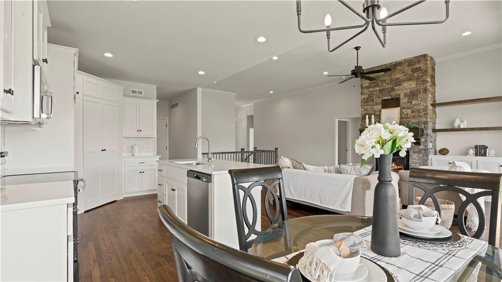 Clay Meadows welcomes this beautiful Custom "Taya" plan. A well-designed layout offering 4 Bedrooms, 3.5 Baths and a Main Level Master Suite. Bedroom 2 is also on this level and would make a great home office. The Open layout with Floor to Ceiling Windows offer the perfect view! The Living Room has a gorgeous Stone Fireplace accented with floating shelves and built-in cabinets. Beautiful Hardwood Floors. Kitchen features Solid Surface Quartz Countertops, Island, Stainless Appliances, Custom built cabinets and a huge Walk-in Pantry that doesn't disappoint! Access the Oversized Covered Deck from both the Master Suite and Breakfast area. The Lower Level has a HUGE Rec Room, 2 more Bedrooms, Full Bath and a Patio at the Walkout Basement. Lots of storage in the basement. Close to local amenities, Historic Downtown Liberty, Walking trails and community pool.