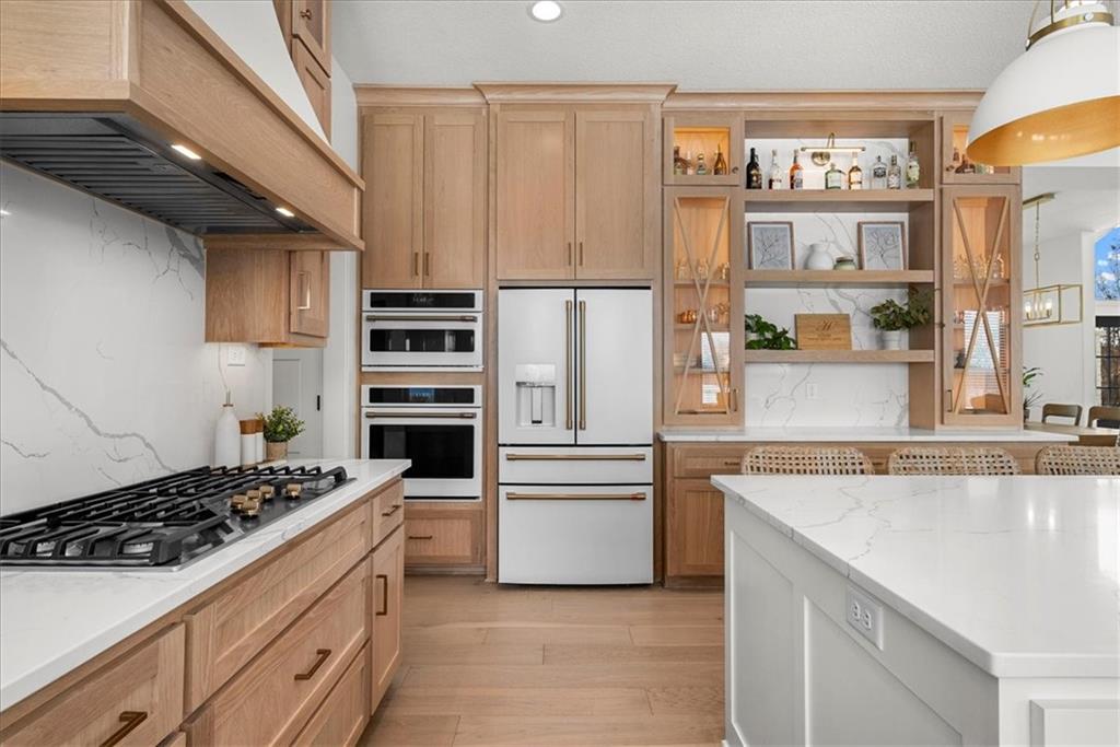 Only 20 min away from Downtown KC, in award winning Park Hill School District. Experience LUXURY, and PRIVACY in this stunningly custom designed 4-bedroom, 3.5-bath modern farmhouse—set on the LARGEST and most PRIVATE lot in the neighborhood, nearly HALF AN ACRE with no neighbors on three sides! Step inside to discover engineered hardwood floors, soaring 10 ft ceilings, and designer-grade finishes throughout. The chef’s kitchen commands attention with custom white oak cabinetry, quartz countertops that extend to the ceiling for a seamless backsplash (no subway tile here!), designer Café appliances with custom ordered handles to match the cabinet hardware and an extended island offering additional seating and storage—perfect for gatherings and entertaining. The spacious living room is anchored by a bold black fireplace surrounded by custom shelving and natural wood accents, creating warmth and sophistication in every detail. Upstairs, retreat to the luxurious primary suite featuring a freestanding soaking tub, luxury high gloss tile, double vanities, and an expansive walk-in closet. Designed for comfort and EFFICIENCY, the home features two A/C units, upgraded heating systems, and an oversized water heater. The extra-tall garage easily accommodates trucks or large SUVs—rare for the area. Outdoors, enjoy unmatched privacy and open green space in the extended newly poured patio. Sellers are willing to negotiate a new iron gate fence around full backyard with acceptable offer! Perfect to enclose for pets! Basement is ready for your finishing touches! Add a full guest suite, bar area, rec room, etc. Many possibilities! The Reserve at Riverstone is in a prime Northland location, with top-rated schools, easy access to highways, the airport, shopping, & restaurants. There is a community swimming pool & trails.