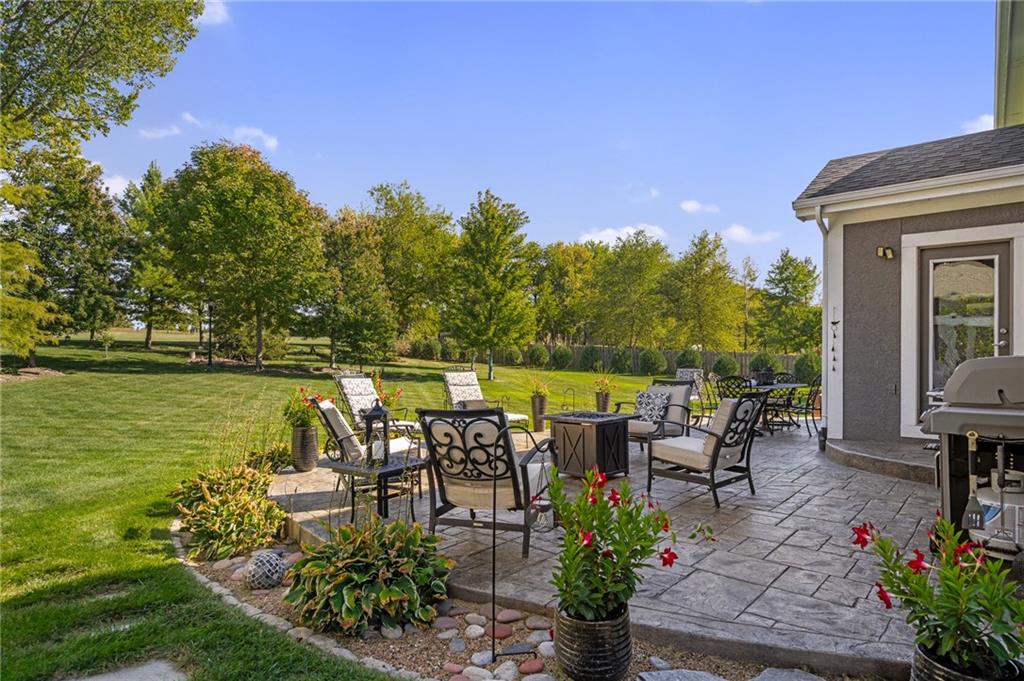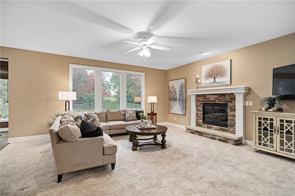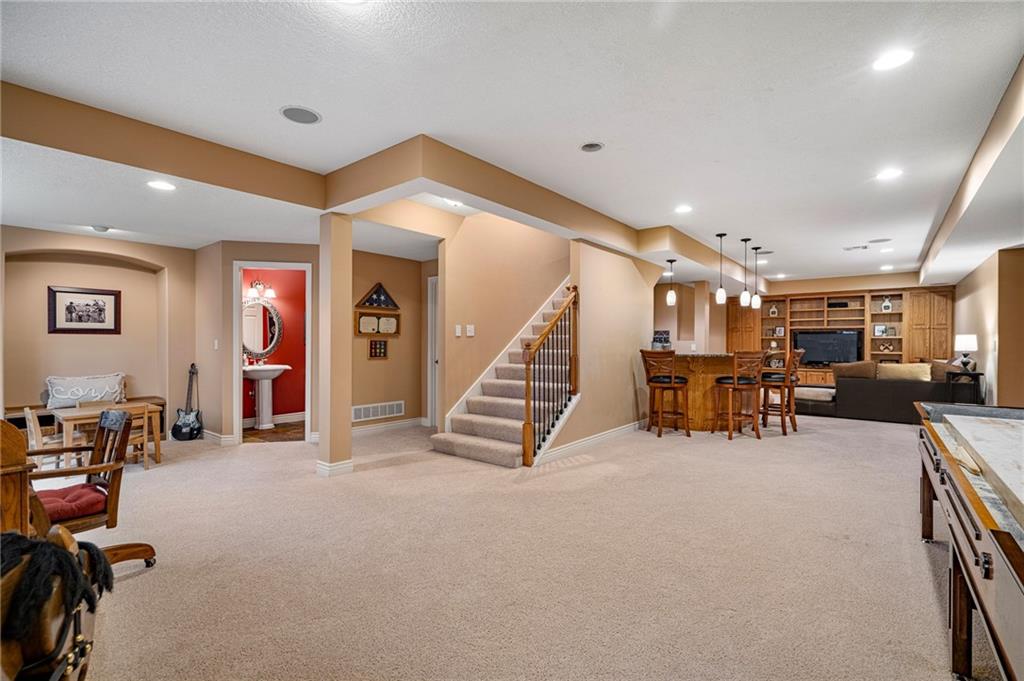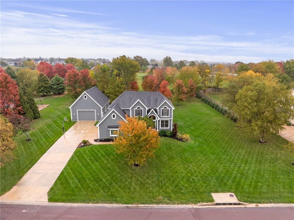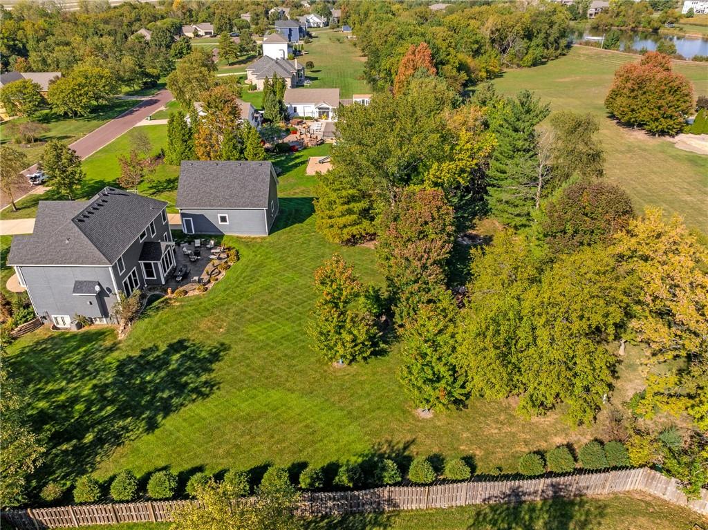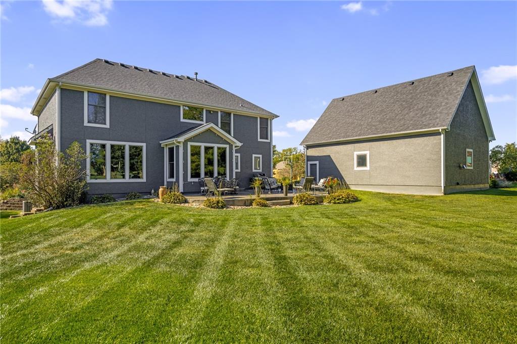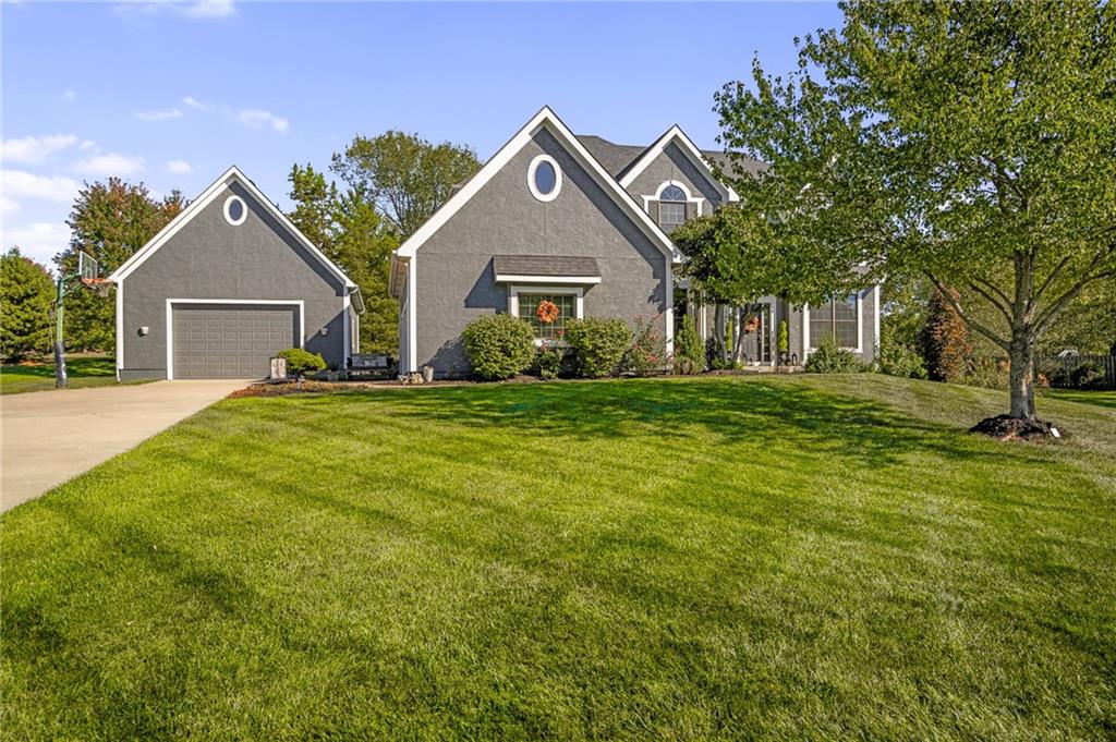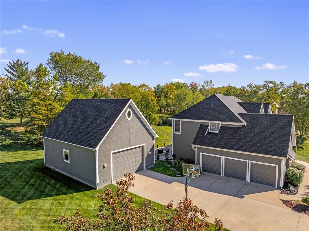 Morse Village Estates stunner! Picturesque setting on 1.1 acre lot surrounded with views of private, treed oasis. Main level flows seamlessly from the kitchen to the great room, den/study and entry or just a few steps outside to the expansive backyard patio. Primary bedroom offers a true retreat with sitting room, serene bathroom and oversized primary closet. Five car garage spaces including the must see 29'x38' detached garage for car or hobby enthusiasts, storage, sports, entertain/party or attic offers potential for added space, endless options! Roomy secondary bedrooms and closets. Secondary bedroom with wow-factor loft/bunk space. Lower level offers game room, media space, wet bar, half bath and cozy sitting area. New roof, full-yard irrigation system, updated kitchen counters, fresh paint, squeaky clean and beautifully maintained. Lot has space for pool, sport court and room to spare. Blue Valley Schools, trails, parks, restaurants, entertainment and highway access are all nearby.