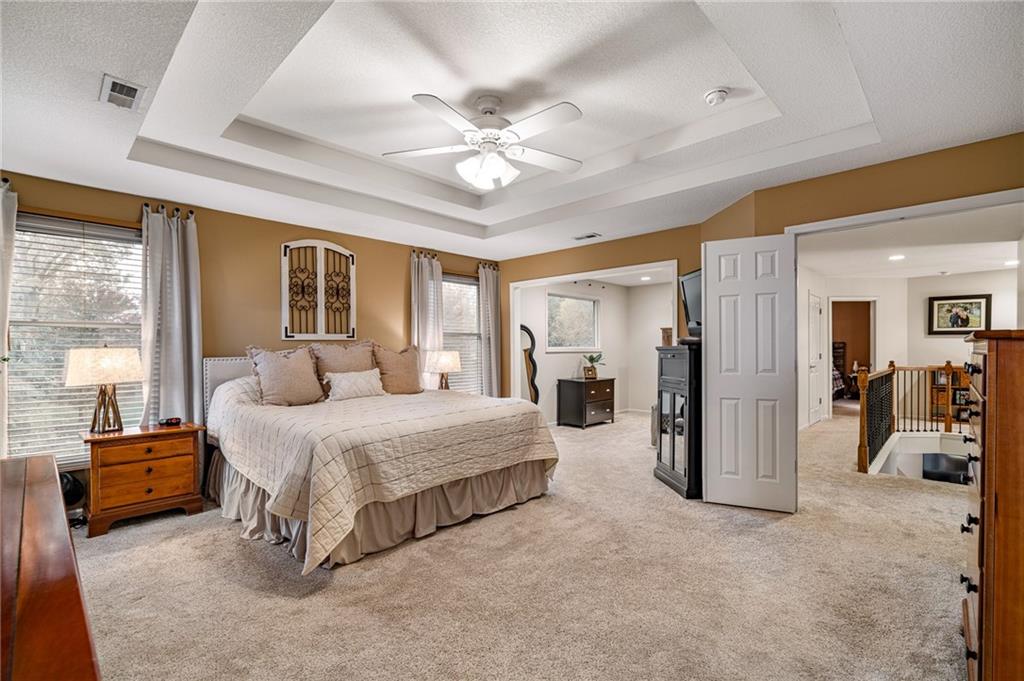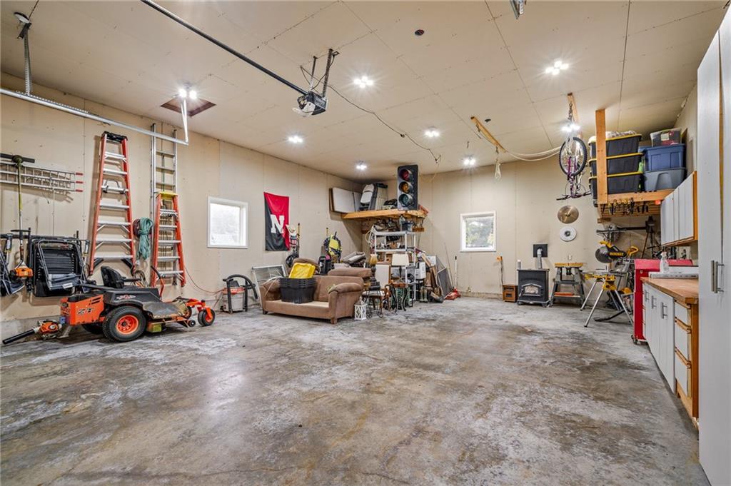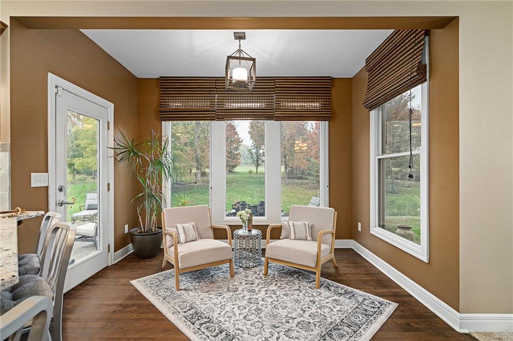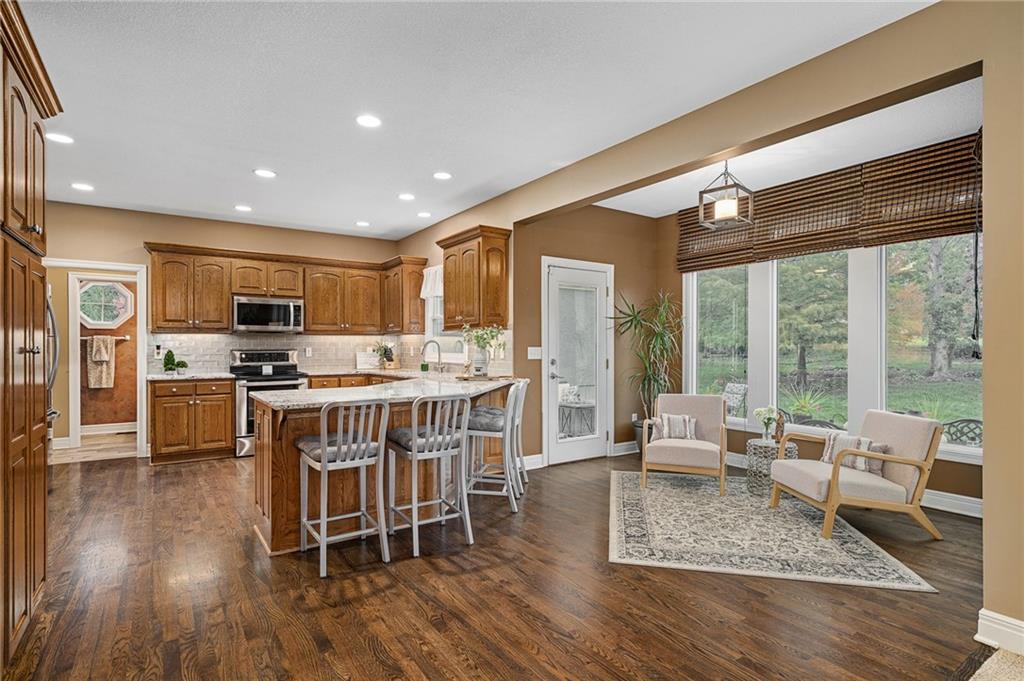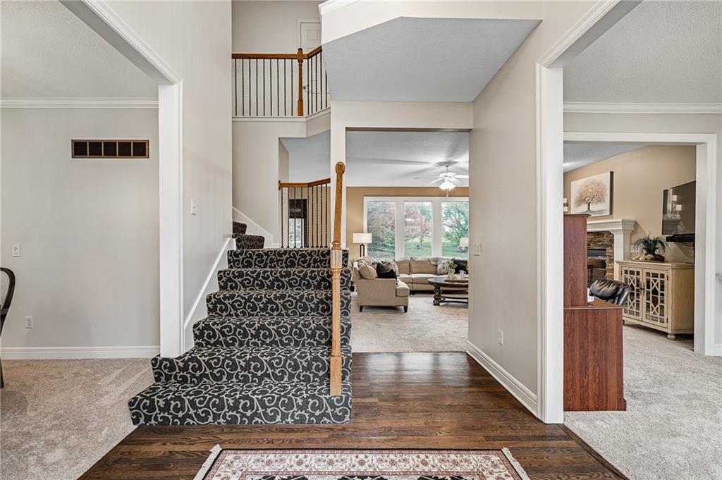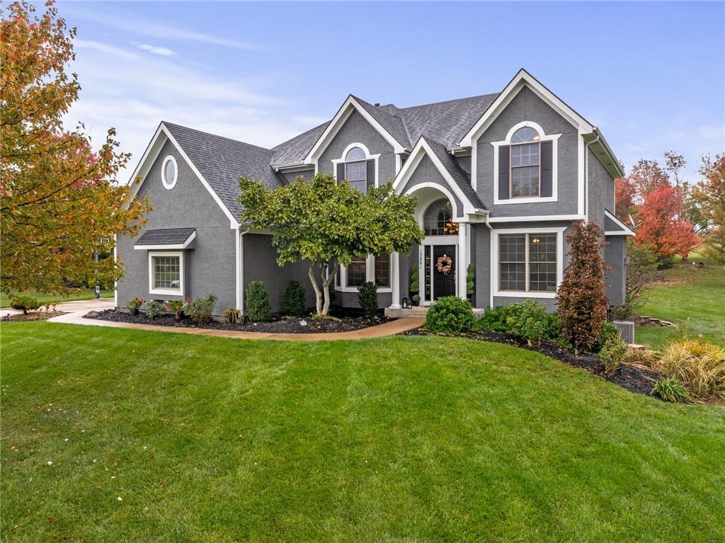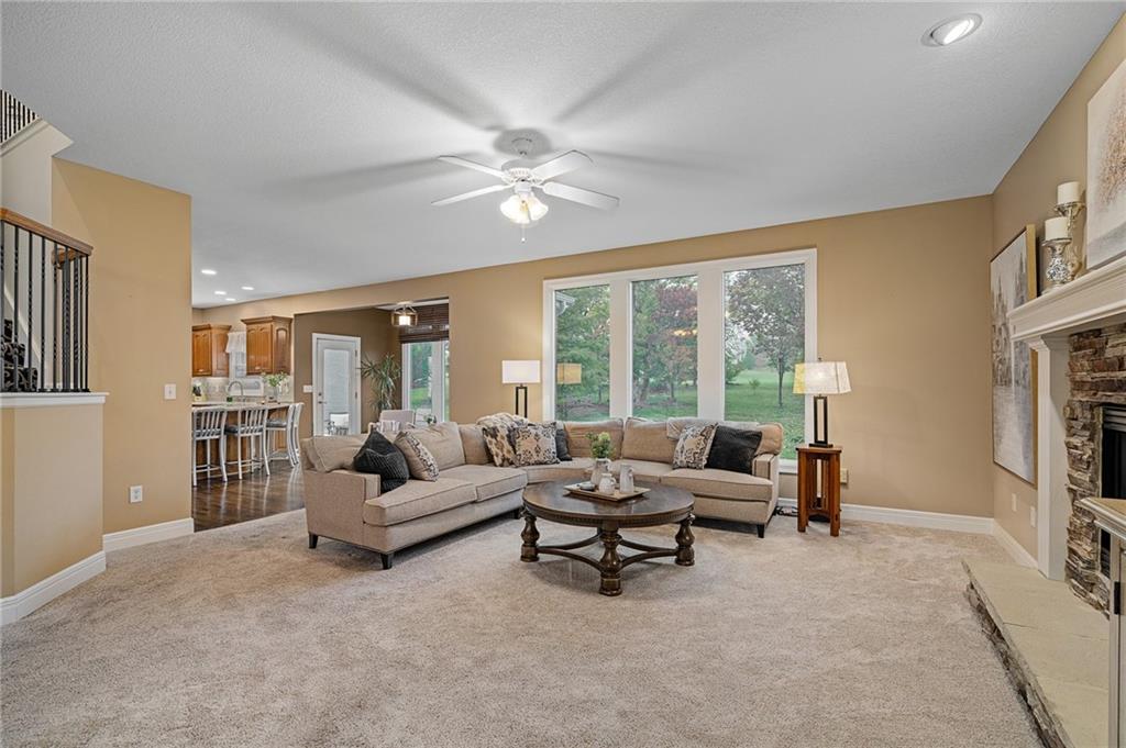 Morse Village Estates stunner! Picturesque setting on 1.1 acre lot surrounded with views of private, treed oasis. Main level flows seamlessly from the kitchen to the great room, den/study and entry or just a few steps outside to the expansive backyard patio. Primary bedroom offers a true retreat with sitting room, serene bathroom and oversized primary closet. Five car garage spaces including the must see 29'x38' detached garage for car or hobby enthusiasts, storage, sports, entertain/party or attic offers potential for added space, endless options! Roomy secondary bedrooms and closets. Secondary bedroom with wow-factor loft/bunk space. Lower level offers game room, media space, wet bar, half bath and cozy sitting area. New roof, full-yard irrigation system, updated kitchen counters, fresh paint, squeaky clean and beautifully maintained. Lot has space for pool, sport court and room to spare. Blue Valley Schools, trails, parks, restaurants, entertainment and highway access are all nearby.