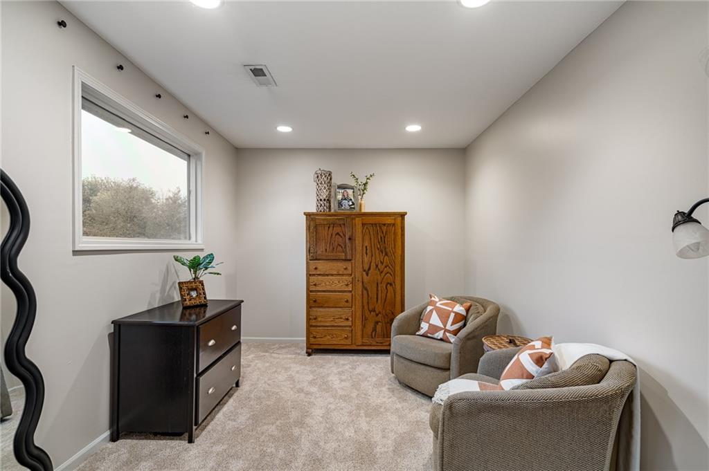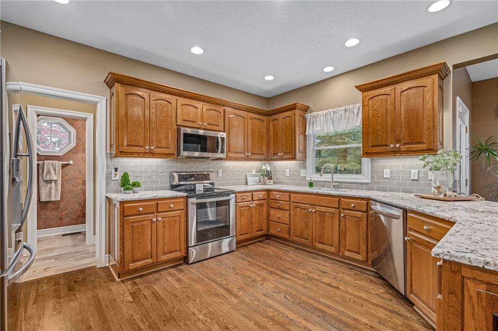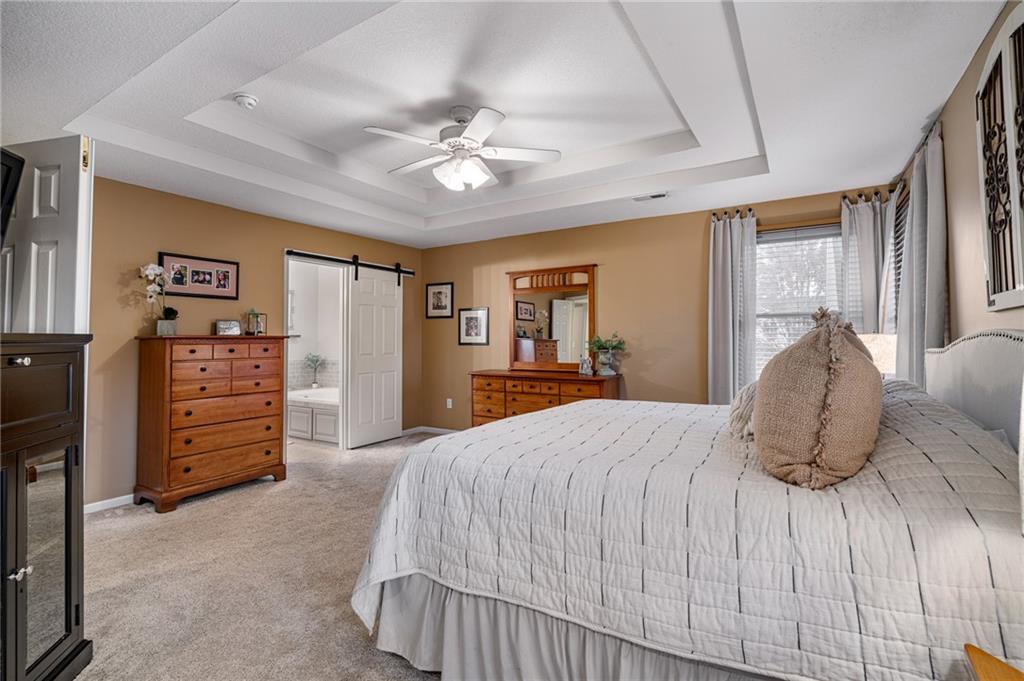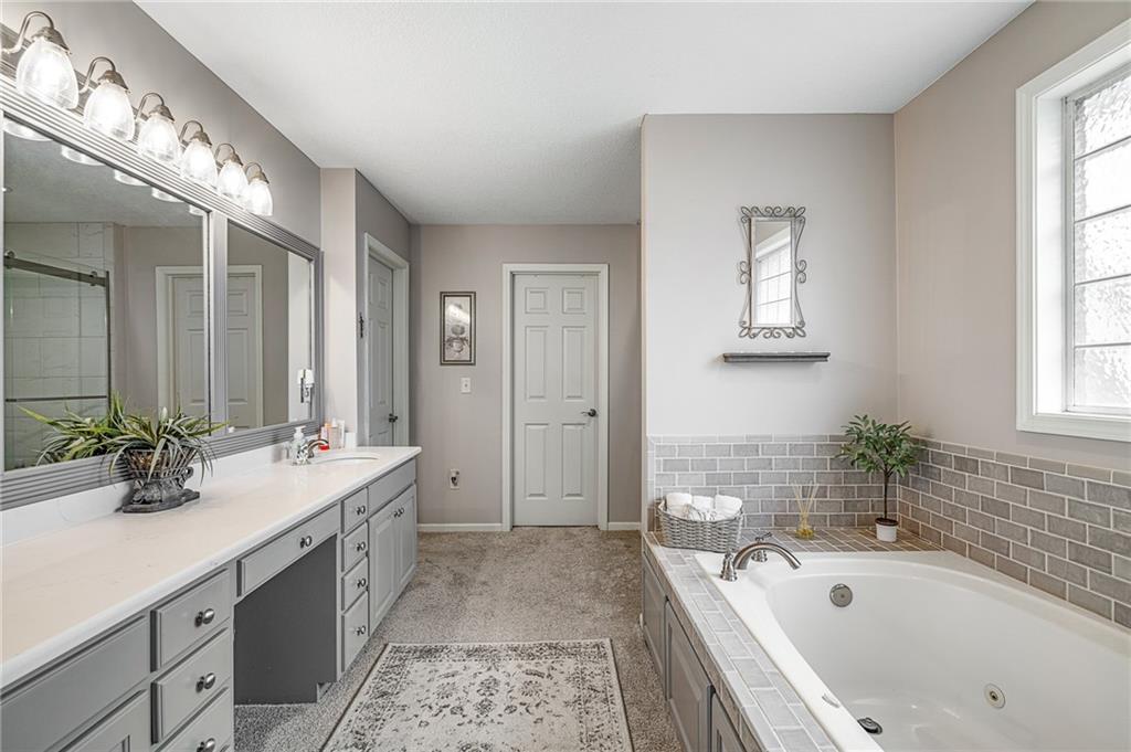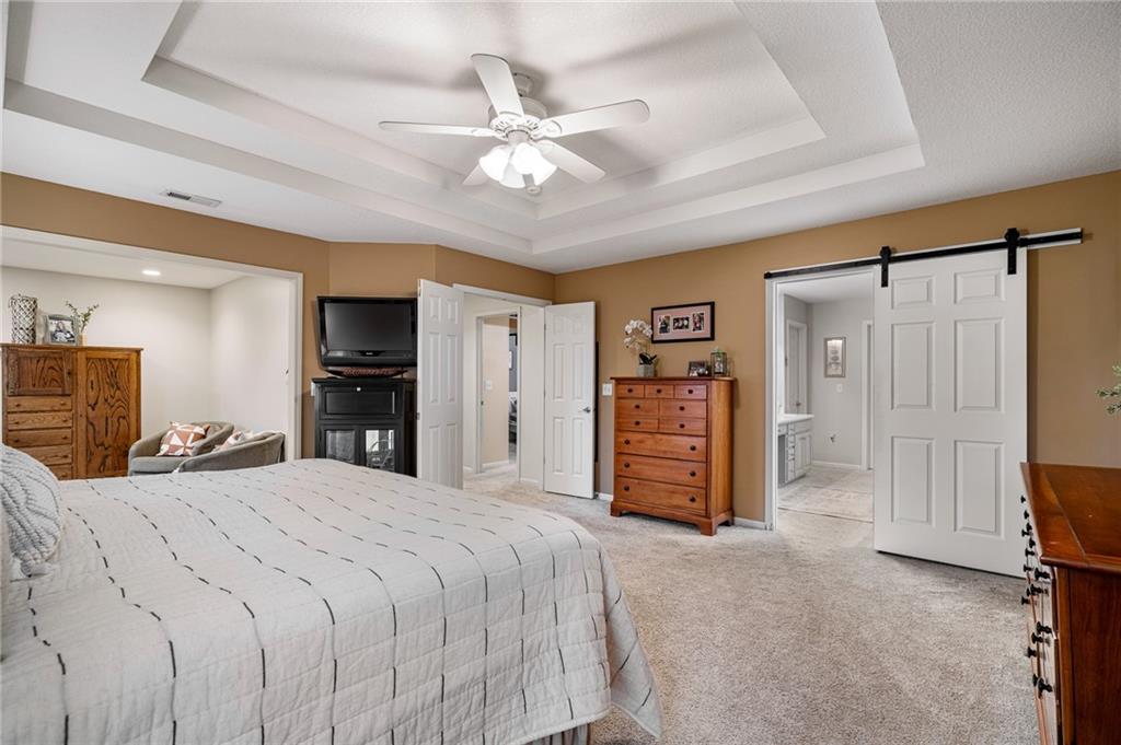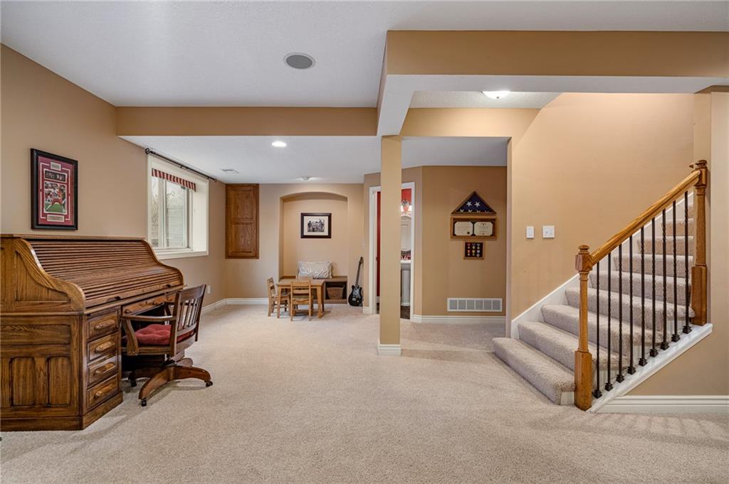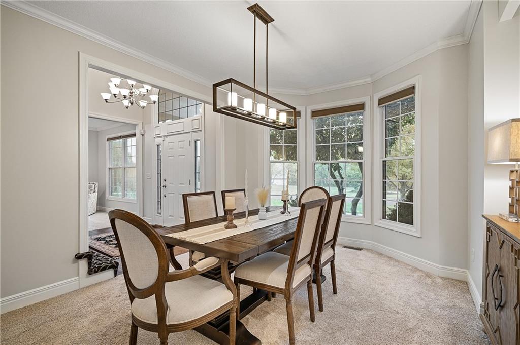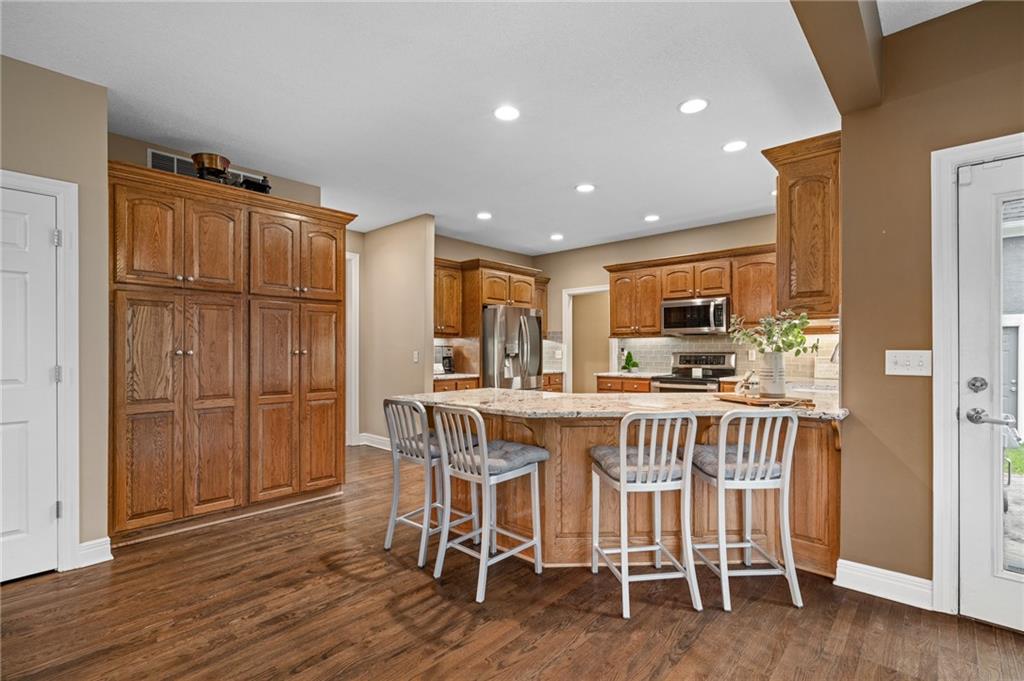 Morse Village Estates stunner! Picturesque setting on 1.1 acre lot surrounded with views of private, treed oasis. Main level flows seamlessly from the kitchen to the great room, den/study and entry or just a few steps outside to the expansive backyard patio. Primary bedroom offers a true retreat with sitting room, serene bathroom and oversized primary closet. Five car garage spaces including the must see 29'x38' detached garage for car or hobby enthusiasts, storage, sports, entertain/party or attic offers potential for added space, endless options! Roomy secondary bedrooms and closets. Secondary bedroom with wow-factor loft/bunk space. Lower level offers game room, media space, wet bar, half bath and cozy sitting area. New roof, full-yard irrigation system, updated kitchen counters, fresh paint, squeaky clean and beautifully maintained. Lot has space for pool, sport court and room to spare. Blue Valley Schools, trails, parks, restaurants, entertainment and highway access are all nearby.
