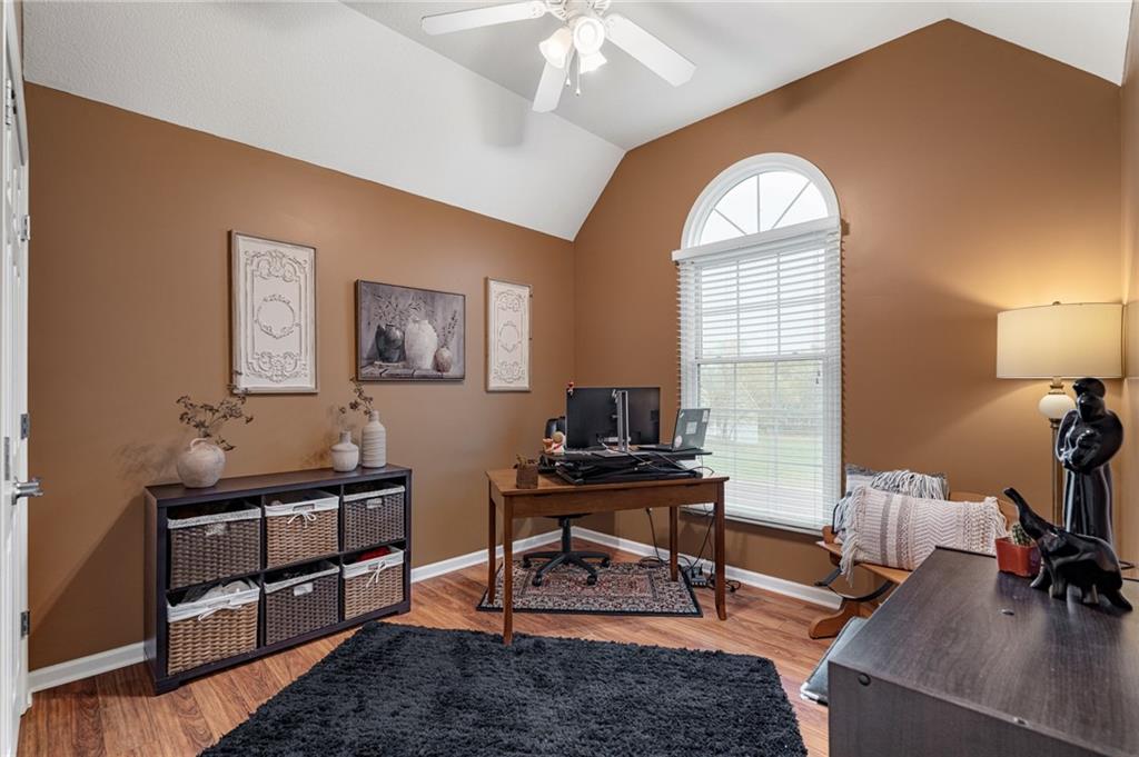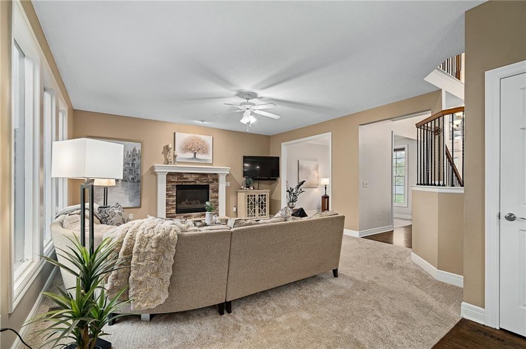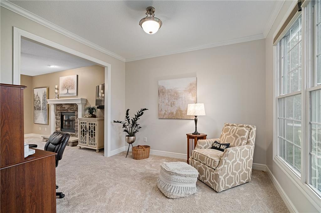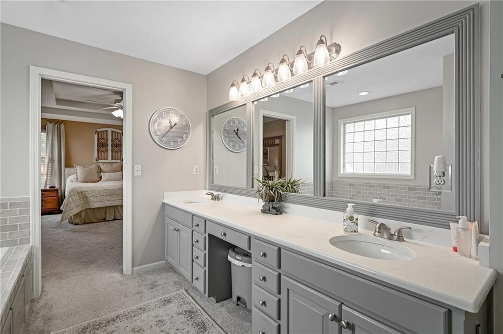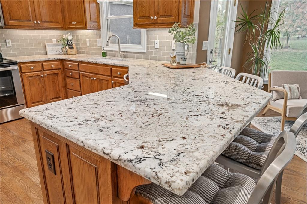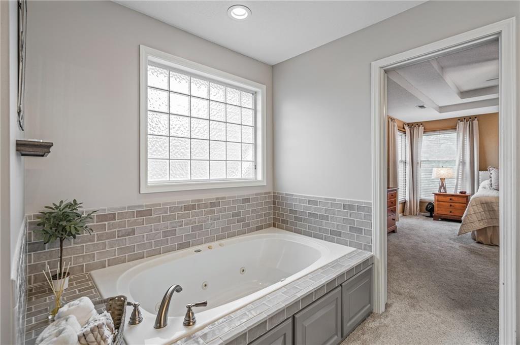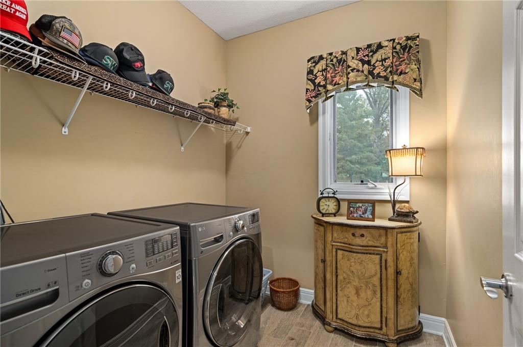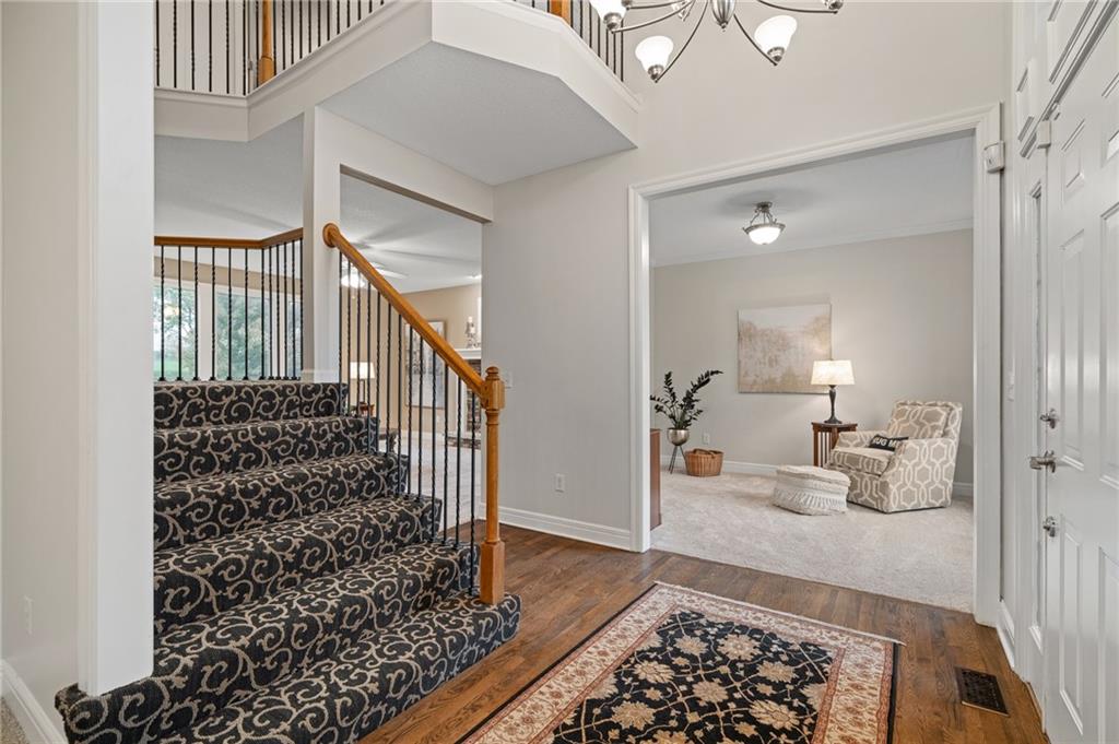 Morse Village Estates stunner! Picturesque setting on 1.1 acre lot surrounded with views of private, treed oasis. Main level flows seamlessly from the kitchen to the great room, den/study and entry or just a few steps outside to the expansive backyard patio. Primary bedroom offers a true retreat with sitting room, serene bathroom and oversized primary closet. Five car garage spaces including the must see 29'x38' detached garage for car or hobby enthusiasts, storage, sports, entertain/party or attic offers potential for added space, endless options! Roomy secondary bedrooms and closets. Secondary bedroom with wow-factor loft/bunk space. Lower level offers game room, media space, wet bar, half bath and cozy sitting area. New roof, full-yard irrigation system, updated kitchen counters, fresh paint, squeaky clean and beautifully maintained. Lot has space for pool, sport court and room to spare. Blue Valley Schools, trails, parks, restaurants, entertainment and highway access are all nearby.