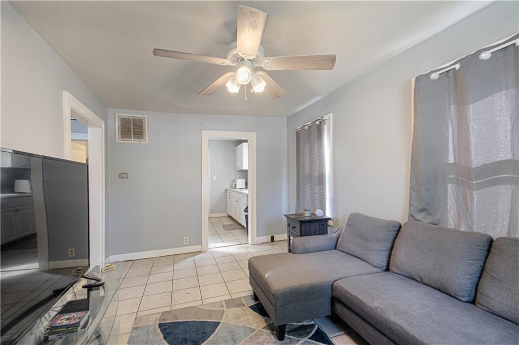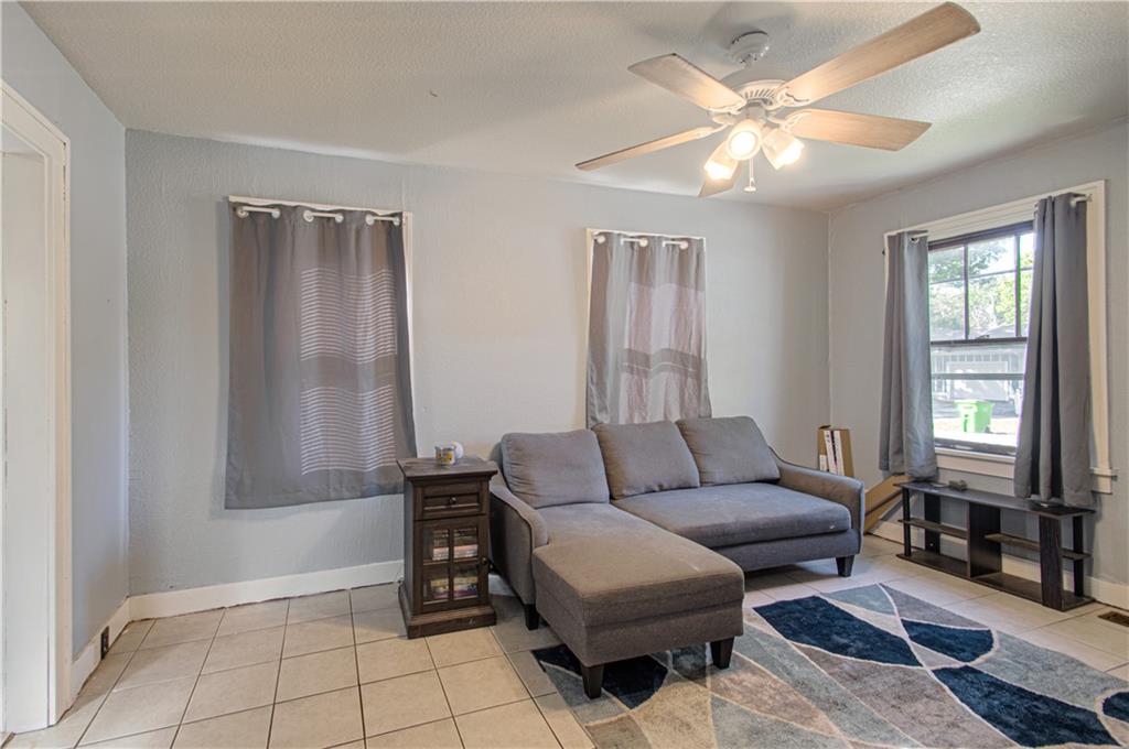 Living room with light tile patterned floors, ceiling fan, and a textured ceiling
