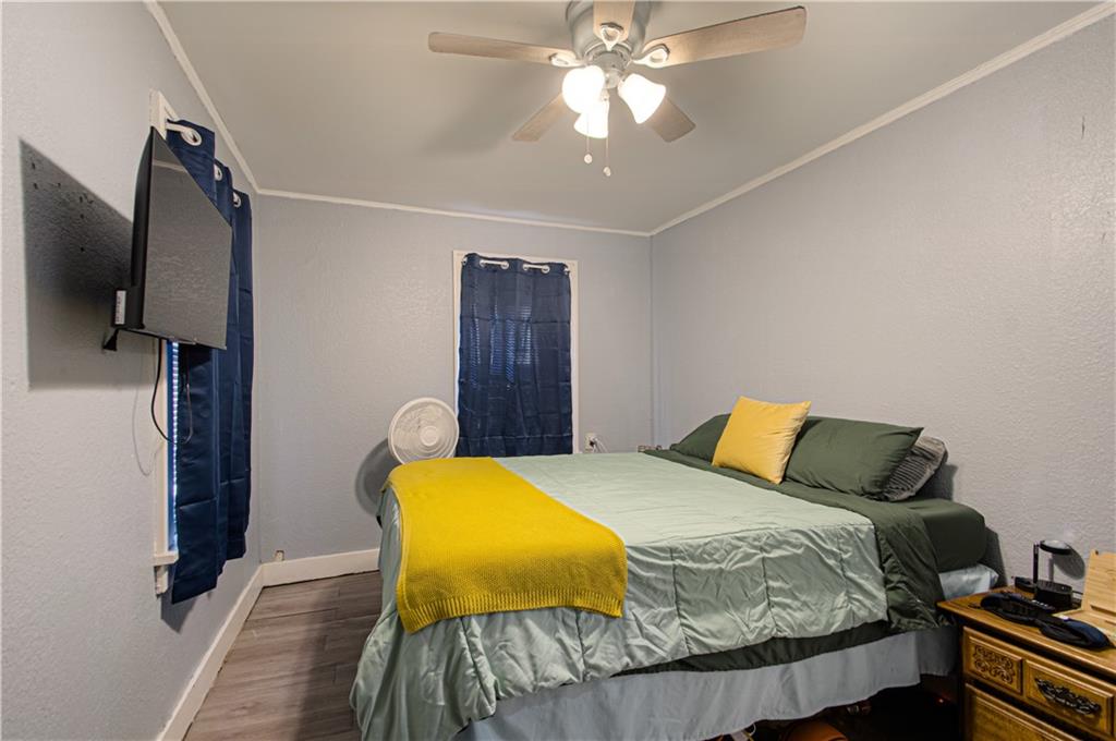 Bedroom featuring a textured wall, ornamental molding, wood finished floors, and ceiling fan