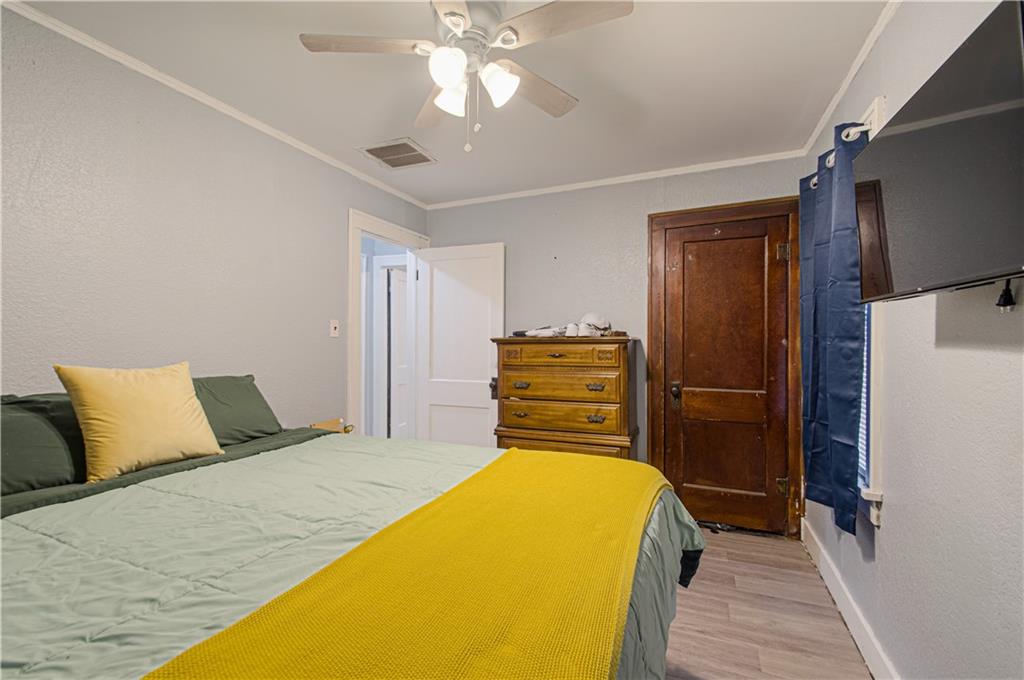 Bedroom featuring a textured wall, crown molding, light wood finished floors, and ceiling fan