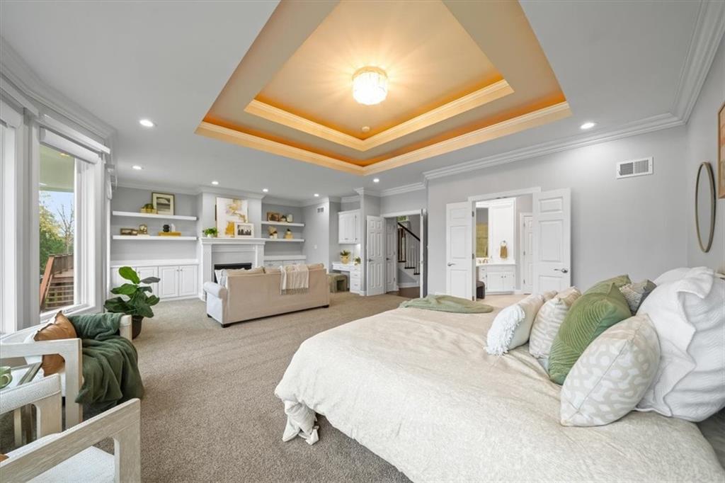 A glowing lake at sunset, framed by walls of windows in the great room, kitchen, and primary suite—each space intentionally designed to capture the view. Nestled on two lots at the end of a quiet cul-de-sac, this home lives like a private resort with over 300 feet of pristine lake frontage. The jewel-box kitchen shines with a mother-of-pearl backsplash, custom soft-close cabinetry, and a hidden butler’s pantry. Entertain effortlessly in the open living and dining areas with a cozy fireplace and automated Lutron shades, then step outside to a lush lawn that flows seamlessly to the water’s edge. The primary suite offers a private retreat, complete with a fireplace, lake views, and spa-like bath. The walkout level adapts beautifully to your lifestyle—complete with its own kitchen area and space for movie nights, an art studio, home gym, or in-law suite. Neighborhood amenities include a pool, tennis, and basketball courts just up the street. It’s lake life—elevated, elegant, and entirely your own.