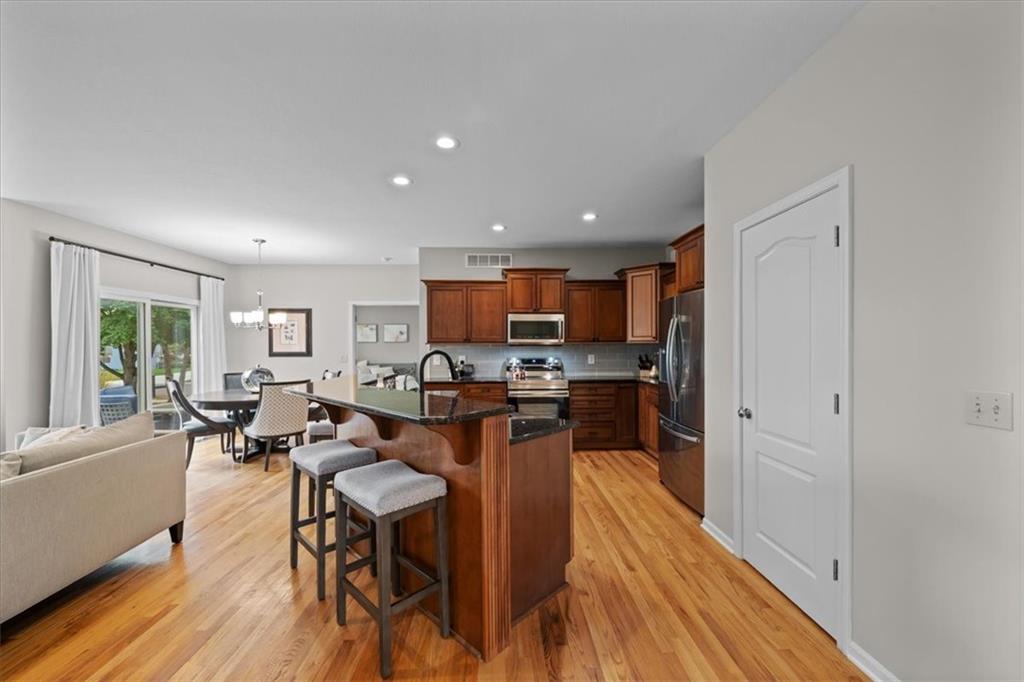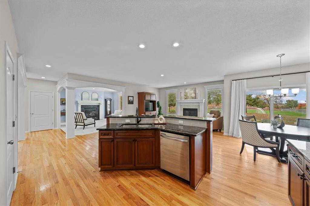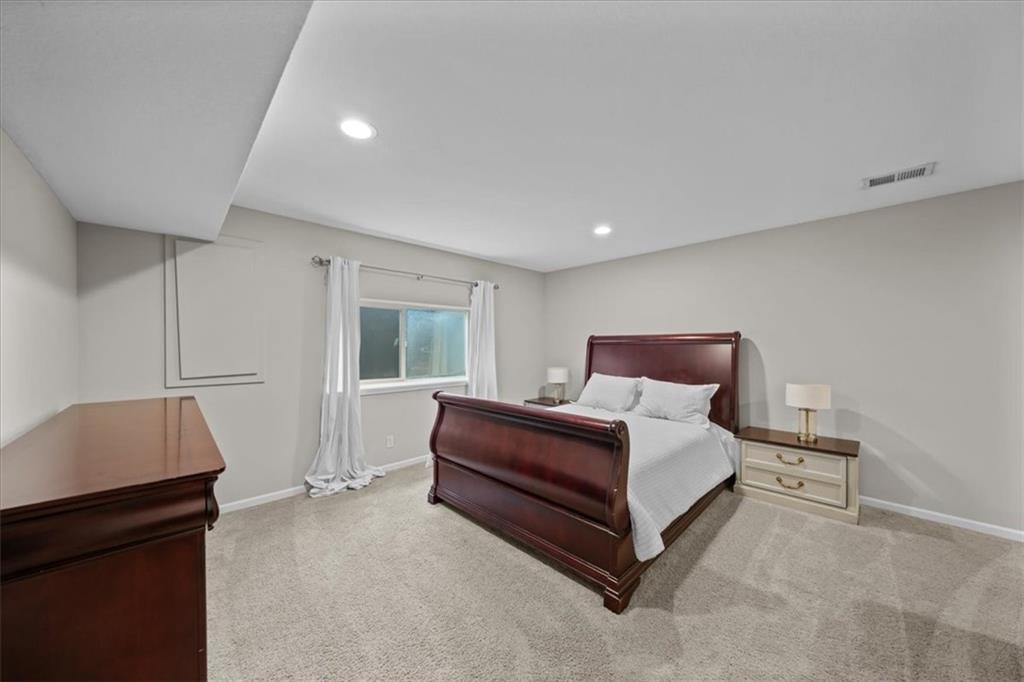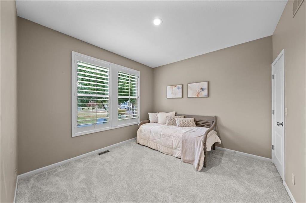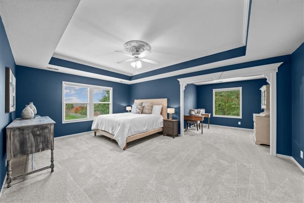 Stunning Two-Story in Award-Winning Blue Valley Schools! This beautifully updated home offers a perfect blend of comfort, style, and functionality in an unbeatable location. Over the past five years, updates include new interior and exterior paint, new carpet throughout the first and second floors, a new stamped concrete patio, updated kitchen backsplash and fireplace surround, a new furnace, 220V EV outlet, and more. The spacious, open floor plan is ideal for entertaining with a hearth room, formal dining room, and inviting living room. A main-floor bedroom with a full bath also makes the perfect guest suite, home office or flex space. Upstairs, the primary suite is a true retreat featuring a cozy sitting room, luxurious ensuite bath, and a huge walk-in closet. All secondary bedrooms are generously sized, include walk in closets and have convenient access to bathrooms. The finished basement provides additional living space, a full bath, and the potential to easily add a sixth bedroom if desired. The expansive patio is perfect for outdoor gatherings. Located just minutes from top-rated Blue Valley schools, shopping, dining, and major highways—this home truly has it all!