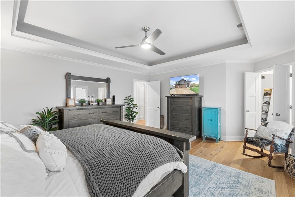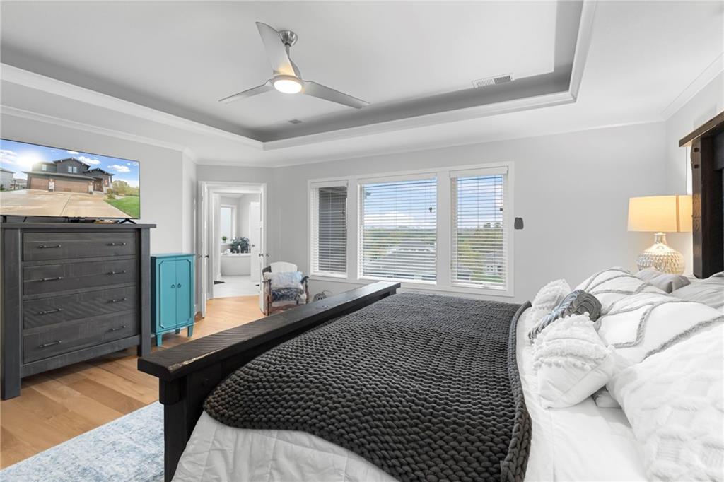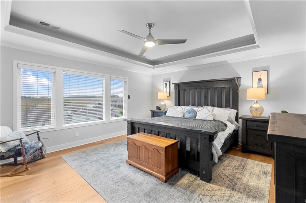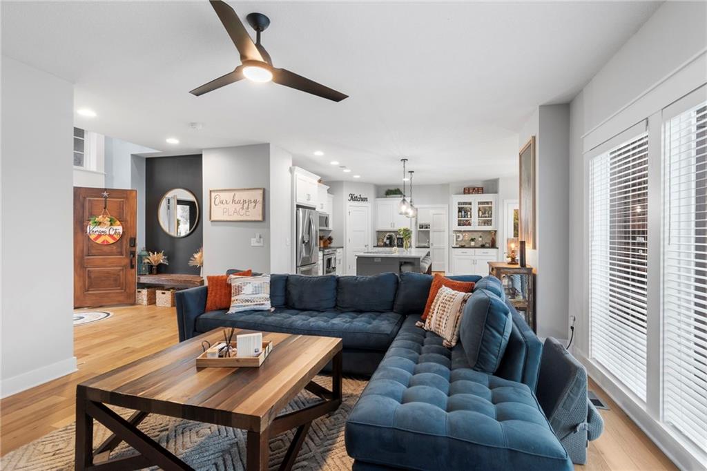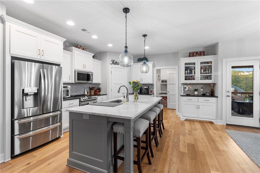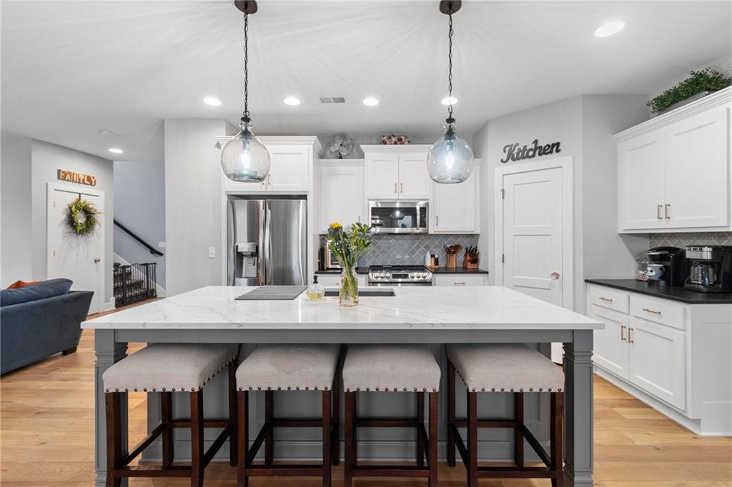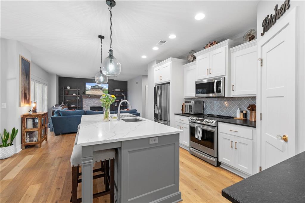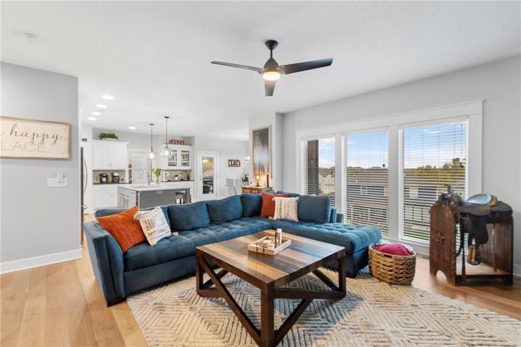 Welcome to this stunning modern home in the coveted community of Seven Bridges. Set on nearly a HALF-ACRE, one of the LARGEST LOTS in the neighborhood, this property seamlessly blends timeless design with everyday comfort. The newly painted exterior showcases dark stucco, warm wood garage doors, and stone accents that create instant curb appeal. Inside, wood floors flow throughout an open-concept layout filled with natural light from oversized windows. The kitchen, with its large quartz island, elegant gray arabesque backsplash, and walk-in pantry, opens to a cozy family room and covered deck. The adjoining patio, connected by the walkout basement, creates a seamless indoor-outdoor flow. Step outside to a giant backyard with fresh landscaping, full fencing, and a sprinkler system. The yard transitions beautifully from the neighborhood’s gentle landscape into wide-open green space beyond, making every sunset view unforgettable. This home includes abundant storage closets, a practical mudroom with a built-in desk, and a deep utility sink in the laundry room. The primary suite feels like a private retreat with an oversized walk-in closet that connects directly to the laundry room. The spa-style bath features double vanities, a freestanding tub, a dual-head tile shower, and an elegant cascading chandelier. The walkout basement has large windows that bring in natural light and endless potential to finish your way. This fall, picture family nights by the fire, weekend games in the yard, and quiet mornings on the porch with coffee and sunrise views. Seven Bridges offers resort-style amenities including pools, tennis and basketball courts, a clubhouse, playground, and scenic walking paths for community living at its best.