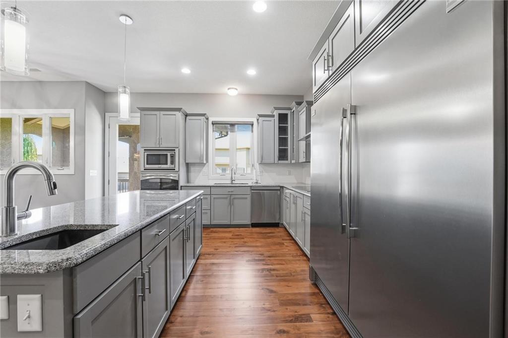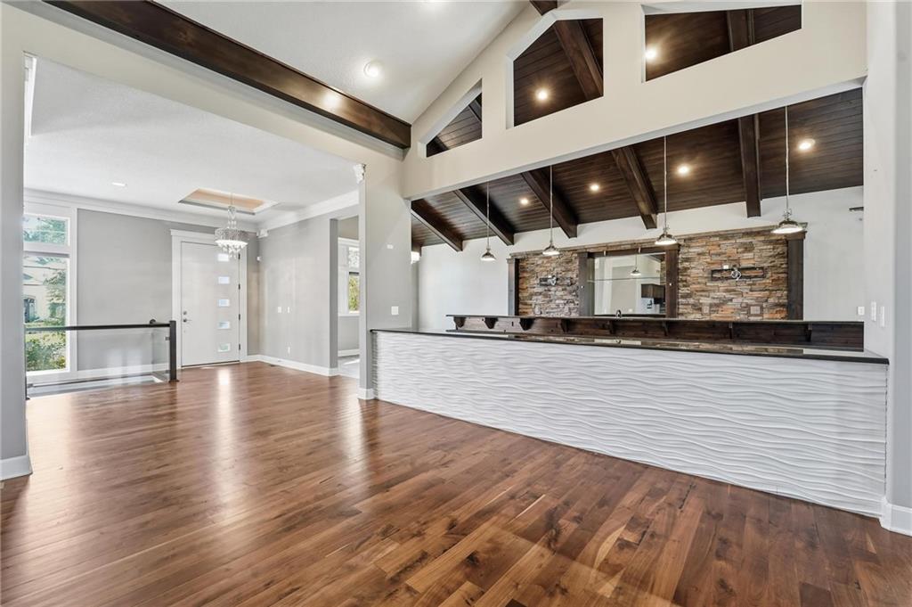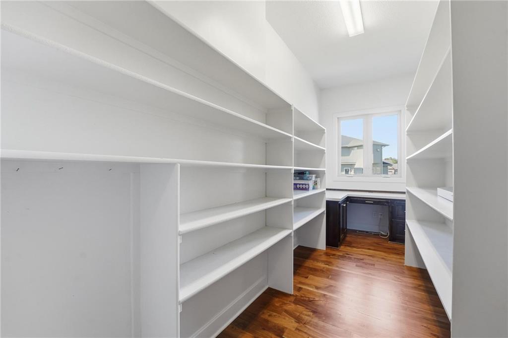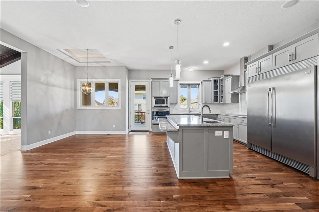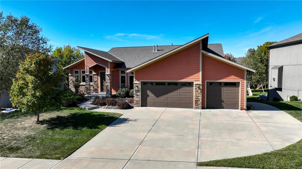 Exceptional custom home designed with entertaining in mind. Stunning walnut floors from the gracious entry, through the great room, kitchen & breakfast room. Great room has vaulted ceiling, gas fireplace in stone accent wall, built-ins & floating shelves. Kitchen has large island, top of the line appliances including built-in Frigidaire Professional refrigerator/freezer, cooktop with vented hood, dbl oven, microwave & dishwasher. Pantry is 5x16 with built in desk under window, tons of shelf space. Breakfast nook is ideal for banquet, full glass door out to Lanai, vaulted ceiling, ceiling fan. Bonus main level family room has 19' bar w/custom cabinets, granite counters, stone walls behind bar, 2nd 15' long serving bar with tons of storage, granite countertop & mid century design. Family room has 15' vaulted ceiling with tongue & groove ceiling & beams. A beautiful den space, or room for baby grand piano, under the beautiful fixture plus additional dining space surrounded by windows & door out to large covered Lanai with tile floor. The primary suite is large with vaulted ceiling & luxury bath with separate vanities, very large tiled shower, dream 10x18 walk-in closet with large dresser island, walks through to laundry. Staircase to lower level with custom glass panel railing, large windows flooding the stairway with natural light. Large family room with wet bar area with tiled floor. 1 guest suite with bath & large walk-in closet, 2 additional bedrooms have walk-in closets, each with private vanity spaces, share shower. 1 bedroom has a secret passageway through built-in bookcase, to 8x9 storm area/storage under front porch! New covered patio off lower level family room is 20x13. Car lovers, a bonus 4th garage, has driveway from main level, is 22'd x 19'w. The main level 3 car garage is oversized, 31'wide, with 11' ceiling, 2 car side is 24'deep, 1 car side 29'deep with 9' wide door. North Shore is Cass County, Lee's Summit Schools.