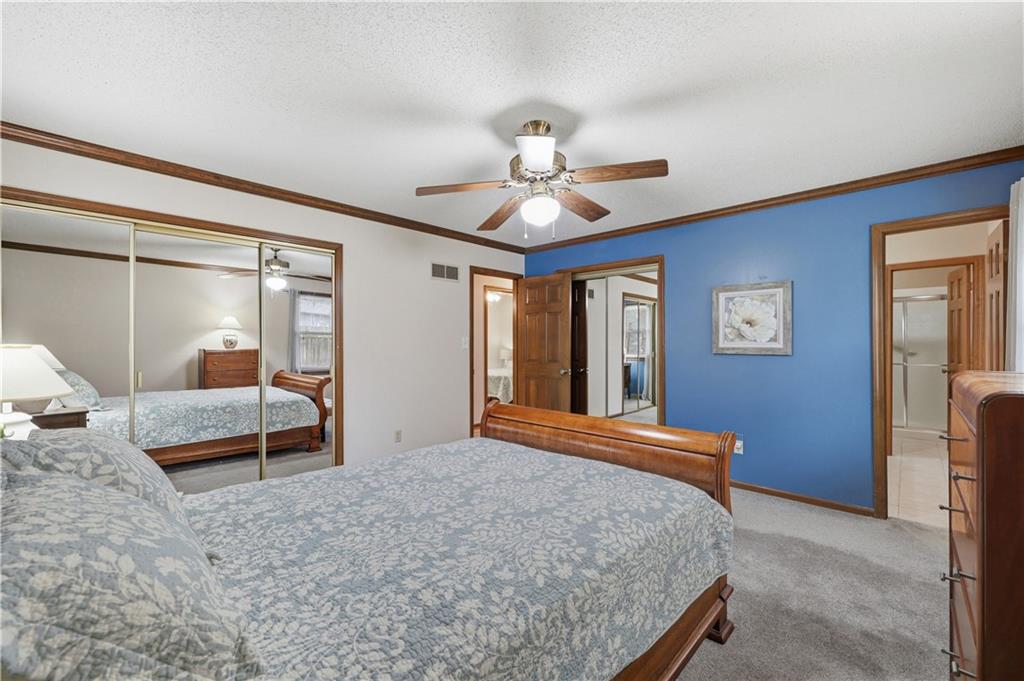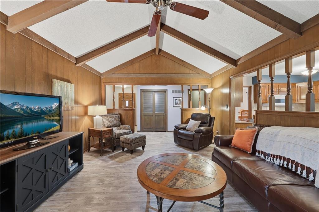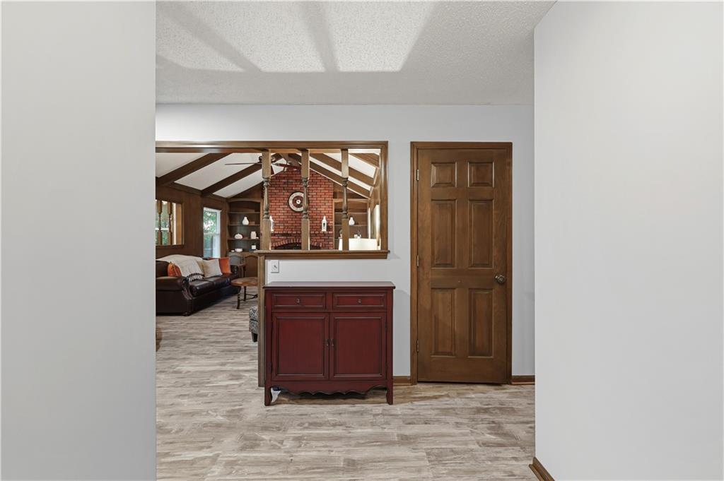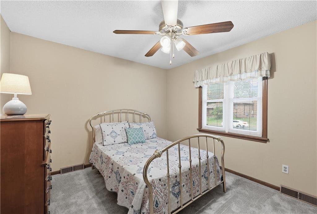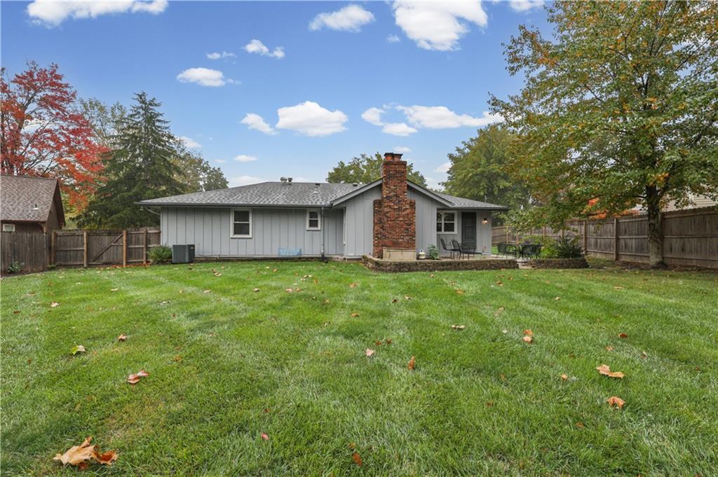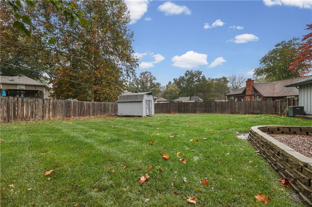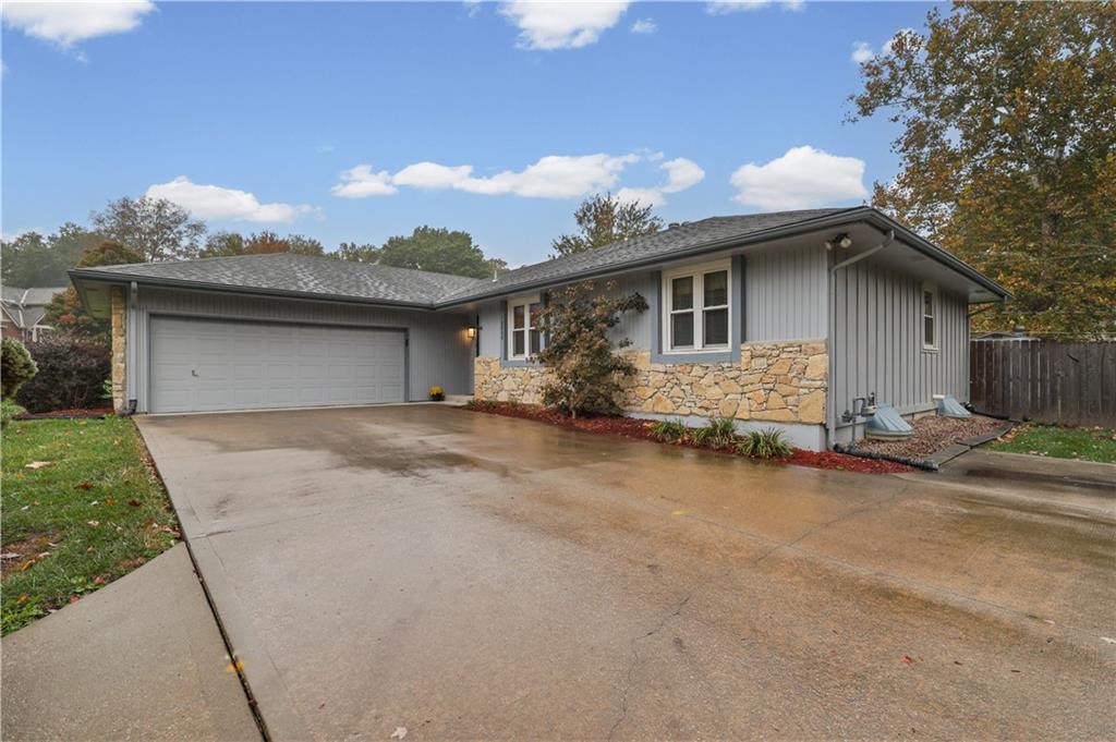 Welcome to this beautifully maintained, move-in ready full ranch in the established Castle Woods neighborhood of Independence. This 3-bedroom, 2.5-bath home offers comfortable main floor living in a quiet community with convenient access to highways, shopping, and dining. Step inside to find a spacious entry that leads to an impressive great room with vaulted ceilings, exposed beams, built-ins, and a dramatic fireplace that creates a warm and inviting gathering space. The eat-in kitchen features granite countertops, updated backsplash, and a formal dining area perfect for entertaining. The main level is one-step entry from garage, and includes a separate laundry room with extra storage. The primary suite offers dual closets with built-in organization and shelving to maximize storage, along with a private en-suite bath. Downstairs, the fully finished lower level provides a wide open recreation room with a fireplace, a non-conforming bedroom, and abundant storage space. Recent updates include new refrigerator, new luxury vinyl plank flooring, newer carpet, a newer furnace (Jan 2024), new hot water heater, and Maytag washer and dryer. Outdoor features include an oversized patio, privacy-fenced backyard, and a large storage shed with ramp access. The backyard is private and peaceful, and with the shed, ideal for pets, hobbies, or outdoor entertaining. Over the years, the sellers have made thoughtful improvements such as updated windows, driveway, kitchen and bath hardware, light fixtures, granite countertops, backsplash, and easy-care landscaping. This home has been meticulously cared for and reflects true pride of ownership throughout.