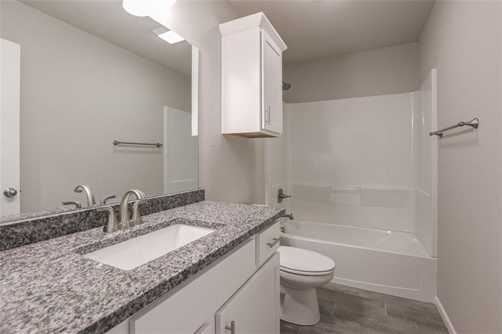 This traditional ranch-style home showcases a timeless exterior with cedar-accented details, stone accents, and a welcoming front tower. Inside, the open-concept layout connects the kitchen, dining, and living areas for seamless flow and comfort. The kitchen features a spacious center island, while the living area includes a cozy fireplace and direct access to a large back patio — perfect for entertaining or relaxing outdoors. Photos are a representation of the Christine floor plan. Selections may vary from this home, and plans are subject to minor changes.