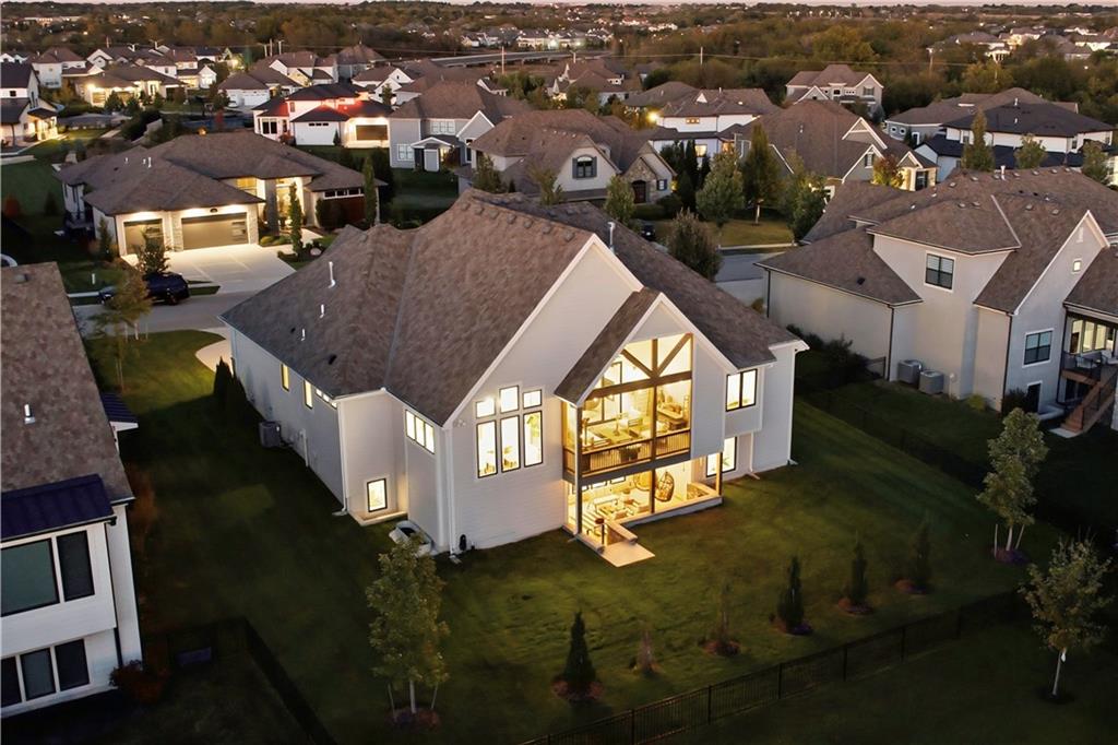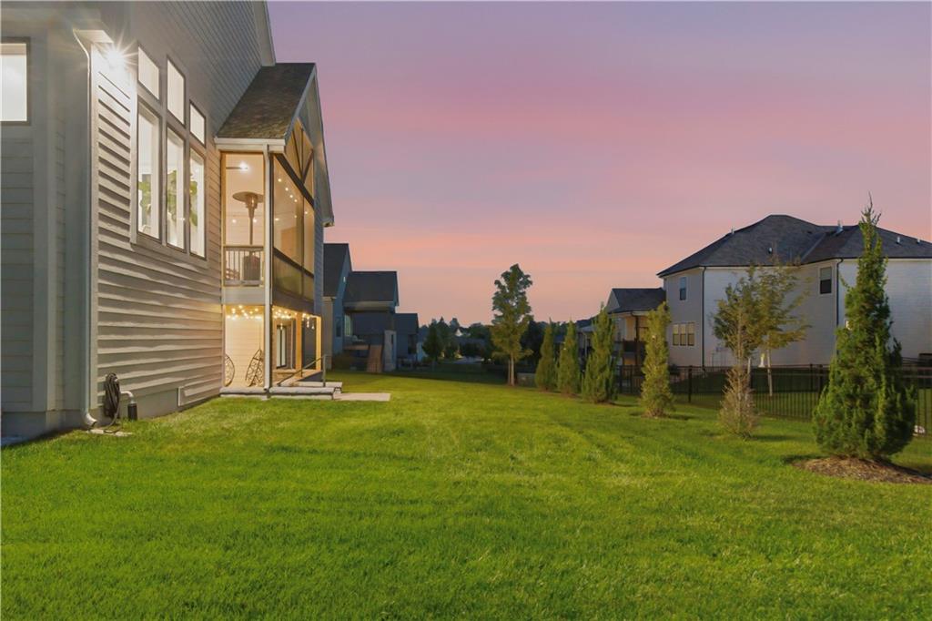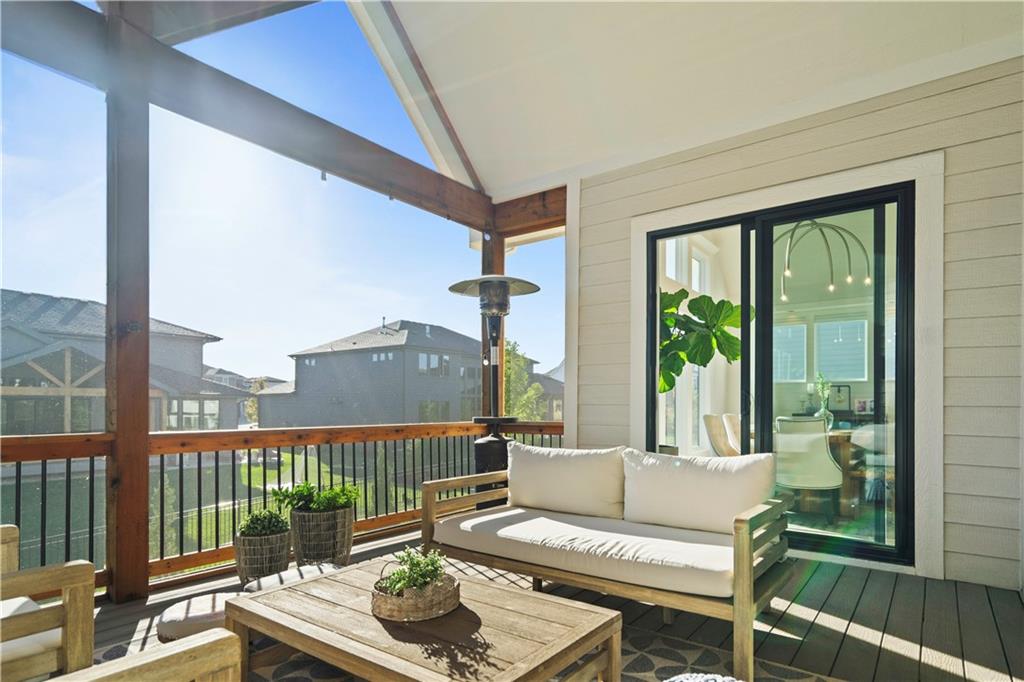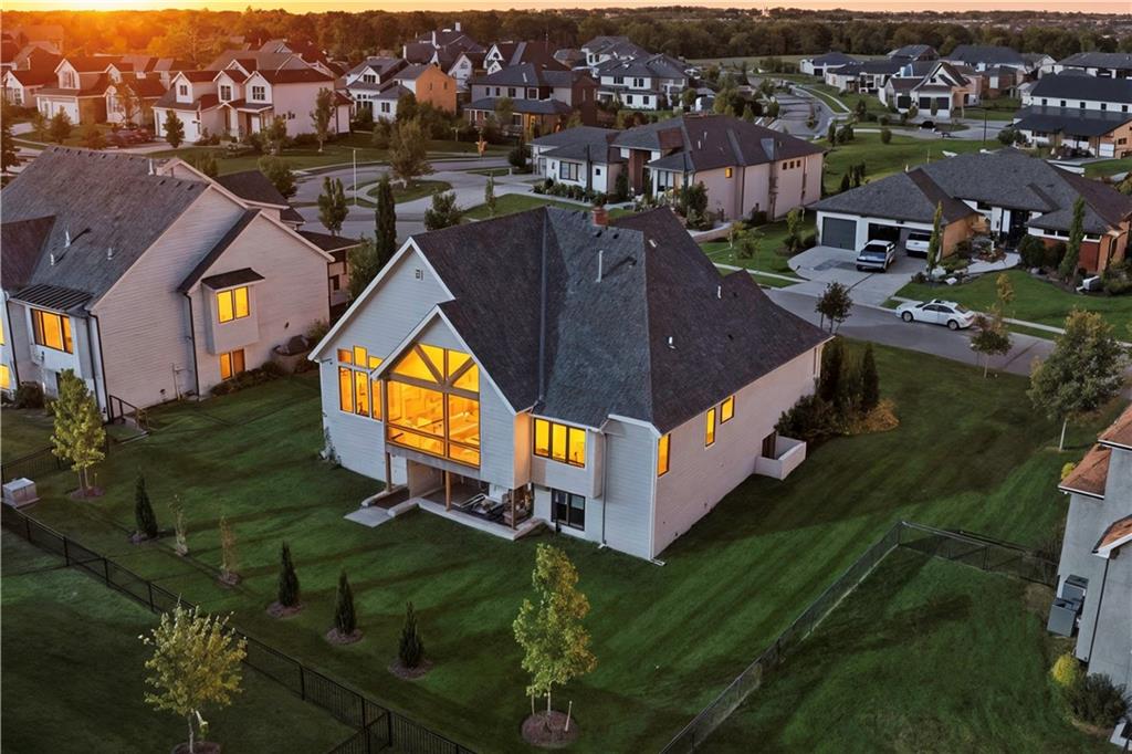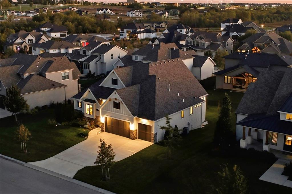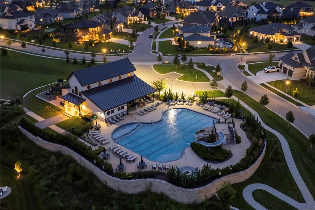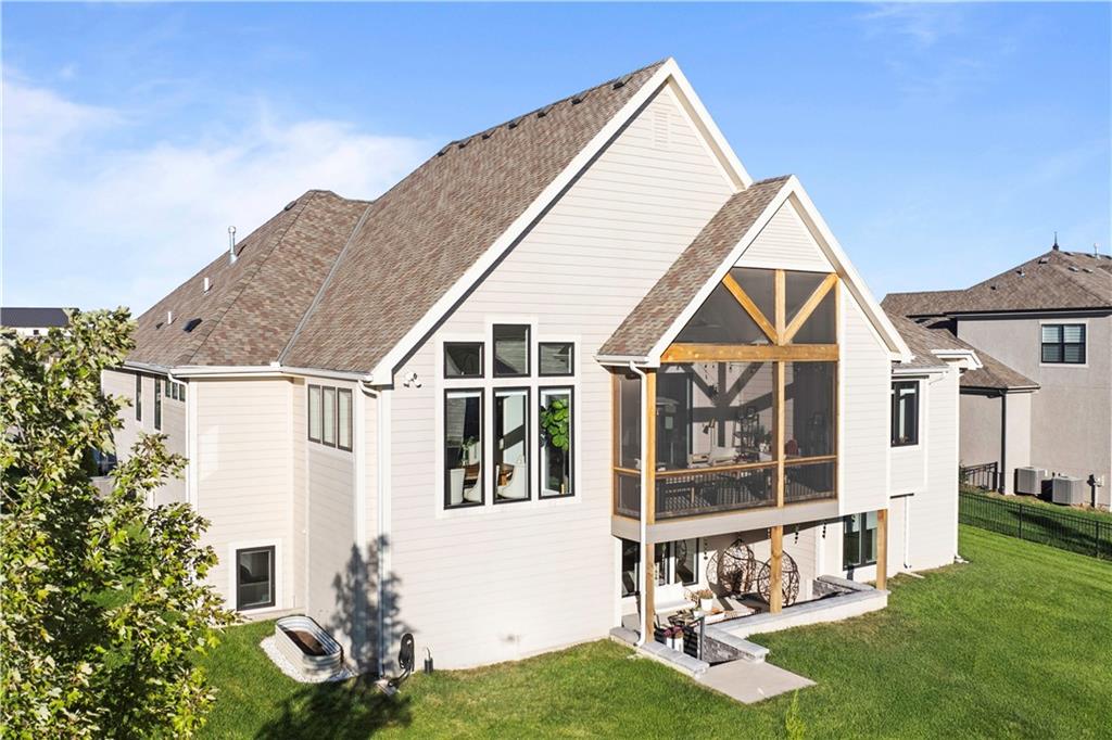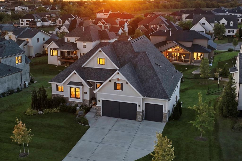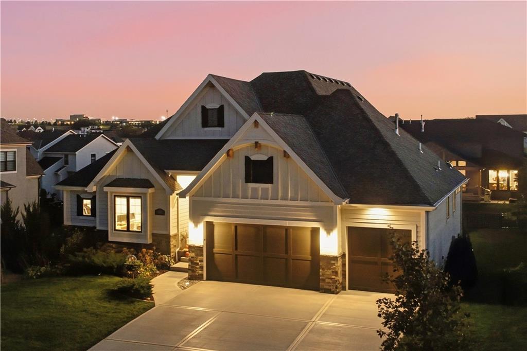 Discover refined living in this nearly 4,000 sq ft Reverse 1.5 Story located in the prestigious Estates of Century Farms. Less than three years old, this home blends elevated design with everyday comfort. Impressive vaulted ceilings and abundant natural light create a dramatic entry into the open kitchen and dining area, featuring quartz countertops, an oversized island, farmhouse sink, gas cooktop, walk-in pantry, and built-in pocket office. Designer touches throughout include designer lighting, remote-controlled blinds, EV charger, Smart garage opener, and more. Spacious screened-in deck with fireplace and TV mount, overlooking a mostly fenced .3 acre lot. The finished walkout lower level showcases LVT flooring, wet bar, pub area, TV accent wall, and access to a sunken stone patio—perfect for entertaining. The 5th bedroom with glass doors doubles as a movie room, fitness studio, or second office, while a kids’ play nook under the stairs adds charm and character. Exterior highlights include four-sided lap siding, real stone accents, wood details, and a 50-year roof. Enjoy resort-style neighborhood amenities just a short stroll away—pool with slide, clubhouse, fitness gym, pickleball and basketball courts, fire pit, playground, and community garden. Ideally located near Bluhawk, Heritage Park, and the Overland Park Arboretum, with easy access to the Johnson County Trail System. Served by award-winning Blue Valley Schools. Don’t miss this opportunity to call Century Farms your new home!