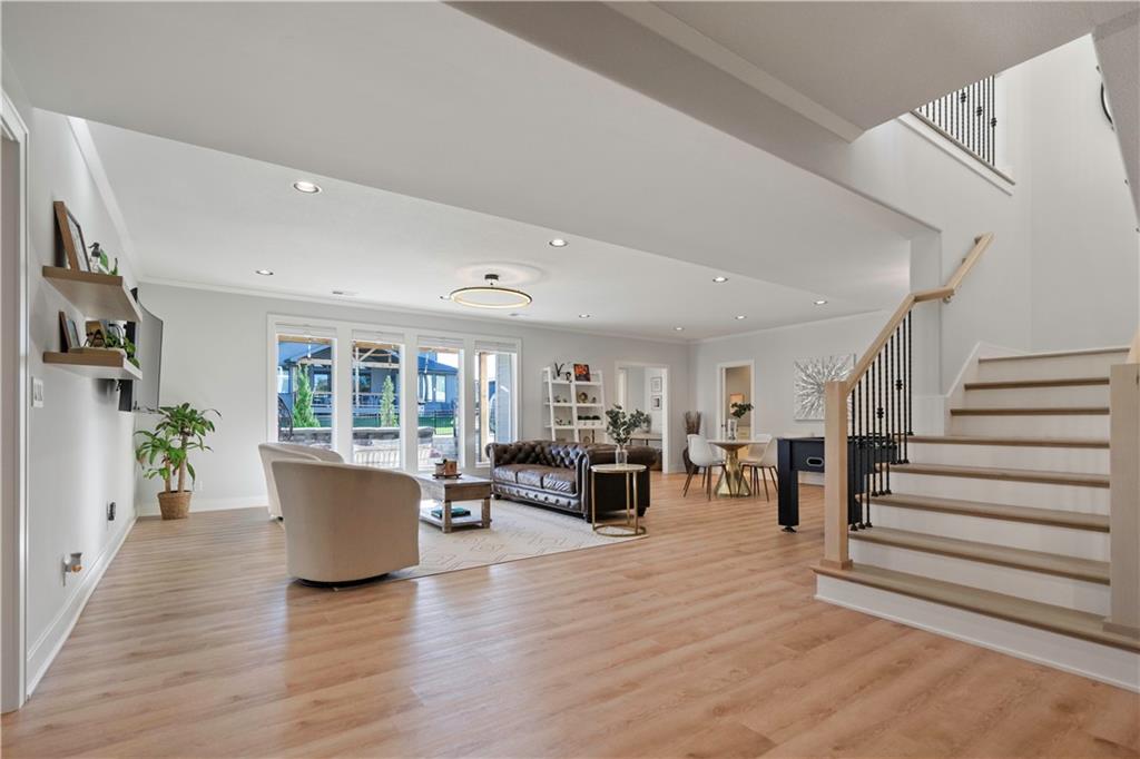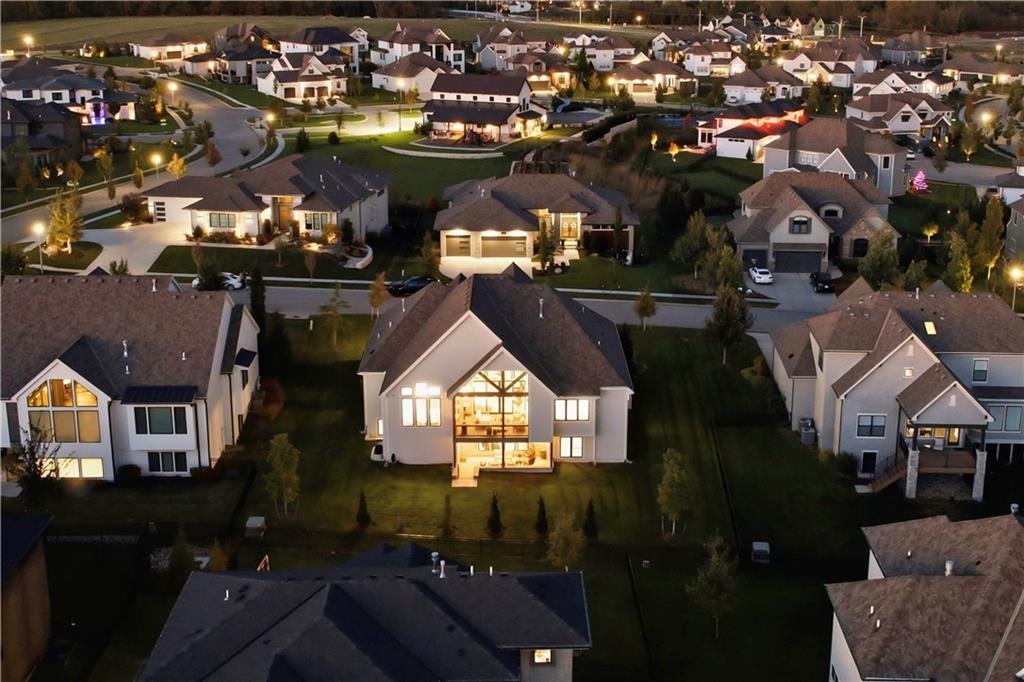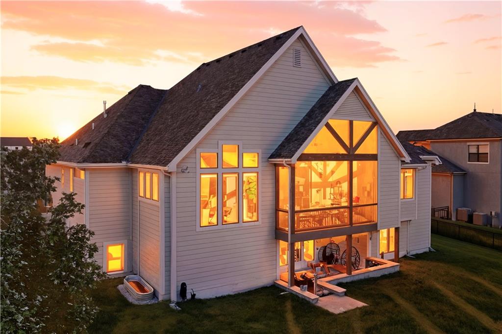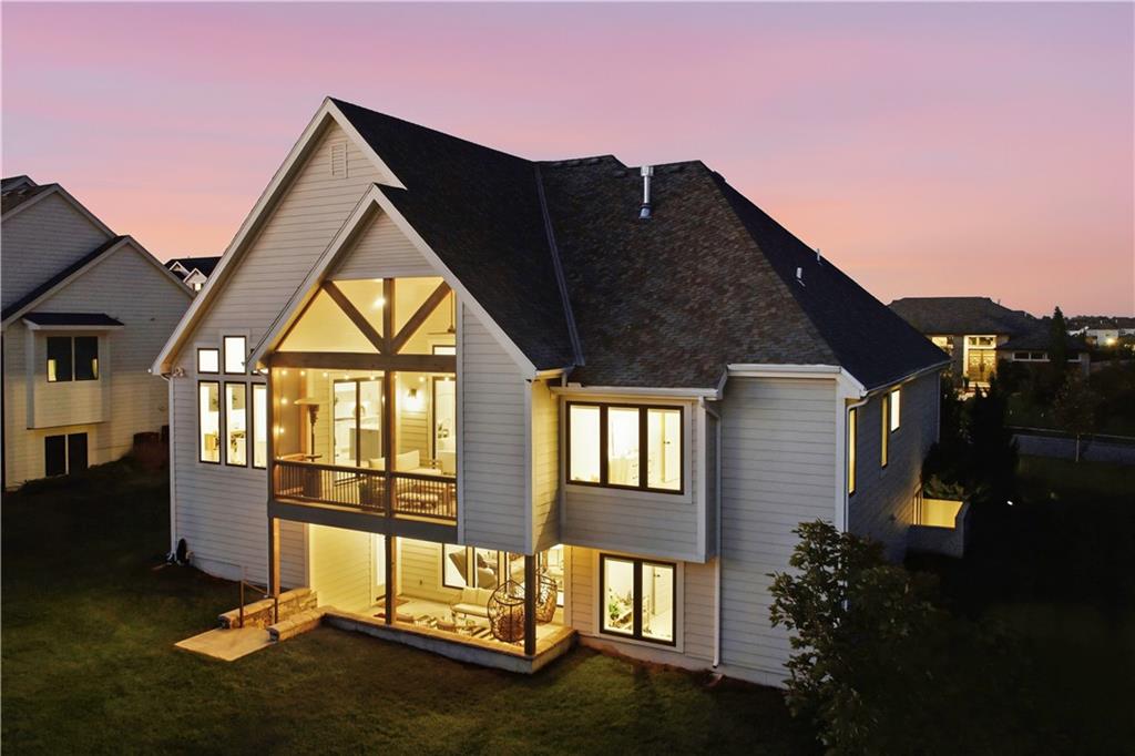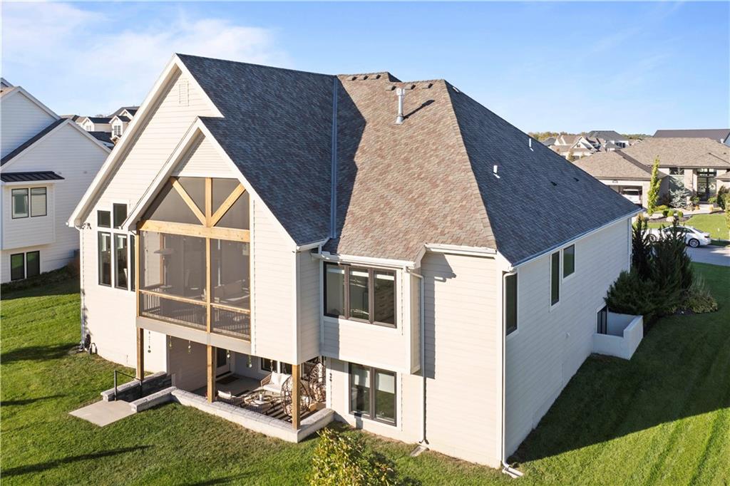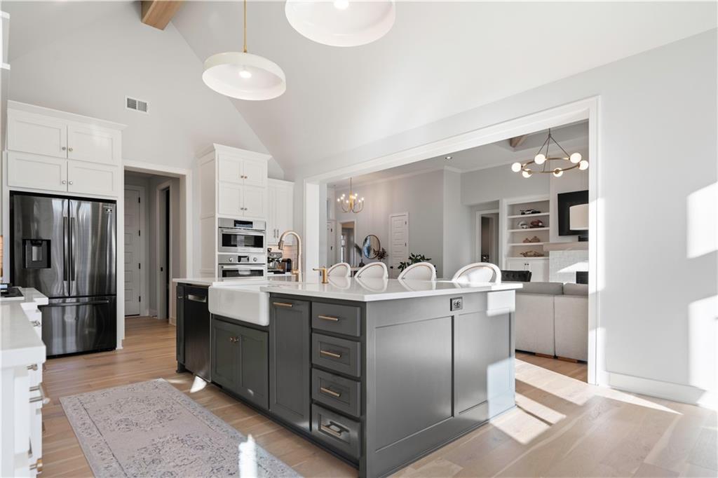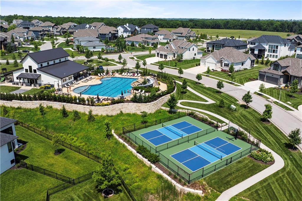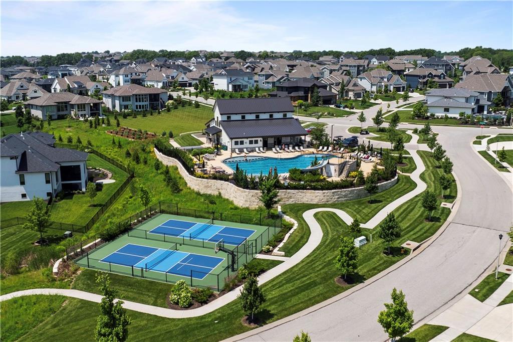 Discover refined living in this nearly 4,000 sq ft Reverse 1.5 Story located in the prestigious Estates of Century Farms. Less than three years old, this home blends elevated design with everyday comfort. Impressive vaulted ceilings and abundant natural light create a dramatic entry into the open kitchen and dining area, featuring quartz countertops, an oversized island, farmhouse sink, gas cooktop, walk-in pantry, and built-in pocket office. Designer touches throughout include designer lighting, remote-controlled blinds, EV charger, Smart garage opener, and more. Spacious screened-in deck with fireplace and TV mount, overlooking a mostly fenced .3 acre lot. The finished walkout lower level showcases LVT flooring, wet bar, pub area, TV accent wall, and access to a sunken stone patio—perfect for entertaining. The 5th bedroom with glass doors doubles as a movie room, fitness studio, or second office, while a kids’ play nook under the stairs adds charm and character. Exterior highlights include four-sided lap siding, real stone accents, wood details, and a 50-year roof. Enjoy resort-style neighborhood amenities just a short stroll away—pool with slide, clubhouse, fitness gym, pickleball and basketball courts, fire pit, playground, and community garden. Ideally located near Bluhawk, Heritage Park, and the Overland Park Arboretum, with easy access to the Johnson County Trail System. Served by award-winning Blue Valley Schools. Don’t miss this opportunity to call Century Farms your new home!