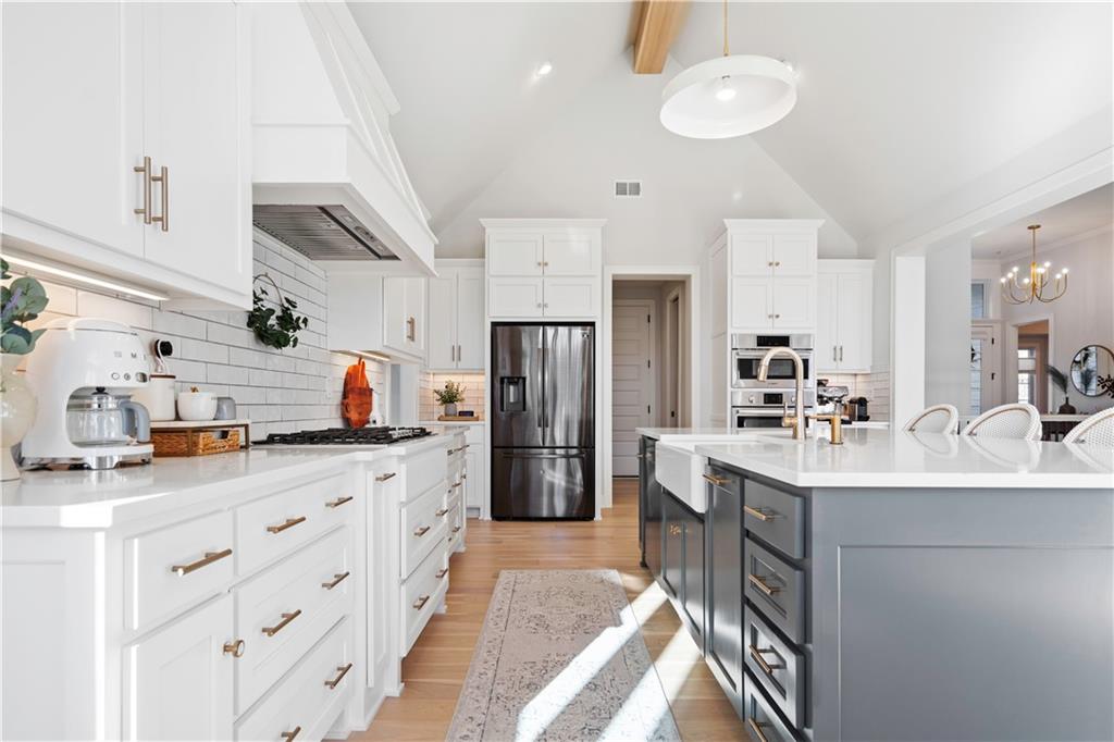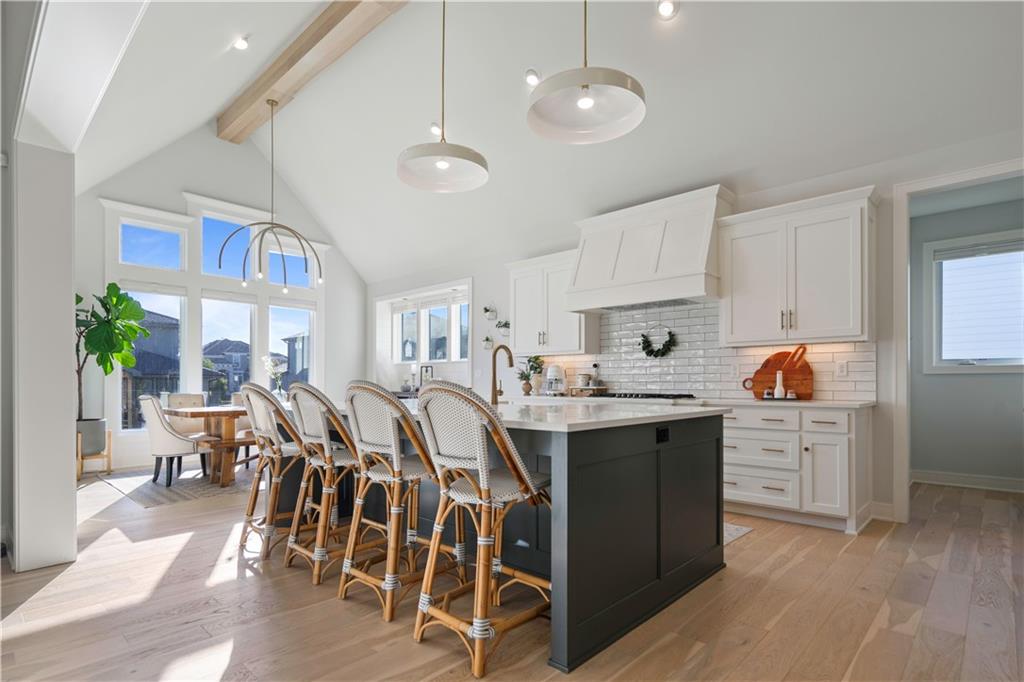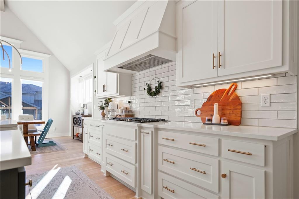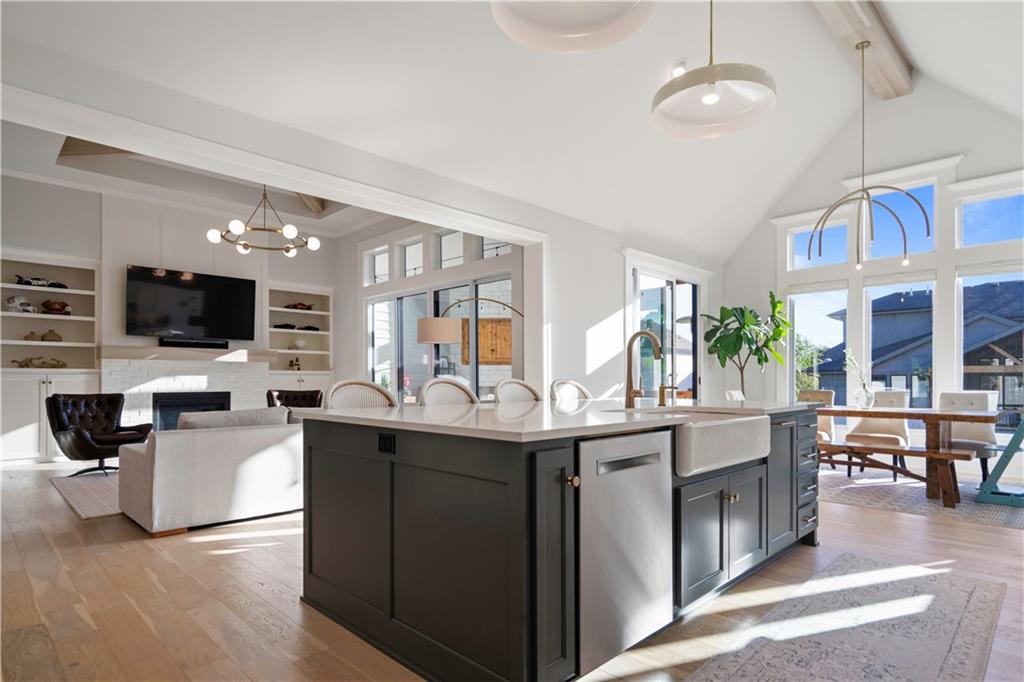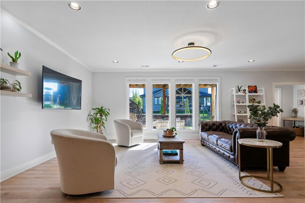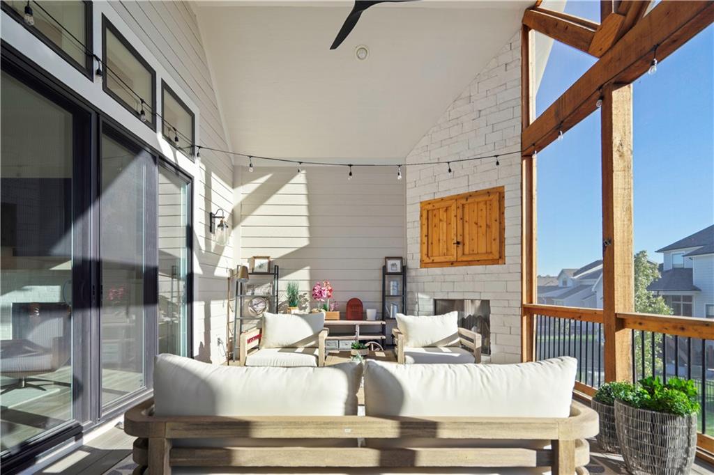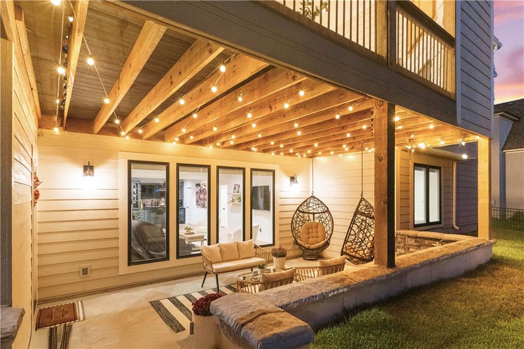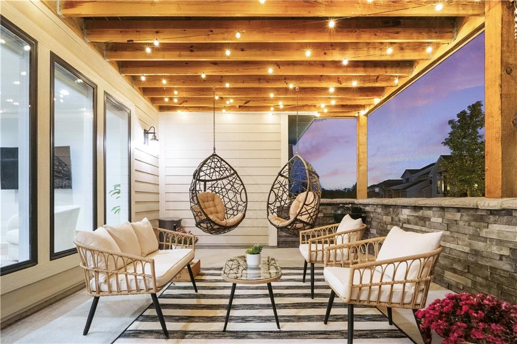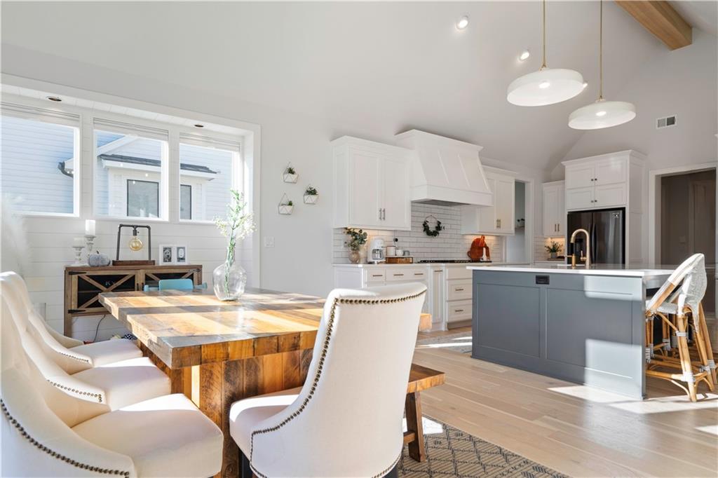 Discover refined living in this nearly 4,000 sq ft Reverse 1.5 Story located in the prestigious Estates of Century Farms. Less than three years old, this home blends elevated design with everyday comfort. Impressive vaulted ceilings and abundant natural light create a dramatic entry into the open kitchen and dining area, featuring quartz countertops, an oversized island, farmhouse sink, gas cooktop, walk-in pantry, and built-in pocket office. Designer touches throughout include designer lighting, remote-controlled blinds, EV charger, Smart garage opener, and more. Spacious screened-in deck with fireplace and TV mount, overlooking a mostly fenced .3 acre lot. The finished walkout lower level showcases LVT flooring, wet bar, pub area, TV accent wall, and access to a sunken stone patio—perfect for entertaining. The 5th bedroom with glass doors doubles as a movie room, fitness studio, or second office, while a kids’ play nook under the stairs adds charm and character. Exterior highlights include four-sided lap siding, real stone accents, wood details, and a 50-year roof. Enjoy resort-style neighborhood amenities just a short stroll away—pool with slide, clubhouse, fitness gym, pickleball and basketball courts, fire pit, playground, and community garden. Ideally located near Bluhawk, Heritage Park, and the Overland Park Arboretum, with easy access to the Johnson County Trail System. Served by award-winning Blue Valley Schools. Don’t miss this opportunity to call Century Farms your new home!