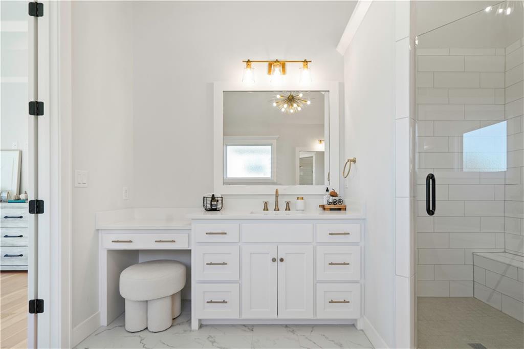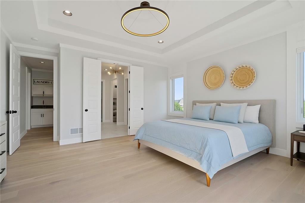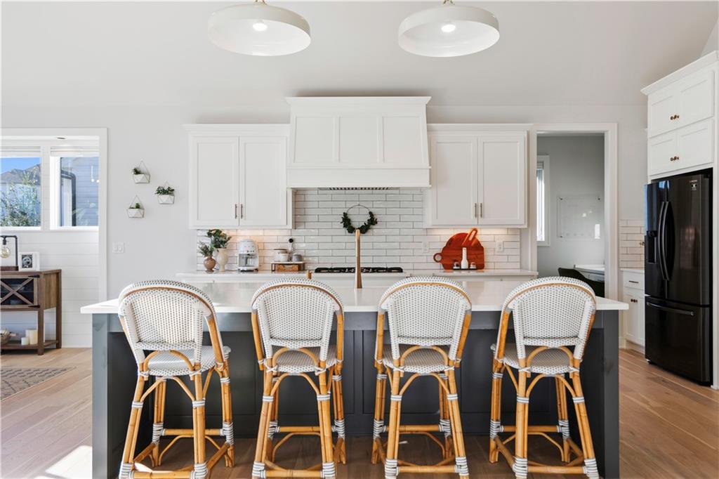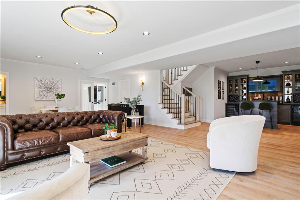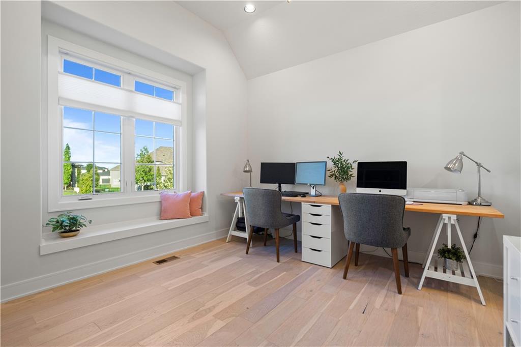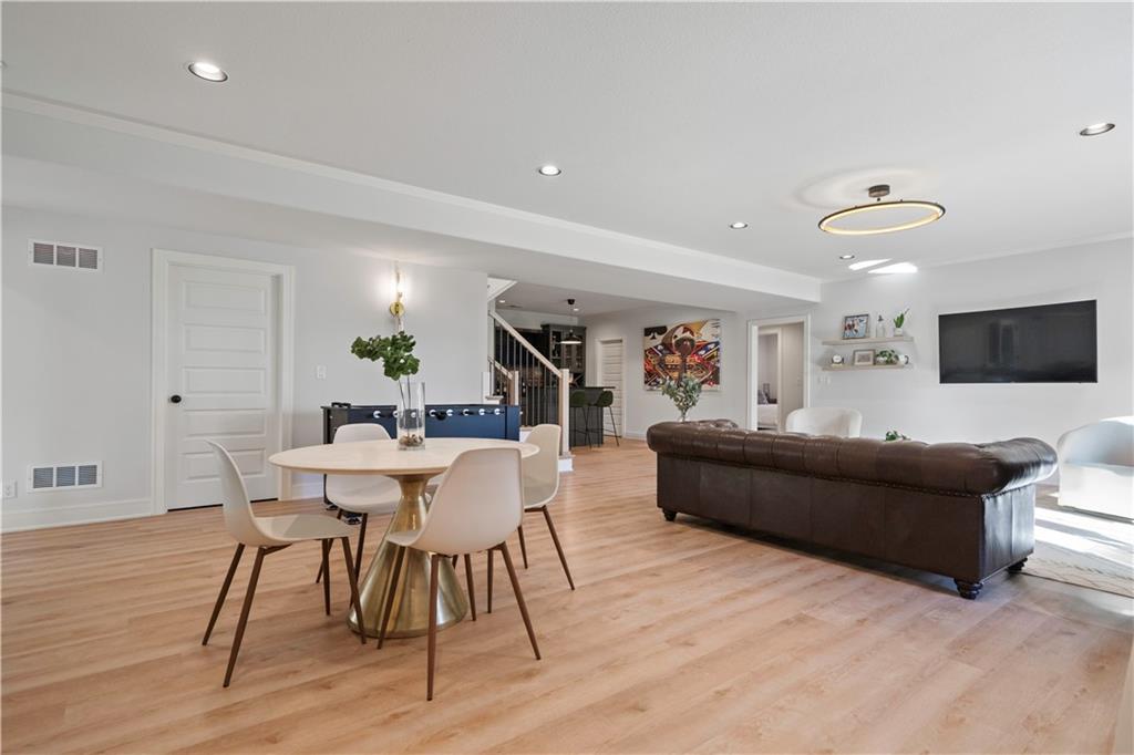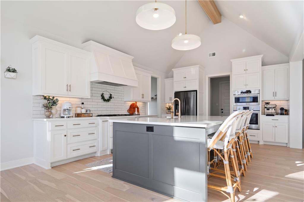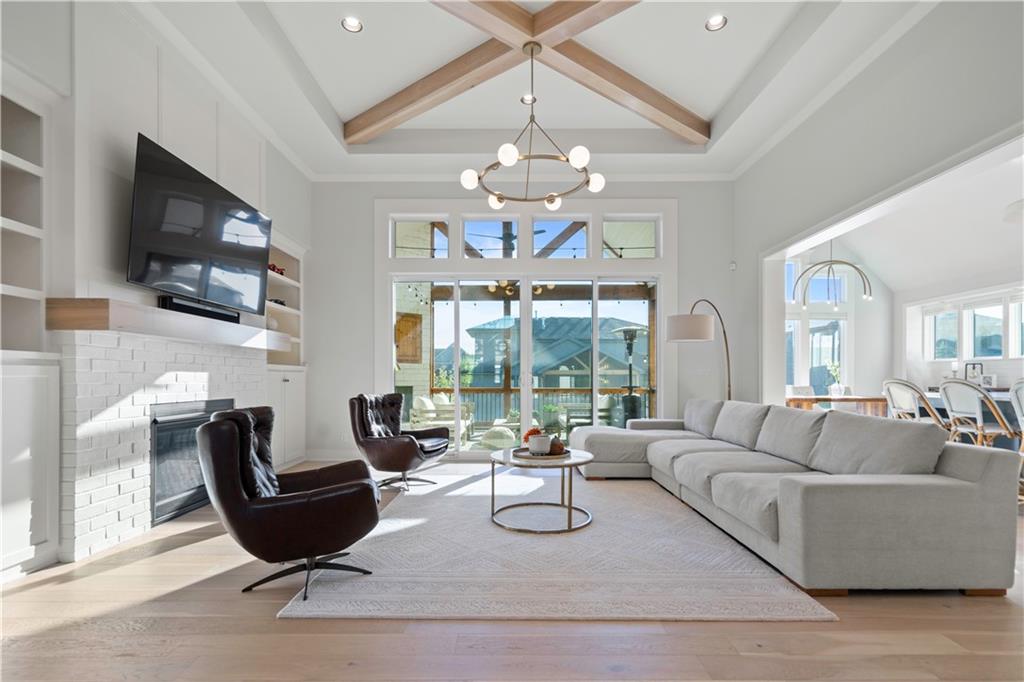 Discover refined living in this nearly 4,000 sq ft Reverse 1.5 Story located in the prestigious Estates of Century Farms. Less than three years old, this home blends elevated design with everyday comfort. Impressive vaulted ceilings and abundant natural light create a dramatic entry into the open kitchen and dining area, featuring quartz countertops, an oversized island, farmhouse sink, gas cooktop, walk-in pantry, and built-in pocket office. Designer touches throughout include designer lighting, remote-controlled blinds, EV charger, Smart garage opener, and more. Spacious screened-in deck with fireplace and TV mount, overlooking a mostly fenced .3 acre lot. The finished walkout lower level showcases LVT flooring, wet bar, pub area, TV accent wall, and access to a sunken stone patio—perfect for entertaining. The 5th bedroom with glass doors doubles as a movie room, fitness studio, or second office, while a kids’ play nook under the stairs adds charm and character. Exterior highlights include four-sided lap siding, real stone accents, wood details, and a 50-year roof. Enjoy resort-style neighborhood amenities just a short stroll away—pool with slide, clubhouse, fitness gym, pickleball and basketball courts, fire pit, playground, and community garden. Ideally located near Bluhawk, Heritage Park, and the Overland Park Arboretum, with easy access to the Johnson County Trail System. Served by award-winning Blue Valley Schools. Don’t miss this opportunity to call Century Farms your new home!