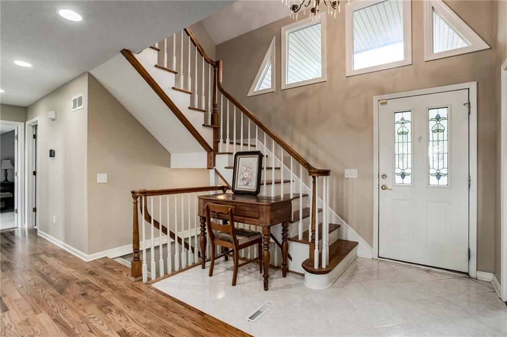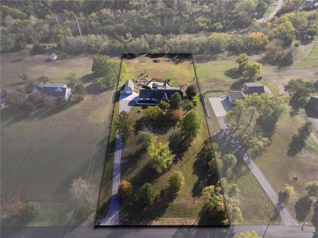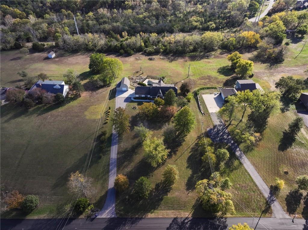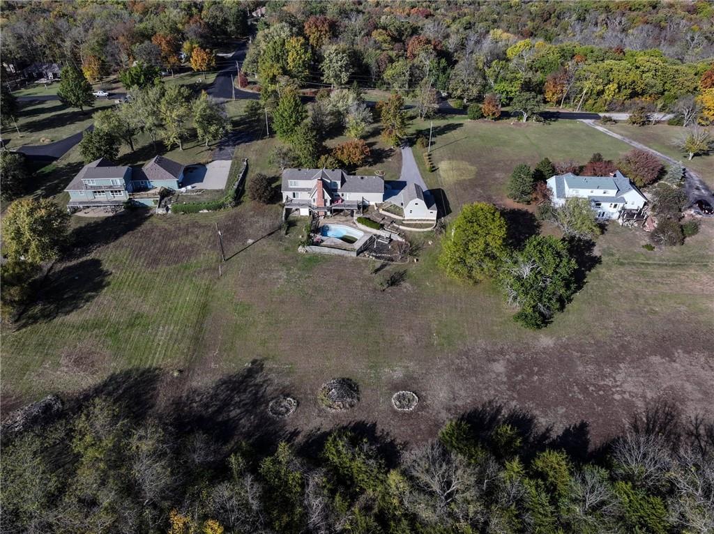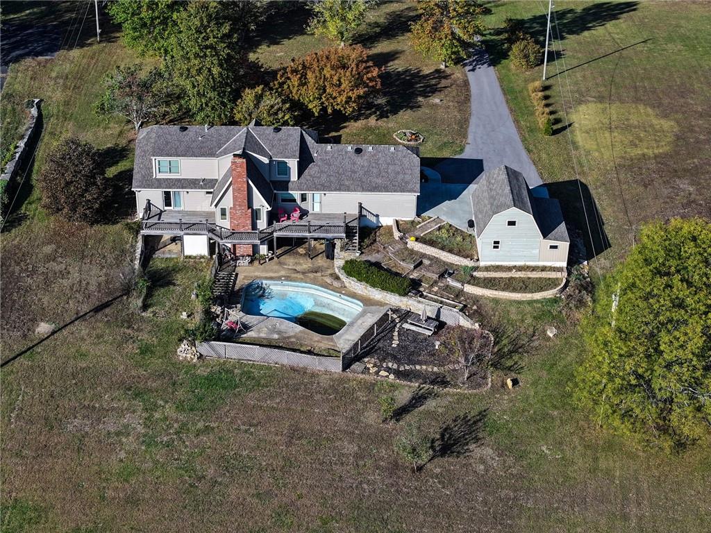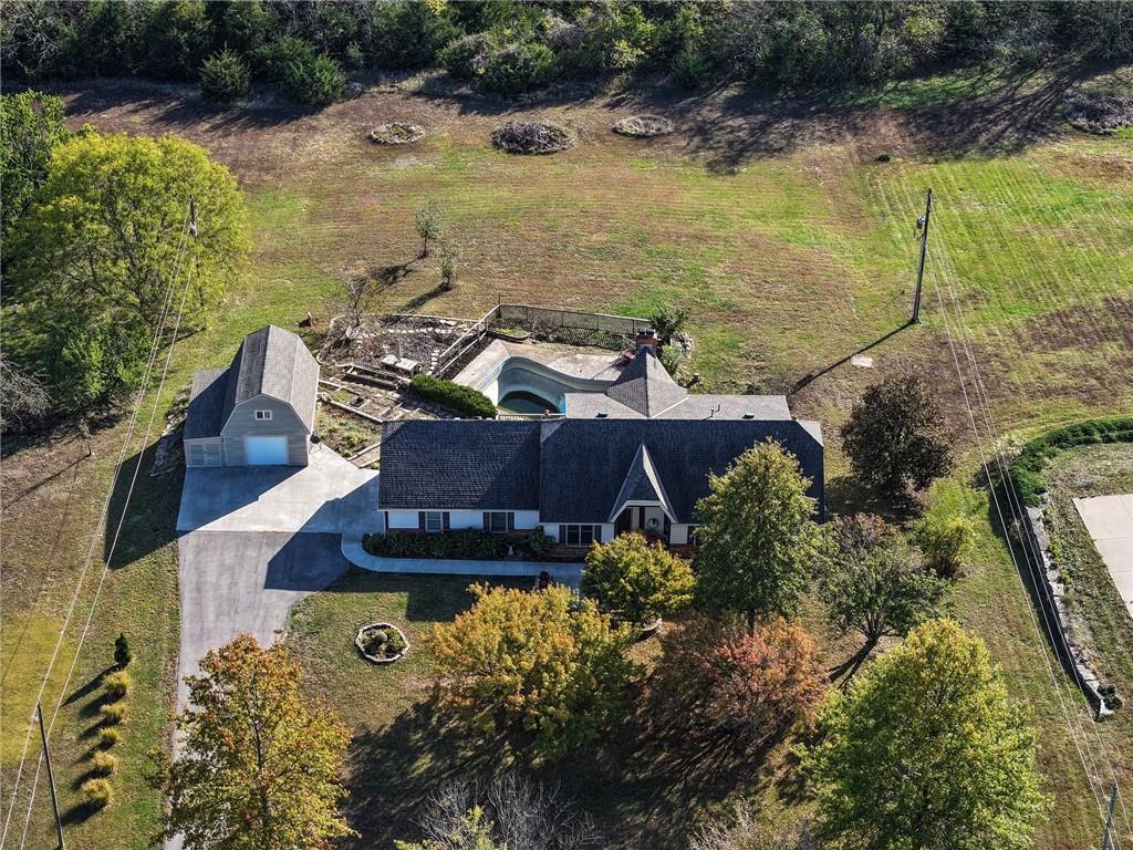 Discover the elegance of this breathtaking 1.41-acre estate, featuring a stunning reverse 1.5 story, 4-bedroom/ 3.5 bath home surrounded by serene nature views and luxurious indoor-outdoor living spaces. Detached Garage with shed / unfinished LOFT for additional living or storage space. Formal Dining. Great Room with fireplace; tall ceiling and windows shine in an abundance of natural lighting. The Kitchen showcases a bird's-eye view of the vast open acres beyond the tree tops. Around the corner you'll discover the pantry, a half bath and an oversized laundry/ mud room. MAIN LEVEL Primary Suite & Bath is complete with double sinks, walk-in shower, jacuzzi tub, and walk-in closets. Enjoy glorious sun rises and sunsets from your Primary Suite balcony. The UPPER LEVEL features a sitting room, a 2nd BEDROOM/BATH SUITE, the 4th spacious bedroom with walk-in closets, and access to 2 attic closets. You'll enjoy the full sized LOWER LEVEL with a bar/kitchenette, fireplace, storm shelter, full bathroom, office/workshop, storage, and walkout to covered porch and inground pool.
