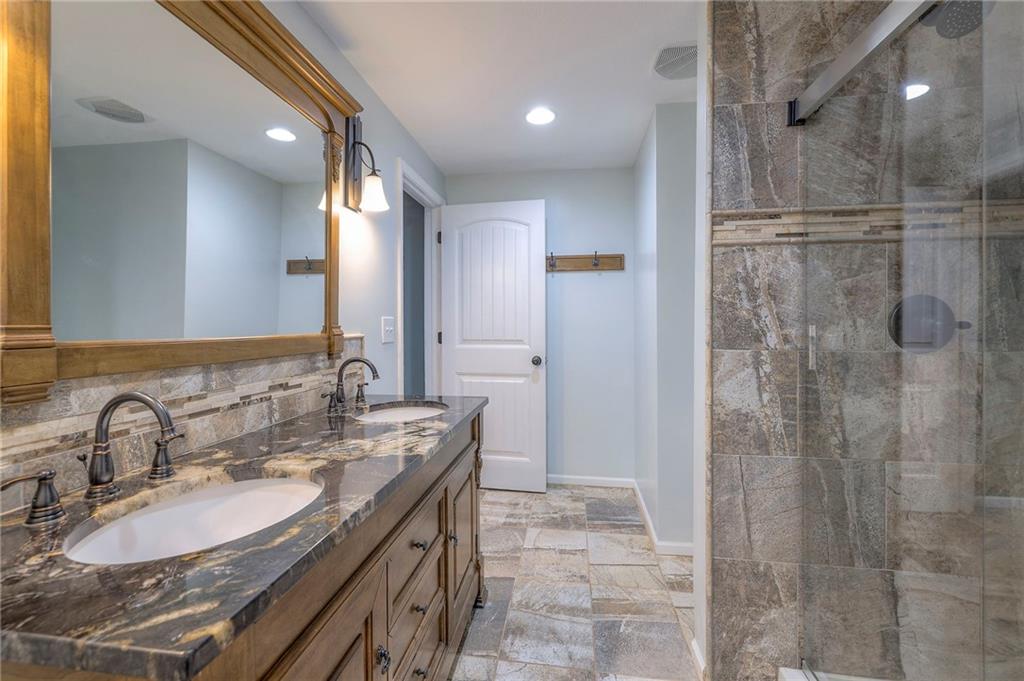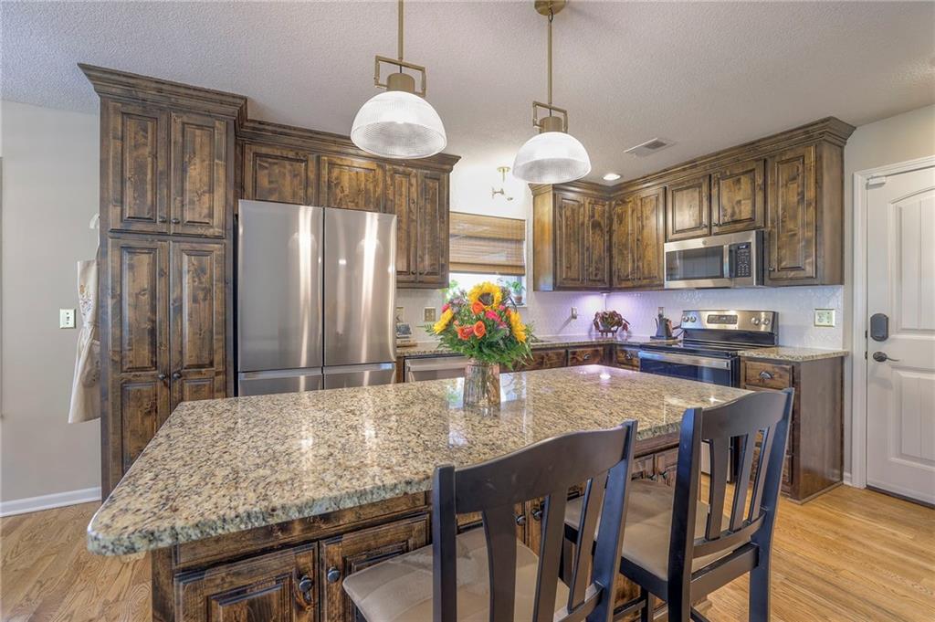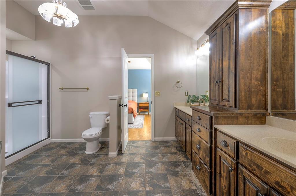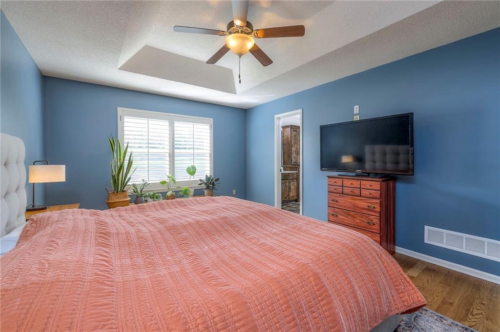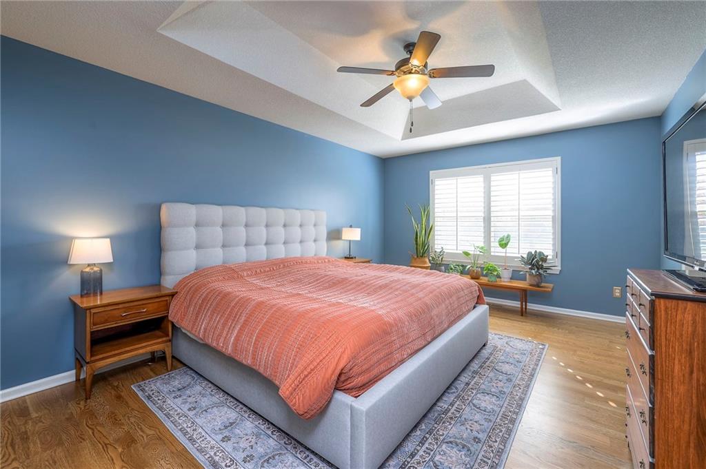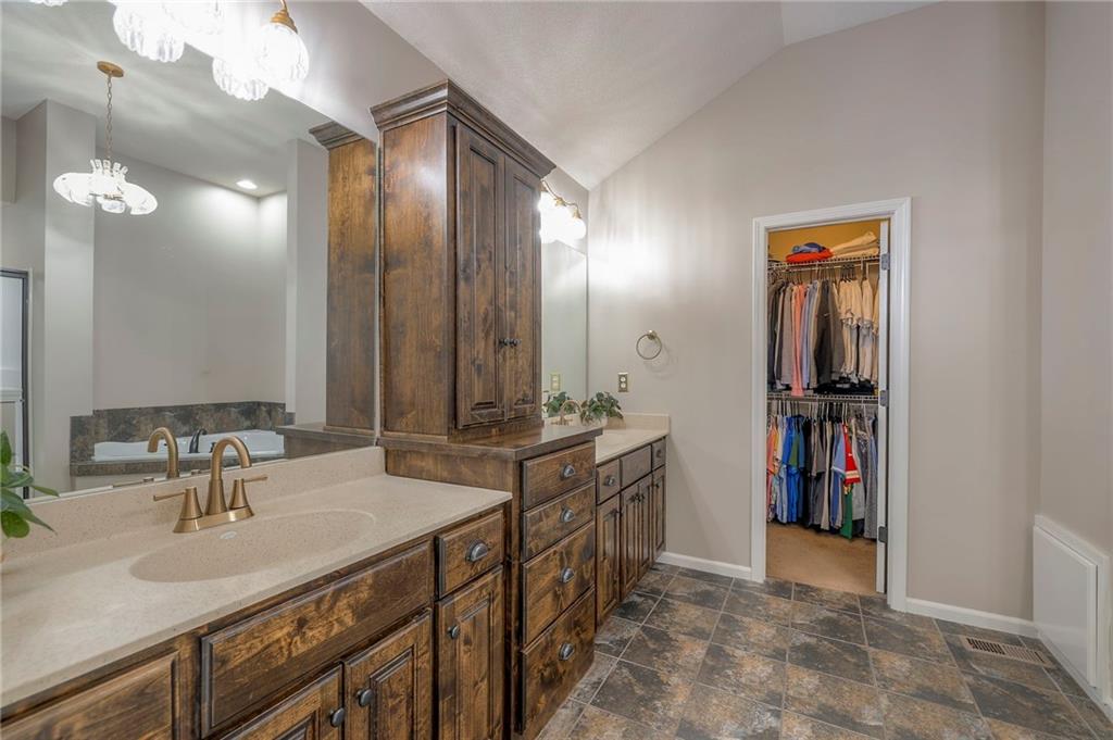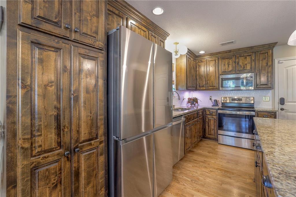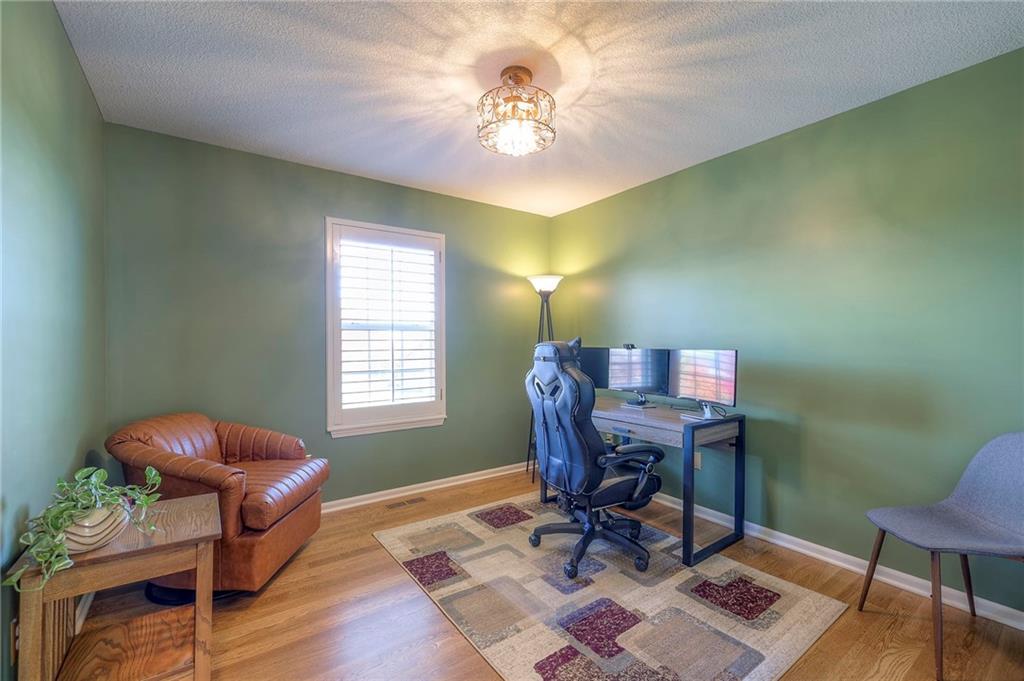 Lovely ranch home perfectly situated on an oversized .54-acre corner lot in Shawnee! Step inside to discover beautifully refinished hardwood floors throughout the main level, fresh interior paint, and new light fixtures that make the home feel bright and updated. The open layout seamlessly connects the living room, kitchen, and dining area for effortless everyday living. The living room features a vaulted ceiling, plantation shutters, a cozy fireplace, and wonderful natural light, creating a warm and peaceful space to relax. The kitchen is equally impressive, featuring granite countertops, stainless steel appliances, a large island, and ample pantry space—perfect for both cooking and entertaining. Step outside to a covered deck overlooking your large, fenced backyard, which backs onto a private, treed area. Whether you’re hosting gatherings or enjoying your morning coffee, this outdoor setting offers beauty and tranquility. The primary suite features a vaulted ceiling, a walk-in closet, and an en-suite bath with a double vanity, shower, and a large soaking tub. Two additional main-level bedrooms include hardwood floors and generous closet space. The finished basement expands your living space with a spacious rec room ideal for movie nights, watch parties, or game days. A fourth bedroom with a huge walk-in closet and updated full bath, plus a bonus office or workout room, offers even more flexibility. There’s also abundant storage or workshop space for all your extras. Laundry hookups are available on both the main level and in the basement for added convenience. The three-car garage features tall ceilings and ample space, even accommodating a full-size truck. Fantastic location close to Shawnee Mission Parkway amenities, City Center’s new development at 87th Street, and zoned for the De Soto School District, including Mill Valley High School. Enjoy the tree-filled scenery that makes this part of Shawnee so special. Make this beautifully updated ranch home yours