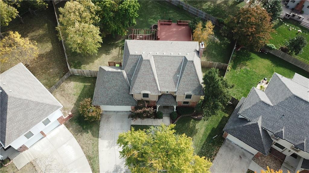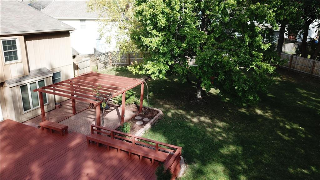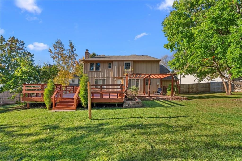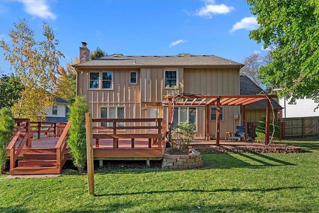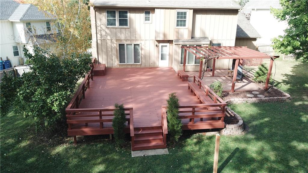 Gorgeous two-story, 4-bedroom home in the Shawnee Mission School District!! Step inside and fall in love with all this home has to offer. The open floor plan is perfect for many occasions. All wood floor and tile on the main floor. The front room is suitable for a living room or an office with ample space. Floor-to-ceiling windows adorn the back (south)of the home, offering ample natural light. The kitchen offers many cabinets, Storage Galore! Beautiful travertine backsplash, FRIDGE STAYS! Large family room with floor-to-ceiling windows, a convenient gas fireplace surrounded in stacked brick and built-ins with half-round windows and hardwood floors just feels like home. Upstairs, you have 4 great-sized bedrooms. The primary bedroom has a vaulted ceiling. The primary en suite has been tastefully updated, it's a MUST SEE. The primary closet just goes on forever, it has so much space, its a dream! Fully fenced (replaced in May 2024, security height) back yard with a giant deck, a brick patio and pergola (deck and pergola stained in October 2025). Private and beautifully landscaped. This yard is flat! Come take a walk for yourself. Fabulous cul-de-sac location is close to shopping(Oak PArk Mall, Target, etc) restaurants, and 435 and 69 highway access. This cul-de-sac has very little traffic! It's tucked away nicely. Come to our Open House and see the beauty that is 11731 w 99th Terrace!!