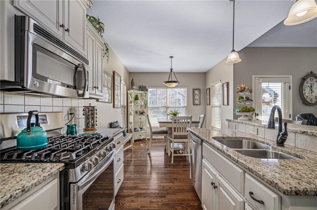 Welcome Home to Comfort, Style & Effortless Living! This stunning 3-bedroom, 2.5-bath Home delivers that “ahhh” feeling from the moment you walk in. You’ll instantly notice the vaulted ceilings, gleaming hardwood floors, and the cozy gas fireplace that anchors the living room—perfect for curling up with coffee or your favorite Kansas City Chiefs game. Step into the modern kitchen featuring granite countertops, a spacious island, and a sun-drenched dining area surrounded by windows—because every meal deserves a little natural light! The primary suite is your own private retreat, new carpet now with a redesigned spa-worthy bathroom showcasing a roomy glass-enclosed shower, soaking tub, elegant vanity area, and large walk-in closet for all your wardrobe wins. Downstairs, discover two more spacious bedrooms—each with its own walk-in closet—connected by a Jack & Jill bathroom with double vanities, ideal for guests or family. Enjoy peaceful neighborhood views and trails just outside your door. This Home blends low-maintenance living with high-style comfort, offering the perfect balance between convenience and luxury. Amenities are all the 4 pools, tennis courts, pickleball courts ,trails, and amenities of the Stonebridge Area! So go ahead—unpack, relax, and start loving where you live!