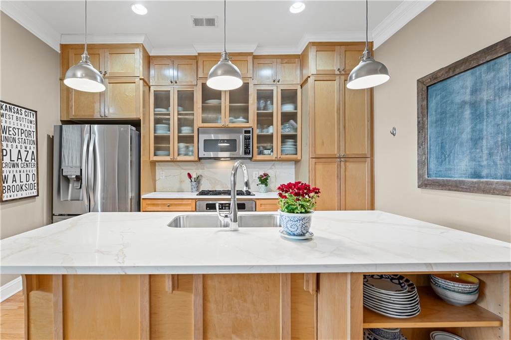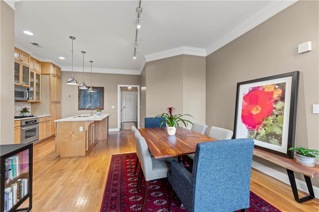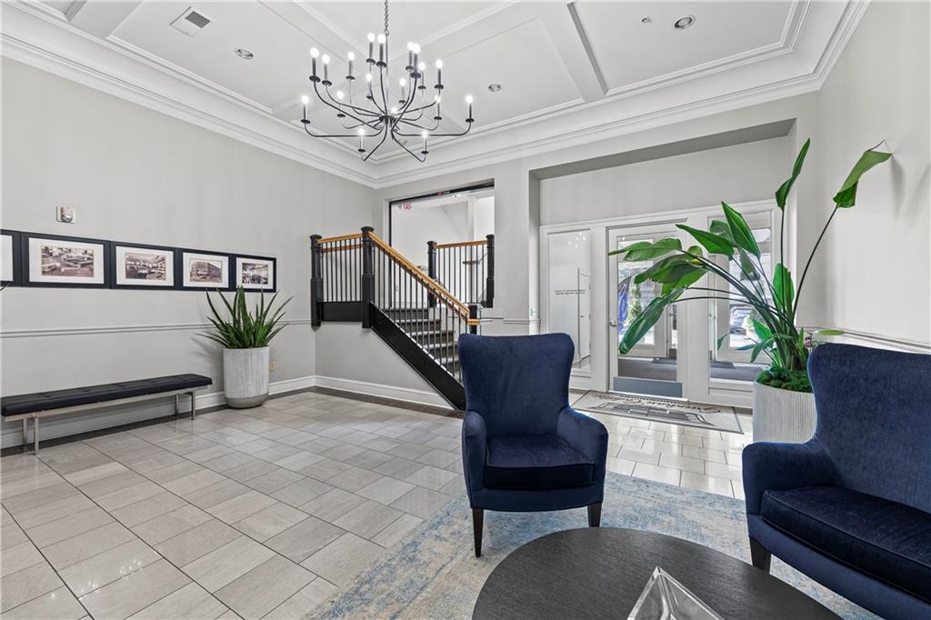 Experience elegant city living in this spacious condominium located in the historic Greenlease Cadillac building. The open floor plan is filled with natural light, creating a warm and inviting atmosphere throughout. The kitchen features a large island with seating, tall cabinets that extend to the ceiling for extra storage, and stainless-steel appliances that stay with the unit. The living room offers timeless character with its gas fireplace and opens to an private covered patio—perfect for relaxing, entertaining or gardening. A separate dining area provides additional space for gatherings. The spacious primary suite accommodates a sitting area and home office. The luxurious bath includes classic subway tile, a jetted tub, and a separate walk-in shower. The customized walk-in closet offers excellent storage and washer/dryer. The second bedroom, den, or office is conveniently located off the beautiful entry hall. Additional highlights include high ceilings, crown moldings, and hardwood floors throughout. Assigned garage parking included in the HOA. Enjoy the best of Union Hill—just steps from restaurants, coffee shops, bars, and shopping. The nearby streetcar provides easy and convenient transportation.