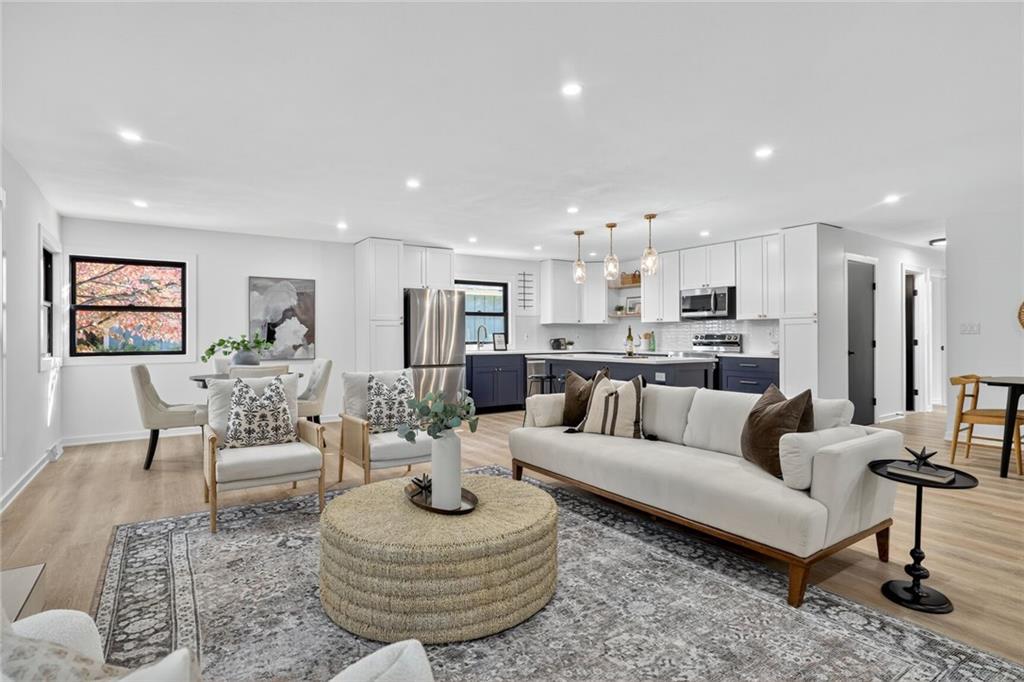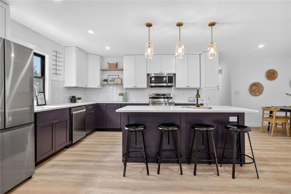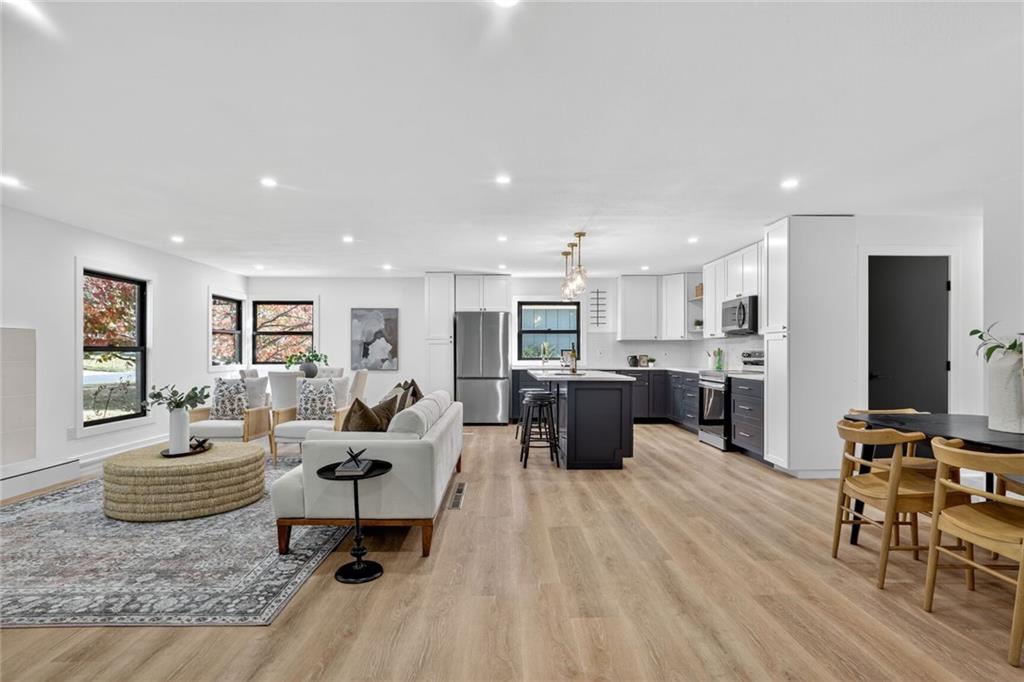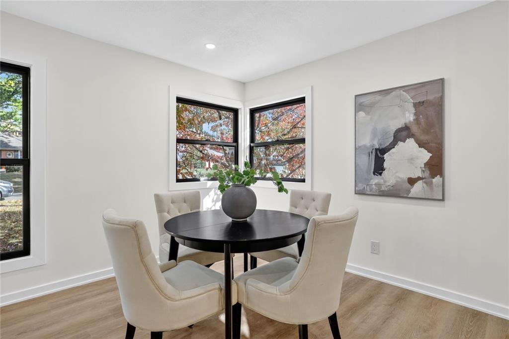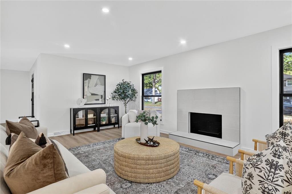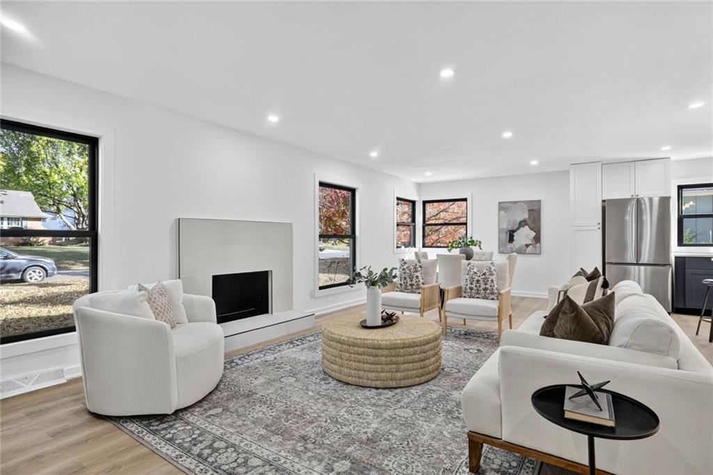 This is the one - Fully remodeled with nothing left to do but move in. Open concept Reverse 1.5 story in Round Hill. Shawnee Mission East School district. All new modern flooring throughout the home. Large Entertaining kitchen with Custom Cabinets, Huge Island, Stainless Steel appliances and new countertops. All three bathrooms have been remodeled with New Tile, cabinets and plumbing fixtures. Walkout basement features an additional two living areas, bedroom and bathroom. New Roof and Andersen Windows!