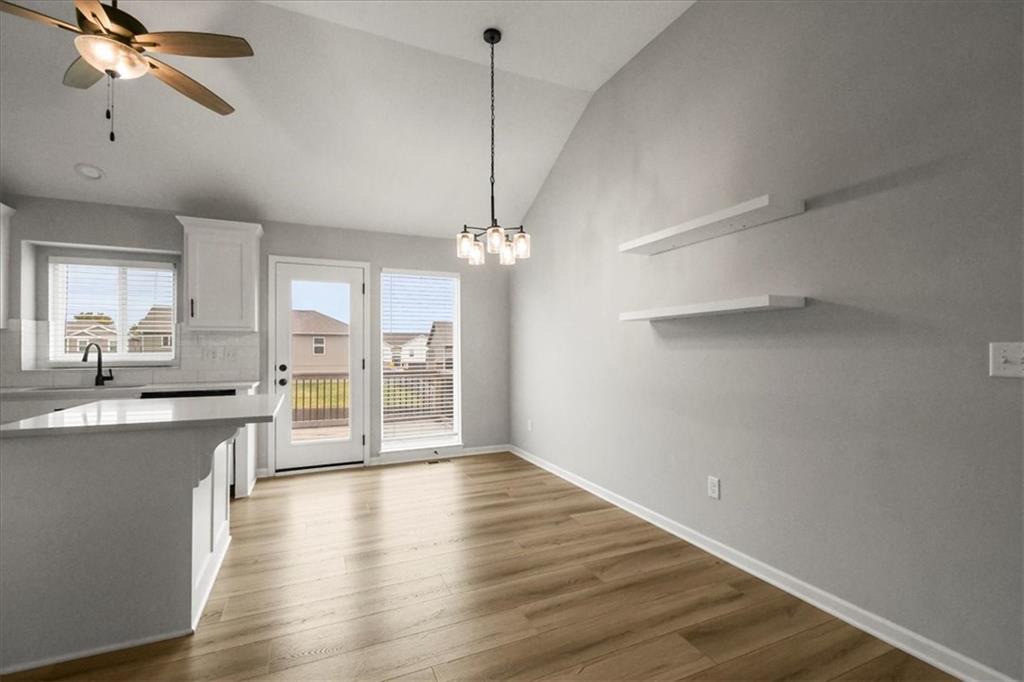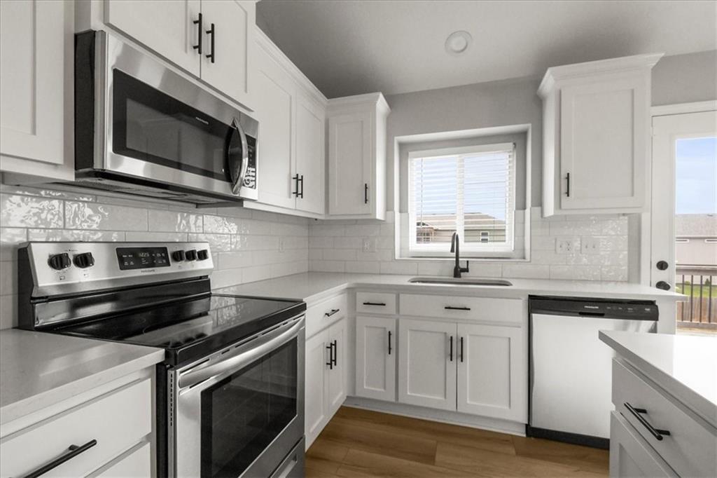 Prepare to fall in love with this almost-new construction, split-level home in the desirable North Creek community of Oak Grove! Designed with an inviting and calm aesthetic, this property perfectly blends modern features with cozy, livable spaces. It's ready for you to move in and start making memories! The architectural style creates a wonderful separation between living areas while maintaining an open, airy feel thanks to the vaulted ceilings and open-concept layout between the kitchen and living room. The gourmet kitchen is truly the heart of the home, featuring sparkling white cabinetry, a large center island with a crisp white quartz-style countertop, a full suite of stainless steel appliances, and a chic subway tile backsplash. The main living area is highlighted by a stunning, vaulted ceiling and a beautiful fireplace framed by white subway tile and a rustic wood mantle—perfect for gathering on chilly evenings. Your private primary suite is a luxurious retreat, featuring a tray ceiling and soft, neutral-toned carpet. The ensuite bathroom is a showstopper with a double-sink wood-toned vanity, contemporary light fixtures, and eye-catching patterned tile flooring. The attached walk-in closet offers smart organization with built-in shelving and ample hanging space. You'll appreciate the continuous, premium hard-surface flooring throughout the main floor living areas for easy maintenance and a cohesive look, complemented by sleek black hardware on cabinets and doors for a bold, contemporary contrast. The staircase, featuring modern black wrought iron balusters, connects the levels with style. The finished lower level provides excellent bonus space for a second family room, home office, or play area, complete with large windows for natural light. The exterior offers great curb appeal with charming gray-blue siding, white trim, a stone-accented front, and a two-car garage. This home is truly a special find—a perfect blend of style, comfort, and functionality.